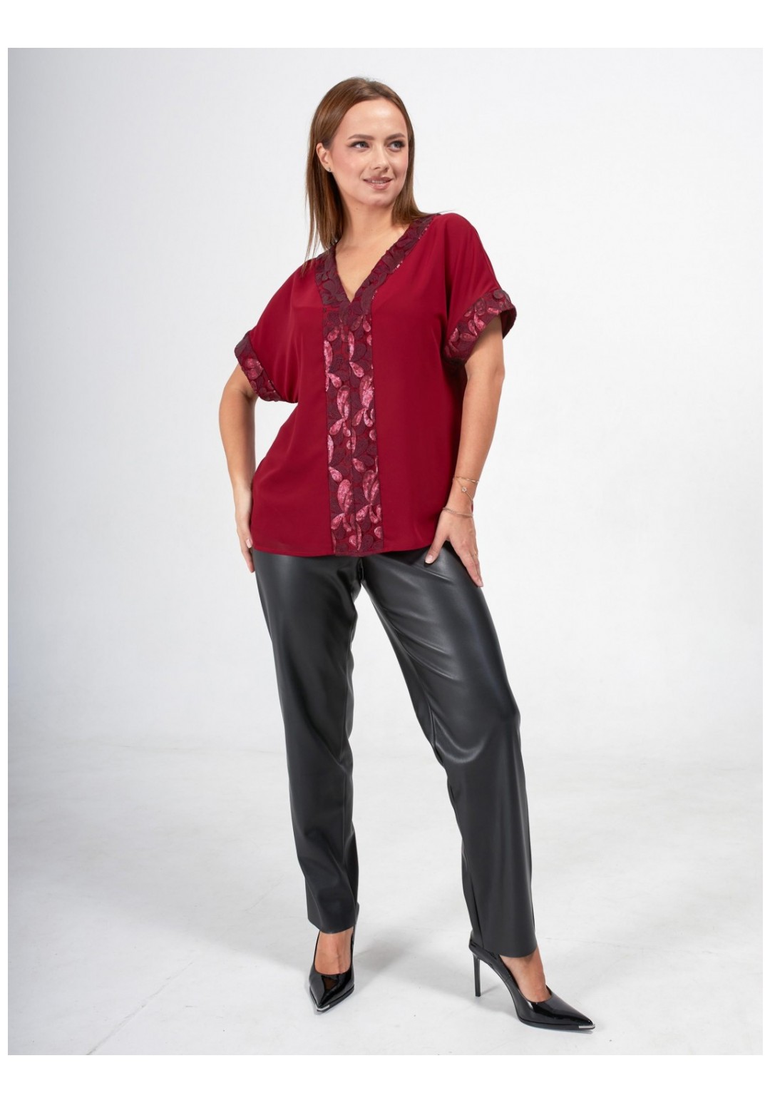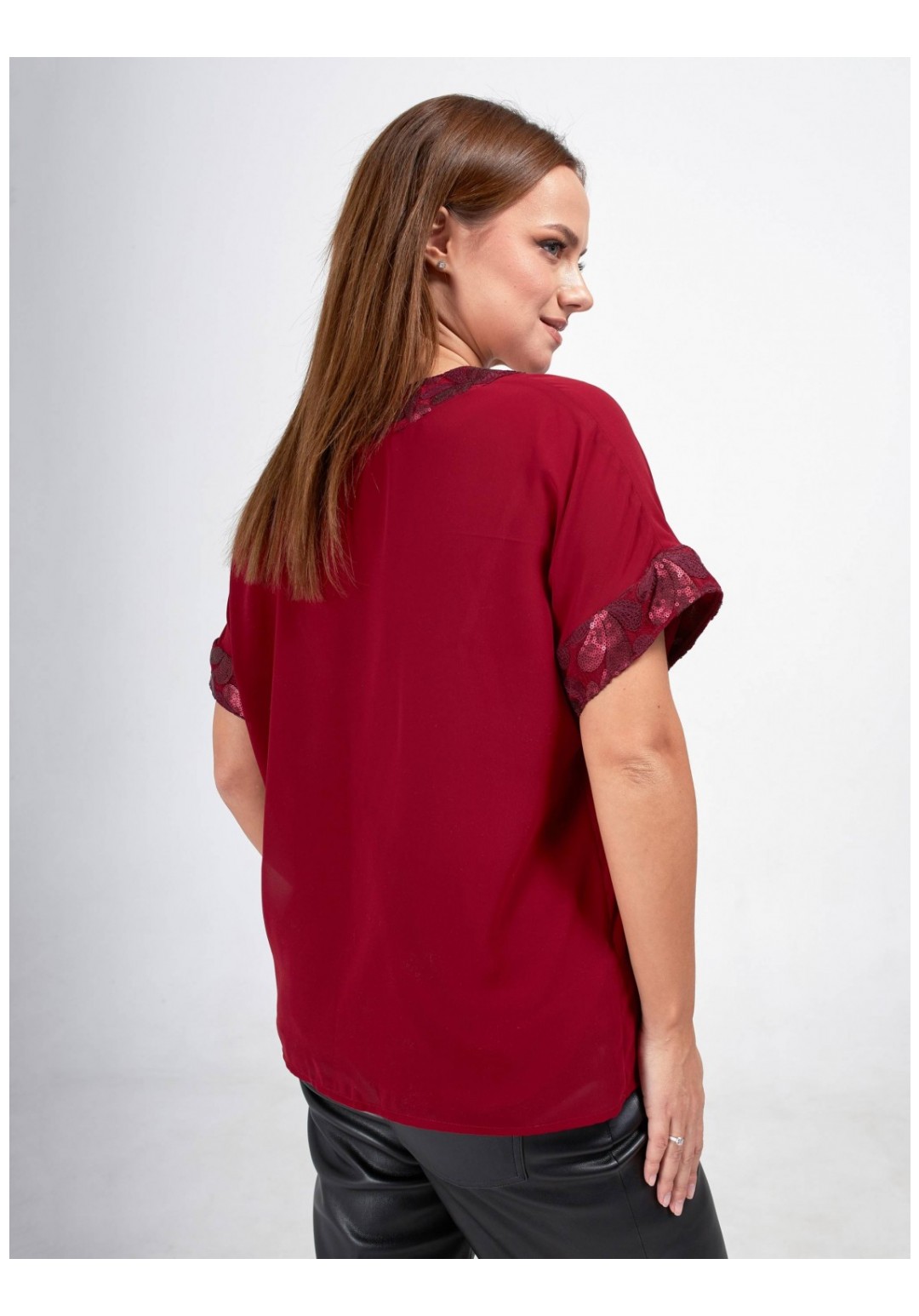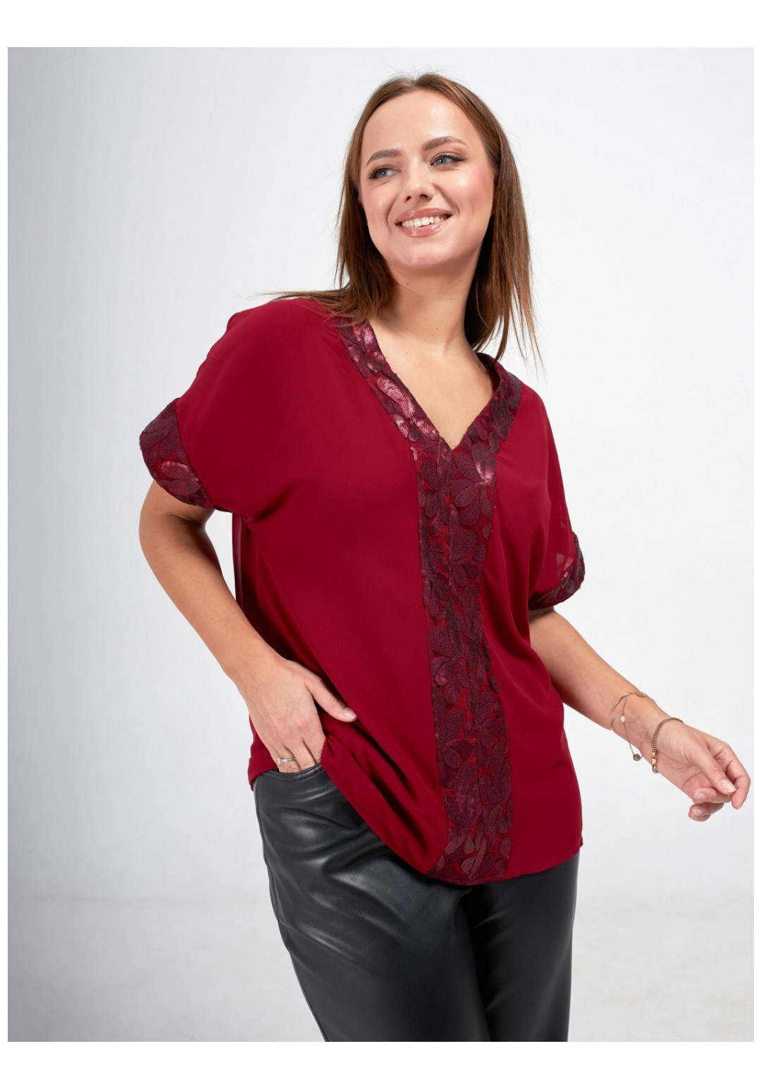 Стильная блузка больших размеров станет прекрасным дополнением вашего гардероба! Эта элегантная блузка выполнена из двухслойного шифона, что придаёт ей легкость и воздушность. Свободный крой обеспечивает комфорт и свободу движений. Короткий рукав придает блузке легкость и удобство. Особое внимание привлекает отделка из изысканного кружева с пайетками, которая добавляет блеска и утонченности. Эта блузка легко комбинируется с различными стилями одежды, будь то повседневный или более нарядный образ. Создайте свой уникальный стиль с этой великолепной блузкой, которая подчеркнёт вашу индивидуальность и сделает вас центром внимания!