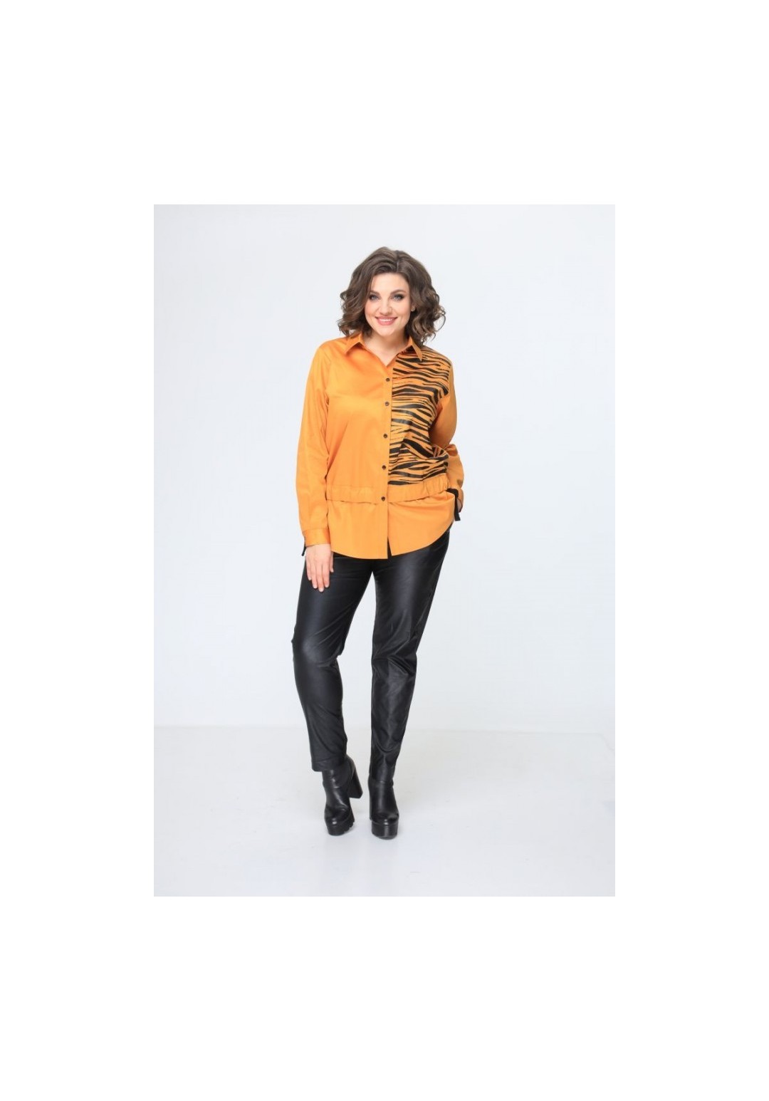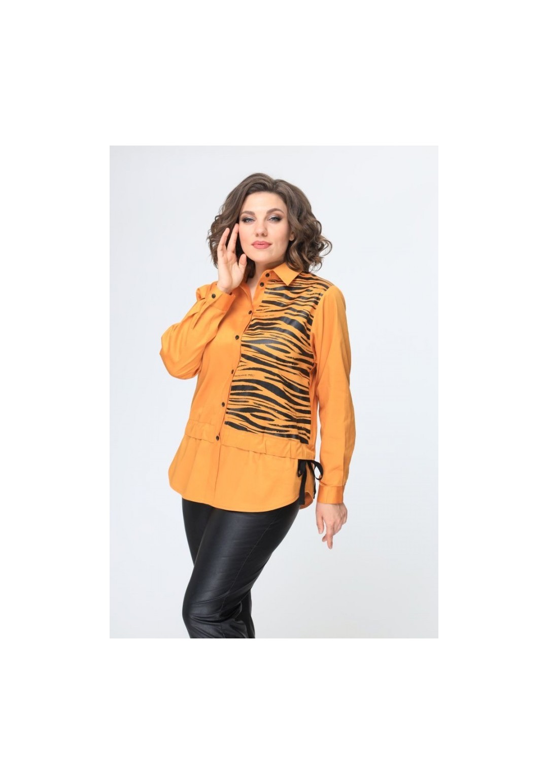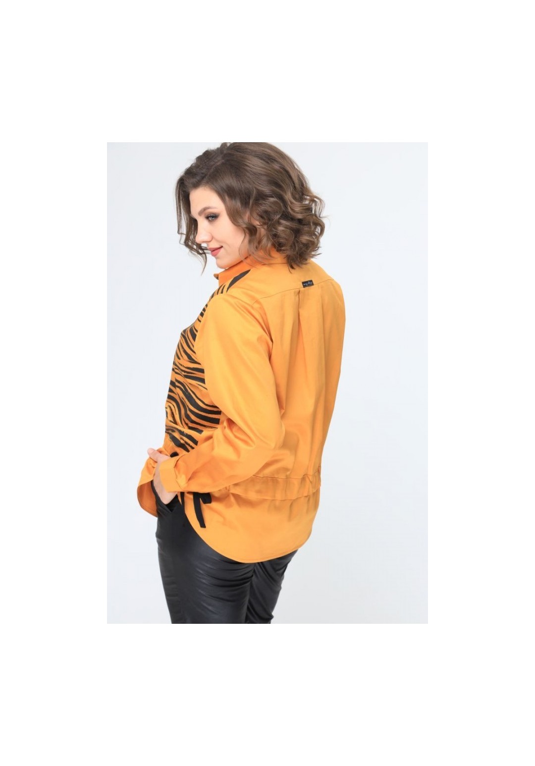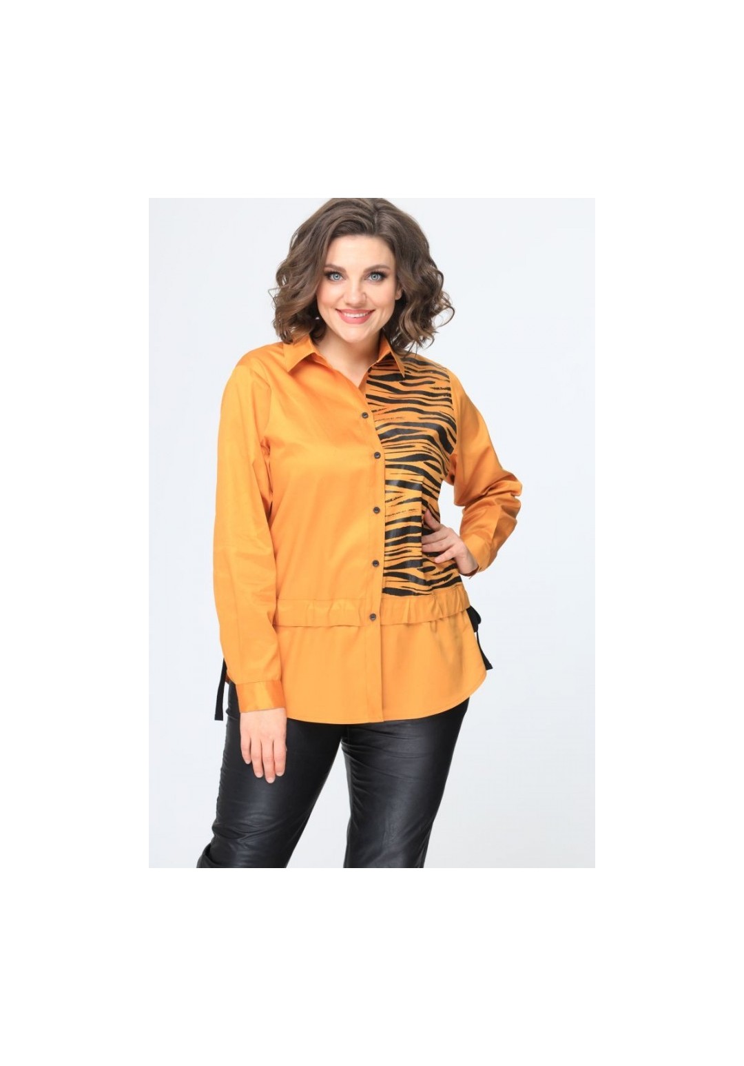 Невероятная притягательная новая рубашка по последним веяниям моды. Удивляйте! Классическая, свободного прямого силуэта, с фигурным низом по бокам, с эффектными элементами декора, выполнена из хлопковой ткани с эластаном. Воротник рубашечного типа на притачной стойке, по переду центральная застежка на петли-пуговицы. Линия плеча слегка приспущена, рукав втачной длинный, по низу заложены мягкие складки и притачной манжет с застежкой на петлю-пуговицу. На левой полочке накладной карман с декоративным принтом, нижняя часть кармана отлетная. Спинка в верхней части с отрезной кокеткой и декоративным элементом в виде пришивного шеврона, по центру расположена мягкая встречная складка. Ещё один акцент данной модели - притачная деталь в виде кулисы чуть ниже талии, которая фиксируется втянутой тесьмой по бокам, что позволяет носить вещь свободно, либо немного затянув можно придать определённый силуэт. Удобная, комфортная и очень эффектная рубашка на все случаи: всегда стильно и модно!