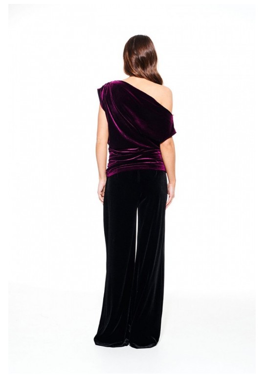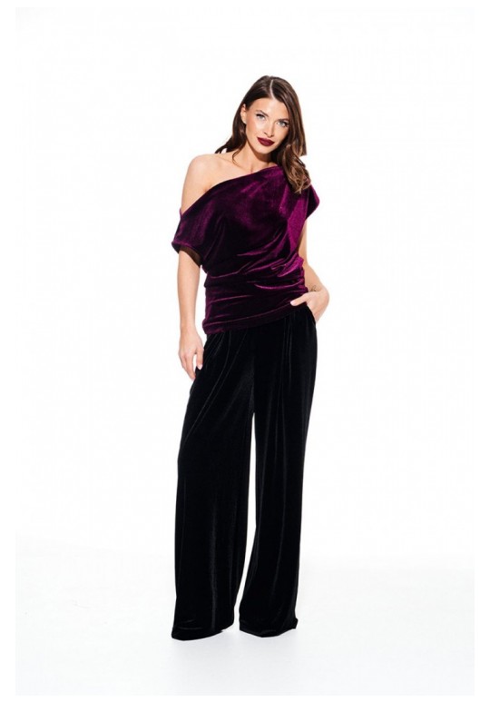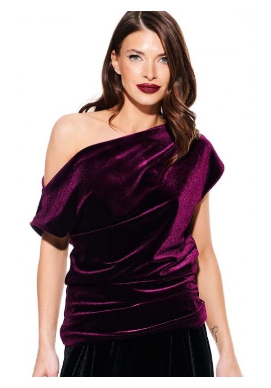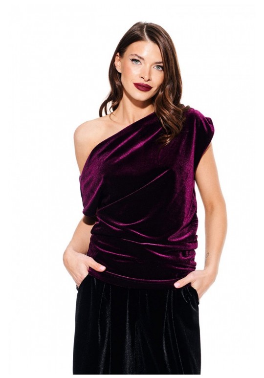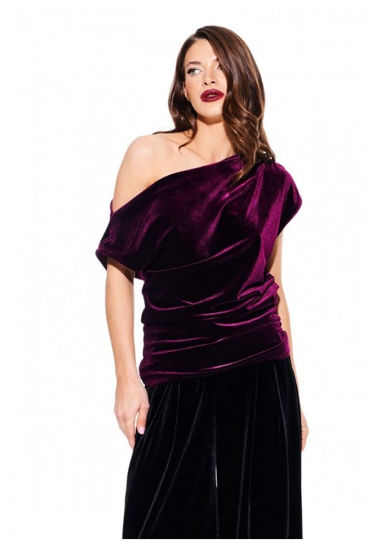 Блуза из бархата на трикотажной основе, умеренного объема, полуприлегающего силуэта с акцентом на одно плечо, с фигурной драпировкой на уровне груди. Вырез горловины в форме лодочки. Левый плечевой и боковой шов оформлены сборкой. Длина до линии бедер.