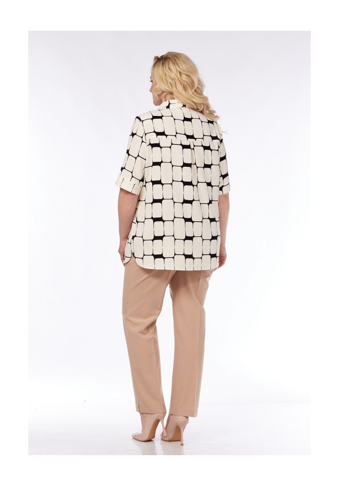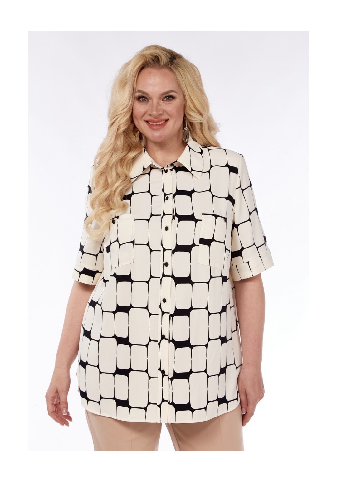 Универсальная базовая блузка прямого силуэта. По переду вытачки нагрудные, накладные карманы, застежка в виде планки на петли пуговицы. Воротник стояче-отложной. По спинке отложная кокетка. Рукав втачной короткий, низ обработан притачной манжетой. В боковых швах предусмотрены фигурные разрезы по низу изделия.