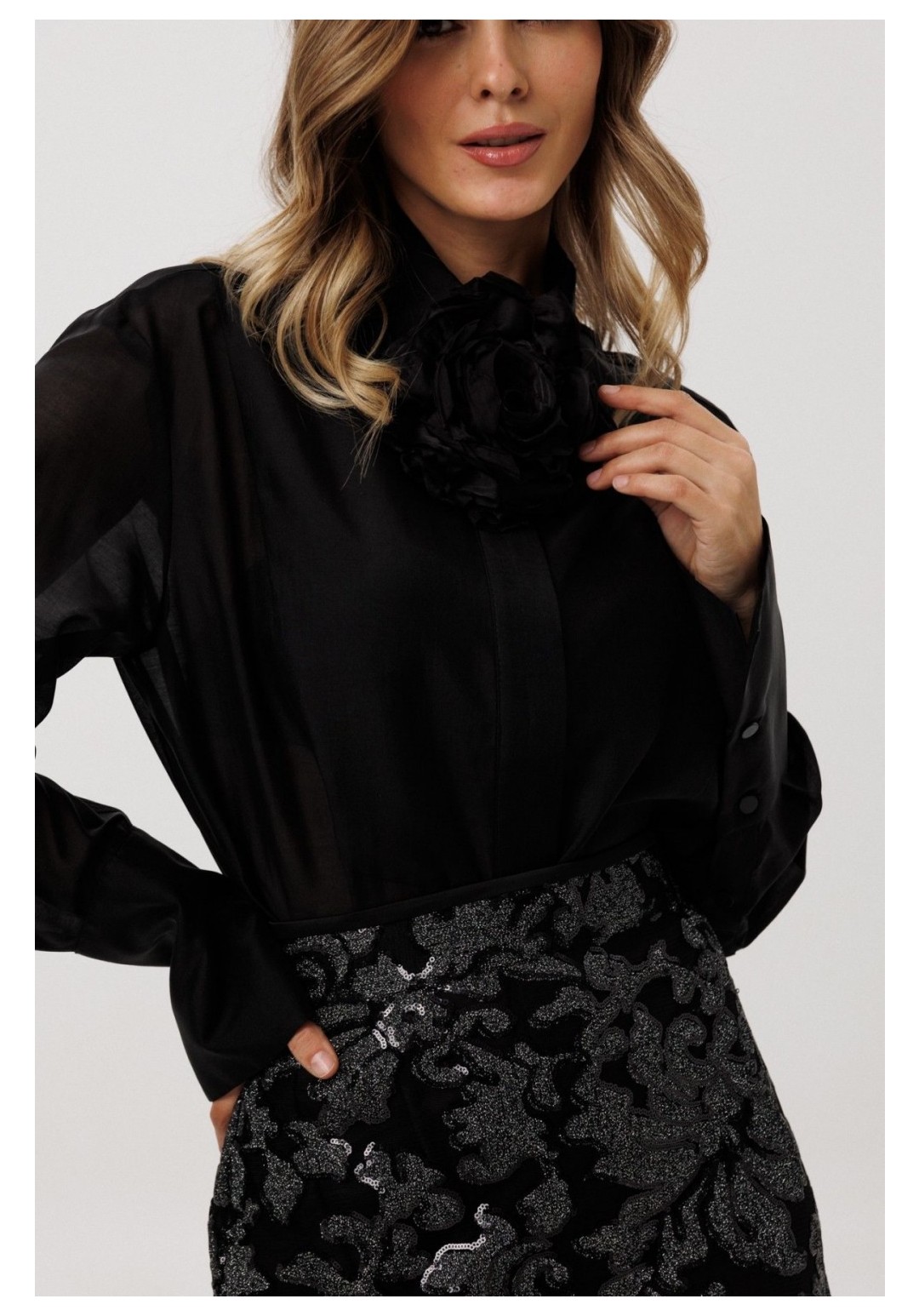 Блузка выполнена из блузочной ткани. Блузка прямого силуэта, длиной ниже линии бедер. Спереди фигурная кокетка и застежка на потайную планку. Спинка цельная. Воротник стояче-отложной. Плечевой шов удлинен. Рукав рубашечного покроя, одношовный. Низ рукава на притачной манжете. Низ блузки фигурной формы. Брошь-цветок в комплект НЕ ВХОДИТ! Длина блузки: р. 44-48 - 79 см, р. 50-54 - 80,5 см. Длина рукава: р. 44-48 - 76 см, р. 50-54 - 77 см.
