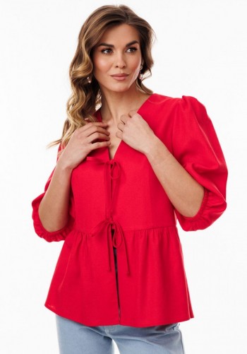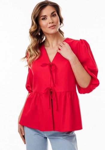 Блузка из жаккардовой тонкой плательно-блузочной ткани. Блузка прямого силуэта, длиной до линии бедер. По переду обработаны нагрудные вытачки и центральная застежка встык с планками на пять навесных петель и пуговиц. Спинка цельная. Горловина округлой формы, обработана воротником-стойкой. Рукав рубашечного покроя, одношовный, расширенный к низу. Низ рукава и низ блузки обработаны широкими обтачками. Блузка декорирована по верху полочек кружевом в цвет основной ткани. Длина блузки: р. 44-48 - 64 см, р. 50-54 - 65,5 см. Длина рукава: р.44-48 - 77см, р.50-54 - 78,5 см.