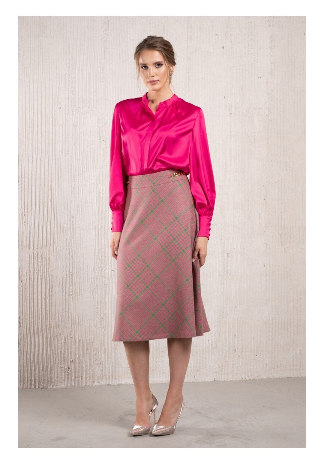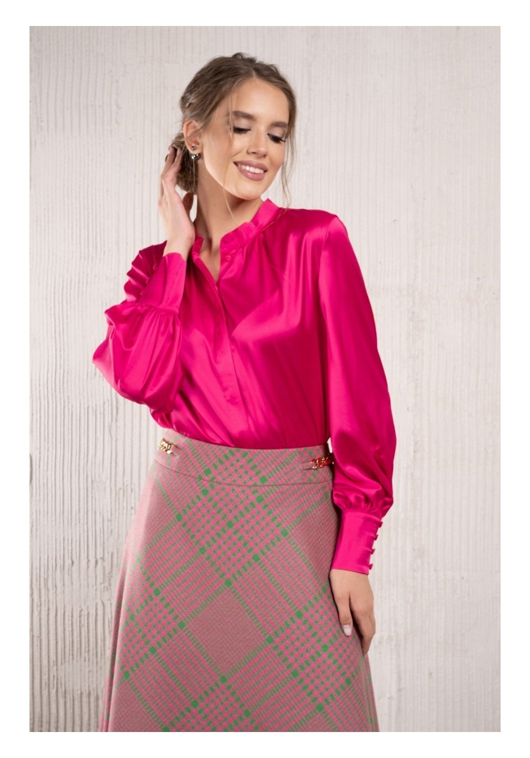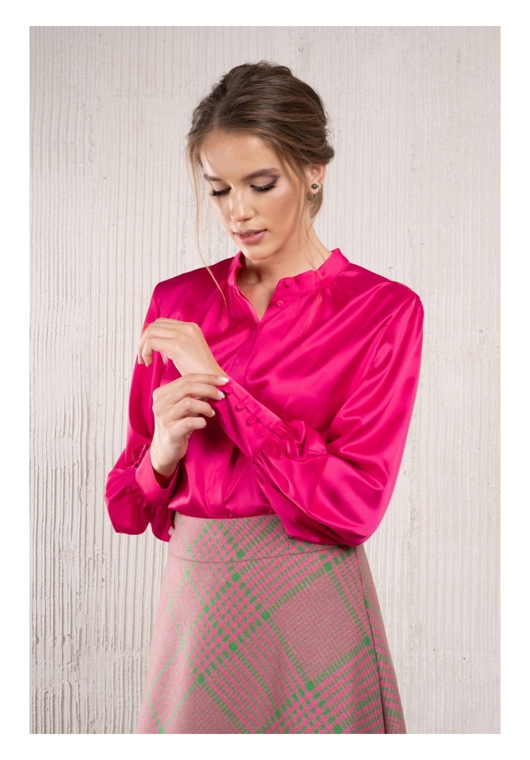 Блуза свободного кроя из легкого атласа с матовым блеском. Застежка на пуговицы спереди. Рукав втачной, низ обработан манжетой, застегивающейся на пуговицы. Длина изделия по спинке 61 см, длина рукава 63 см.