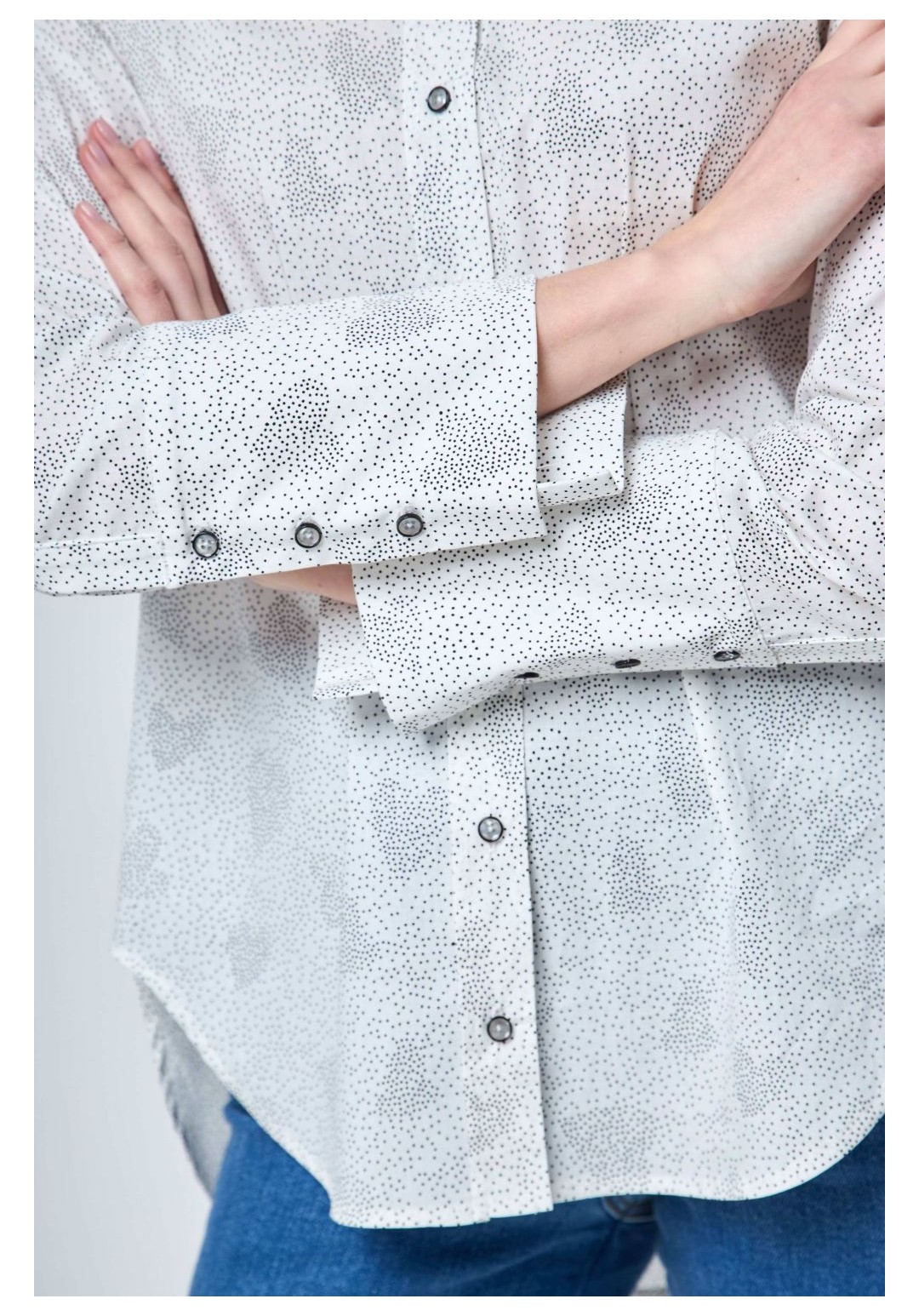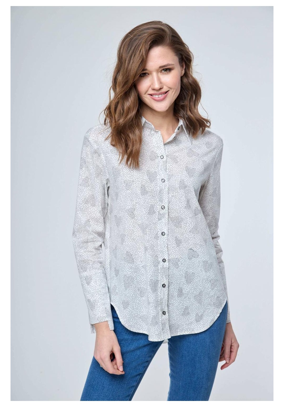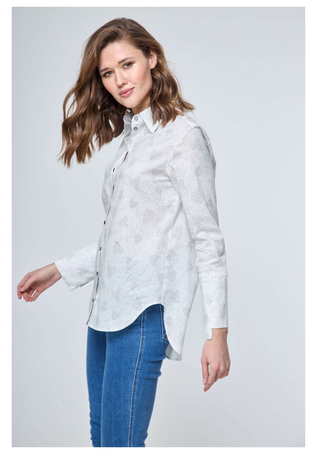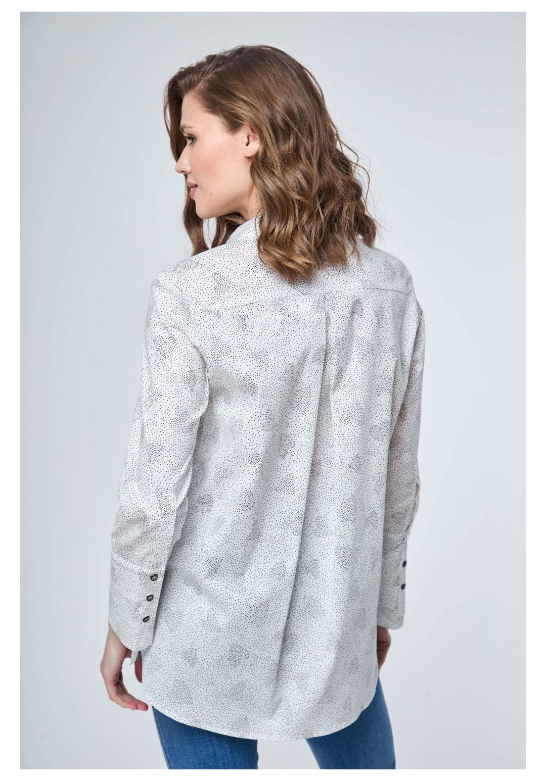 Рубашка прямого силуэта с застежкой на петли и пуговицы и втачным покроем рукава. Перед рубашки без особенностей. Спинка с отрезной кокеткой и бантовой складкой от подреза кокетки. Рукав втачной одношовный с разрезом и манжетой. Разрез рукава обработан планкой. Манжета застегивается на три прорезных петли и три пуговицы. Воротник рубашечного типа с отрезной стойкой. Перед короче спинки по центру на 5,0см. Длина рукава 58,0см. Длина спинки по центру от воротника 74 см. Состав ткани: хлопок 100% Рост: 164-170 Рекомендуемые размеры: 42,44,46,48,50,52,54