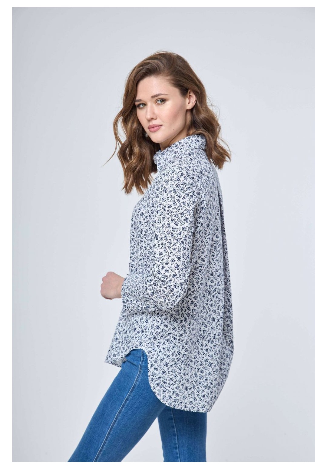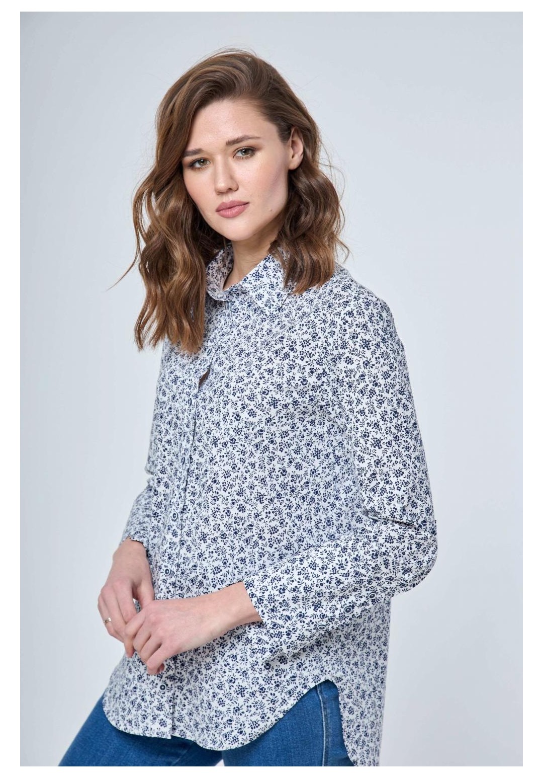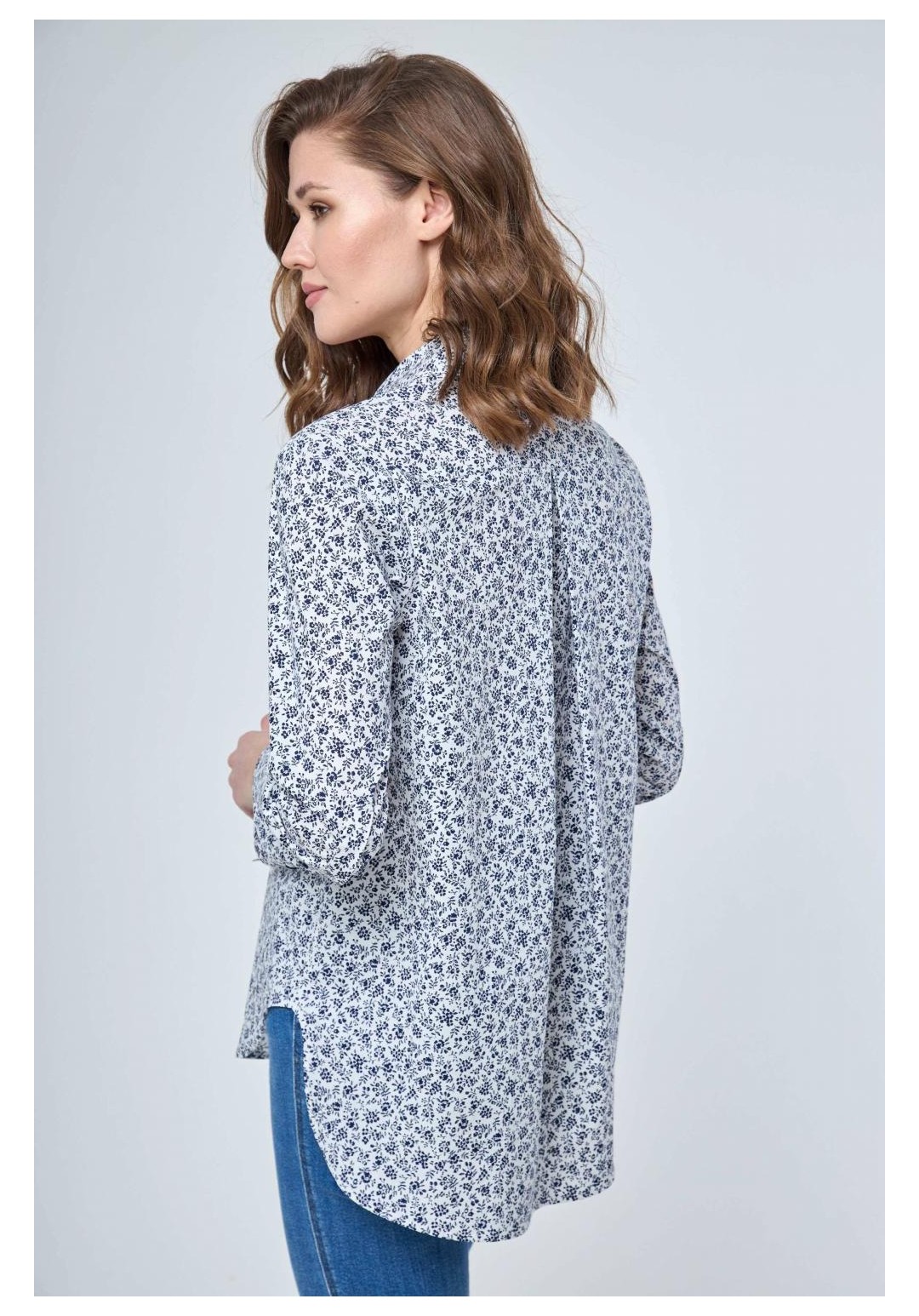 Рубашка прямого силуэта с застежкой на петли и пуговицы и втачным покроем рукава. Перед рубашки без особенностей. Спинка с отрезной кокеткой и бантовой складкой от подреза кокетки. Рукав втачной одношовный с разрезом и манжетой. Разрез рукава обработан планкой. Манжета застегивается на три прорезных петли и три пуговицы. Воротник рубашечного типа с отрезной стойкой. Перед короче спинки по центру на 5,0см. Длина рукава 58,0см. Длина спинки по центру от воротника 74 см. Состав ткани: хлопок 100% Рост: 164-170 Рекомендуемые размеры: 42,44,46,48,50,52,54