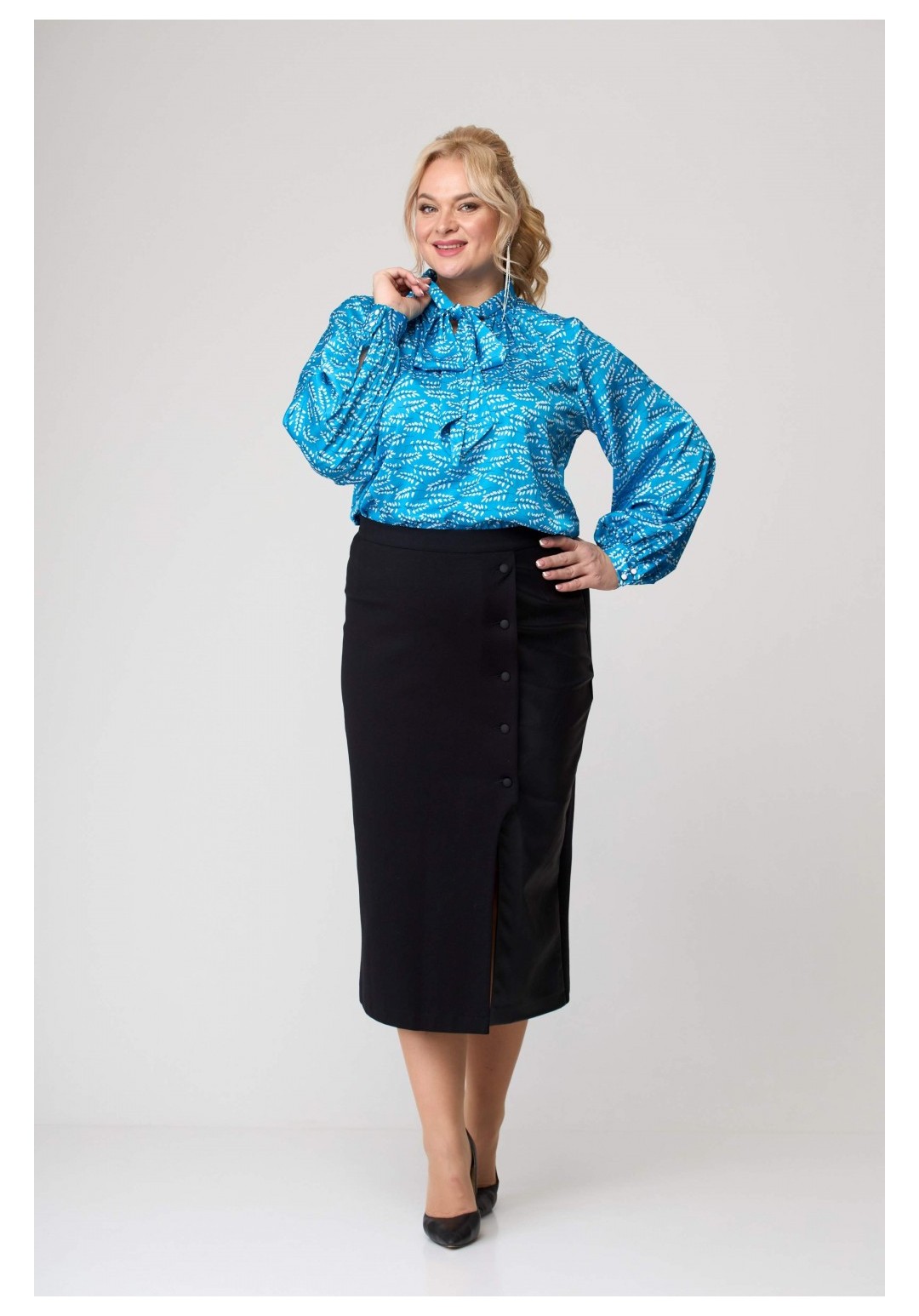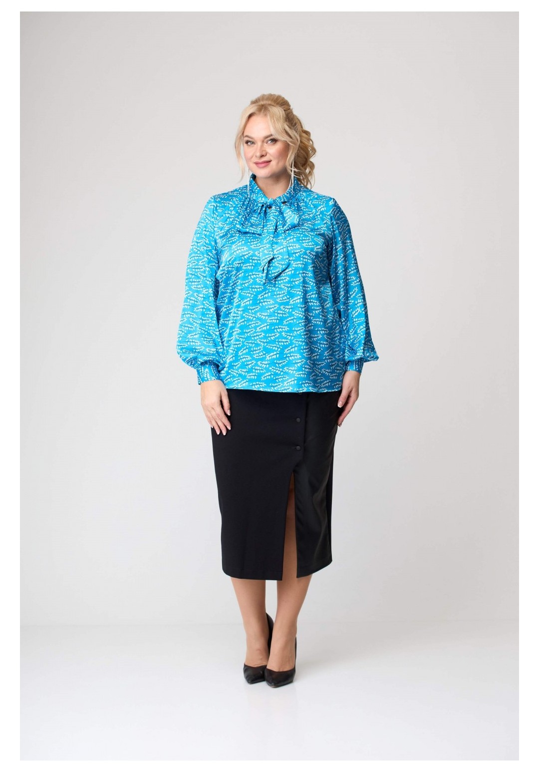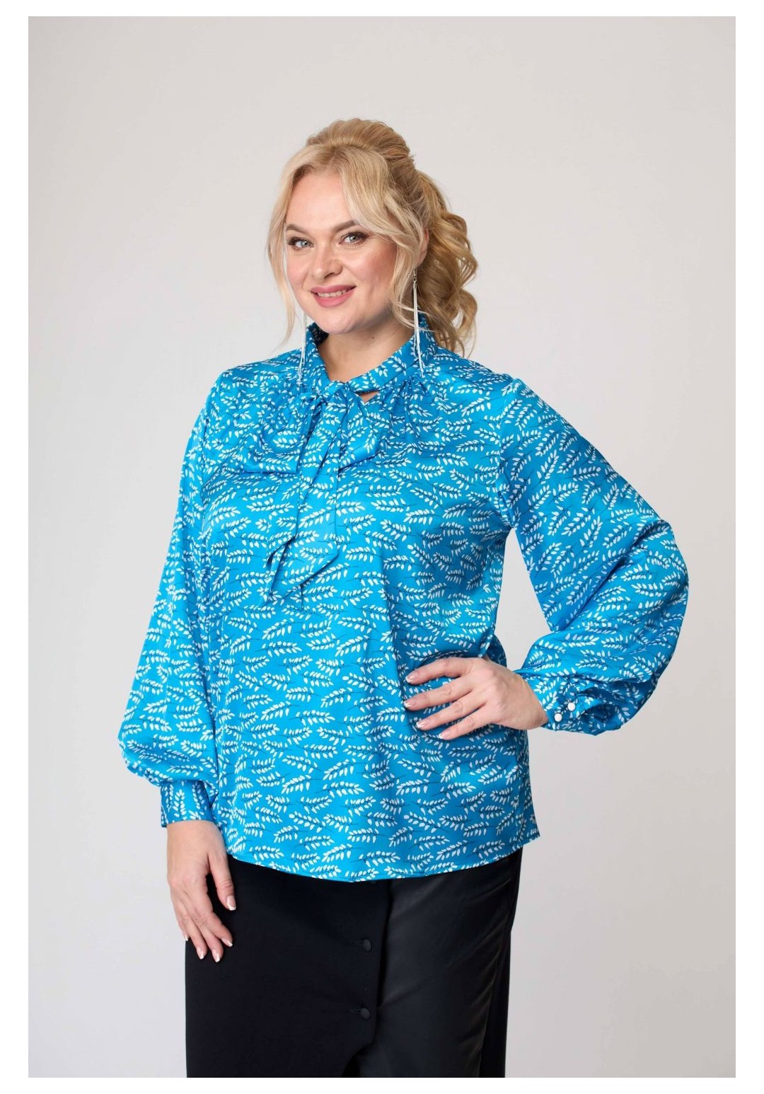 Блузка женская . Перед и спинка без конструктивных особенностей. Горловина переда V-образной формы. Рукав втачной одношовный, собранный по низу. Низ рукава заканчивается притачной манжетой с двумя прорезными петлями и двумя пуговицами. Горловина блузки со стойкой, которая переходит в шикарный завязывающийся бант. Низ блузки обработан швом вподгибку с закрытым срезом Рекомендуемые роста 164, 170 Рекомендуемые размеры 42,44,46,48,50,52,54