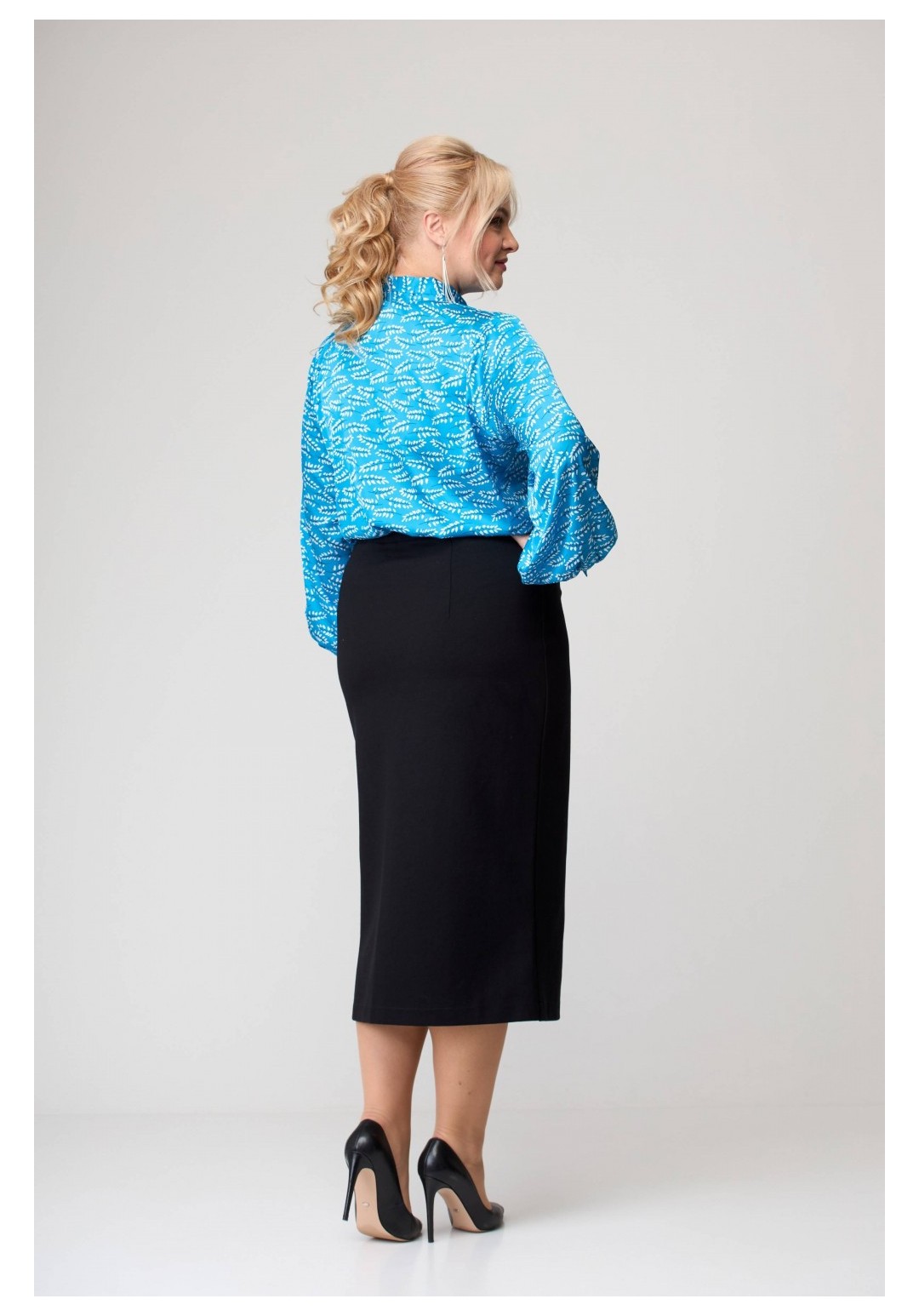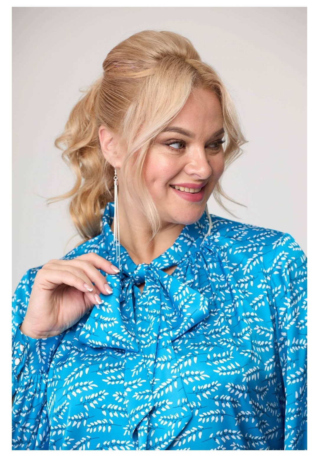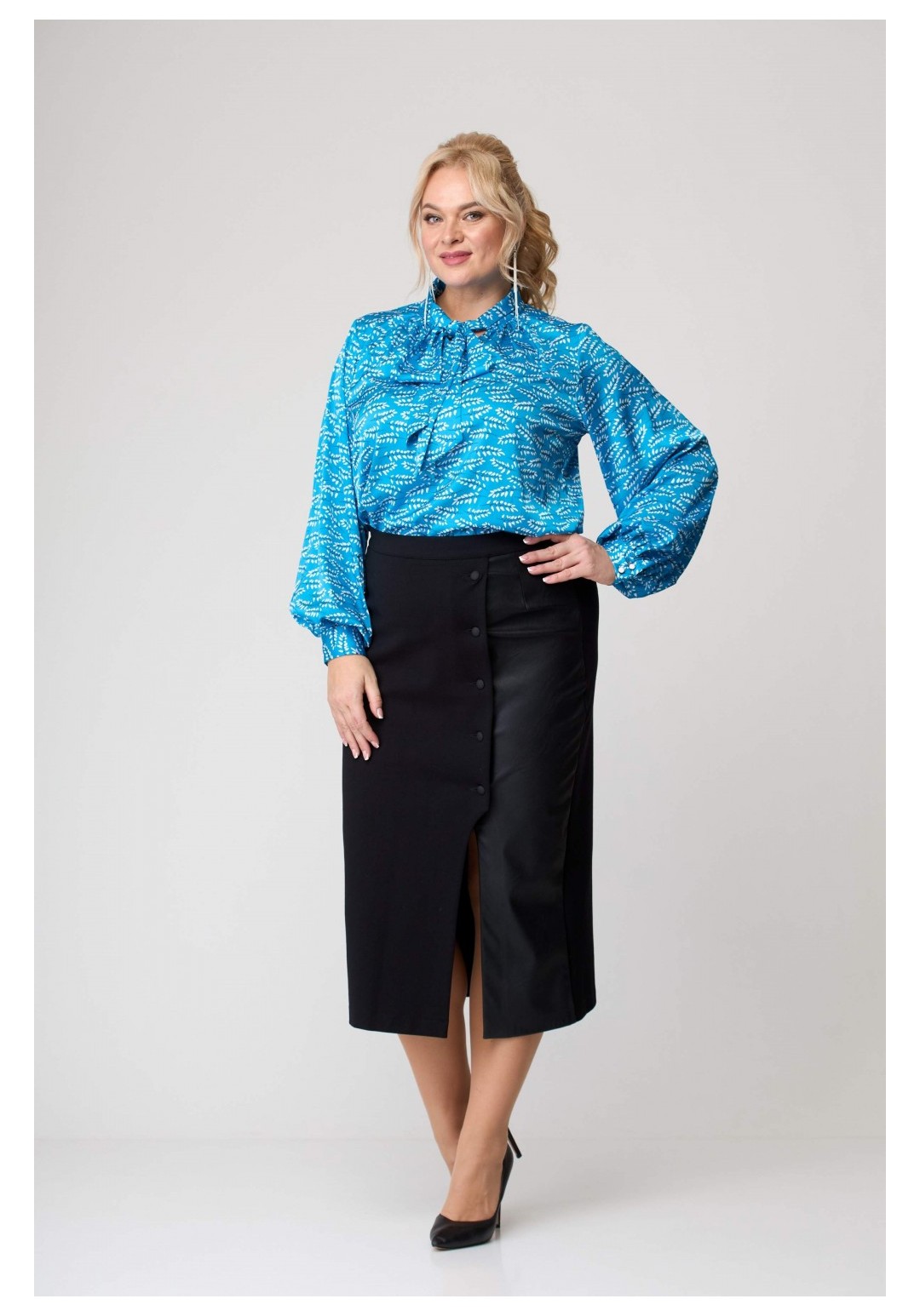 Блузка женская . Перед и спинка без конструктивных особенностей. Горловина переда V-образной формы. Рукав втачной одношовный, собранный по низу. Низ рукава заканчивается притачной манжетой с двумя прорезными петлями и двумя пуговицами. Горловина блузки со стойкой, которая переходит в шикарный завязывающийся бант. Низ блузки обработан швом вподгибку с закрытым срезом Рекомендуемые роста 164, 170 Рекомендуемые размеры 42,44,46,48,50,52,54