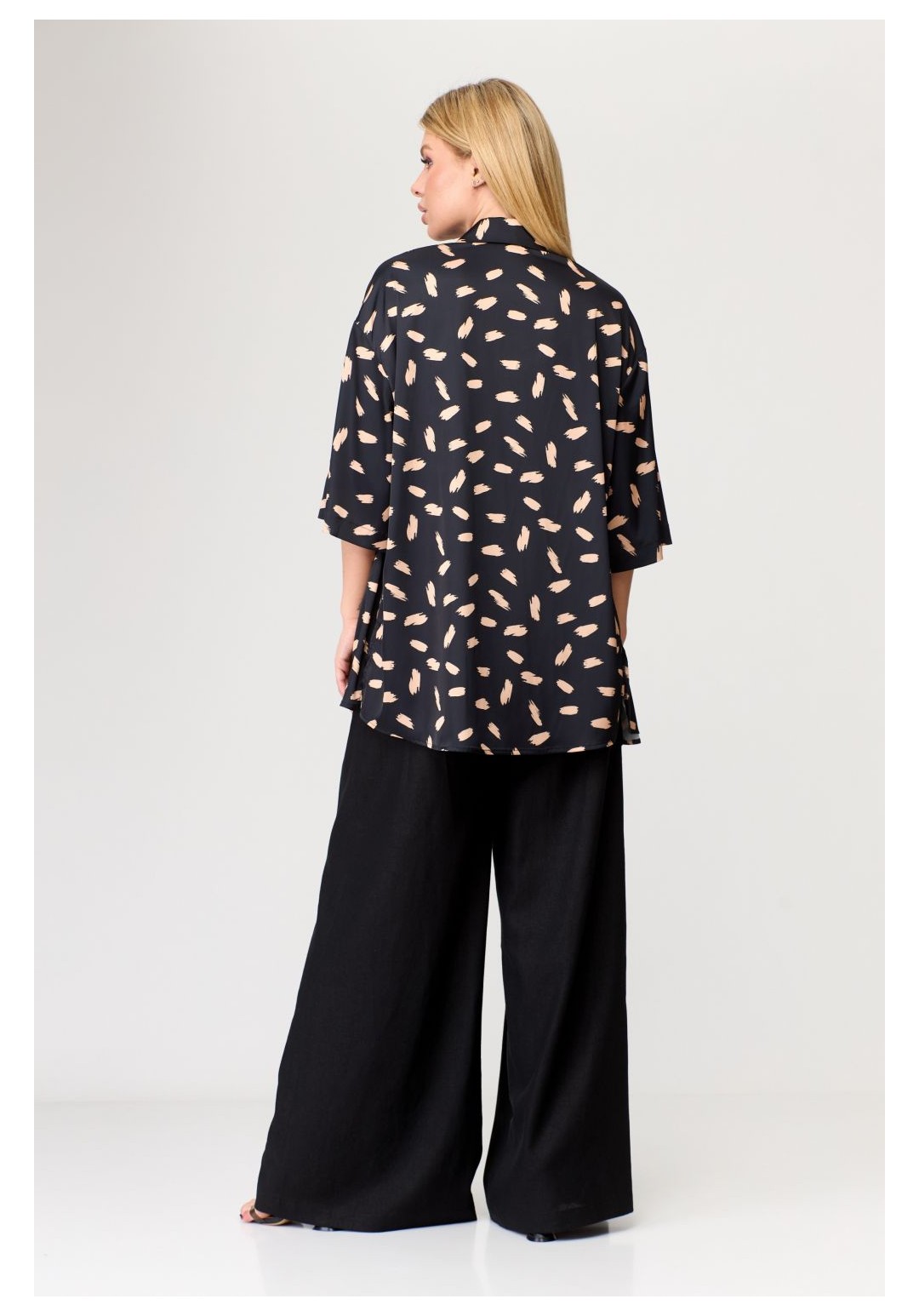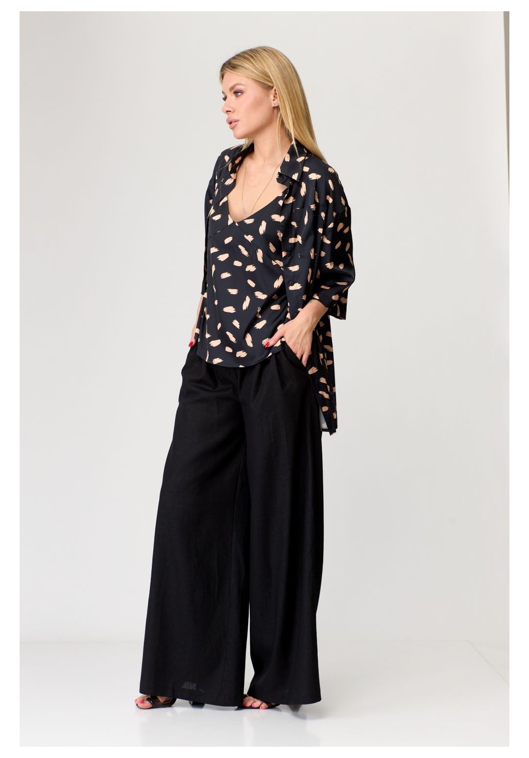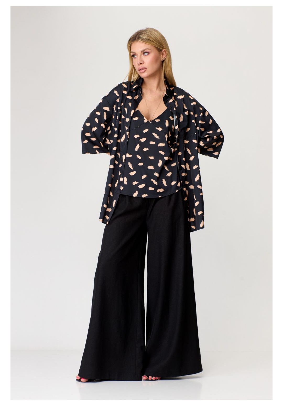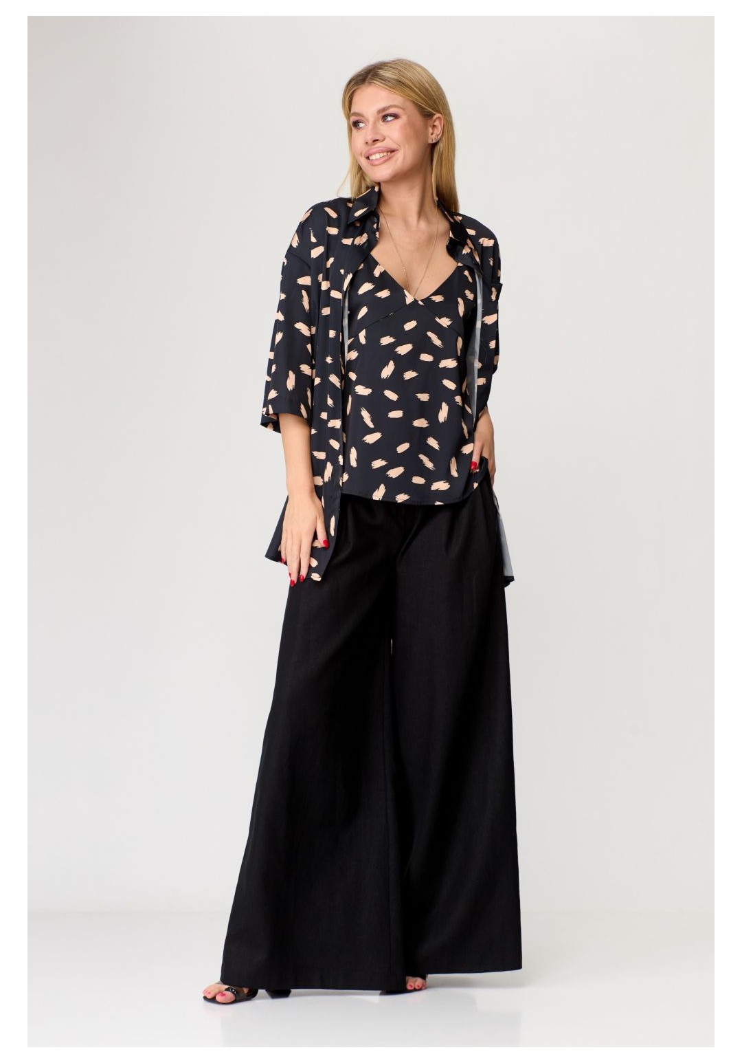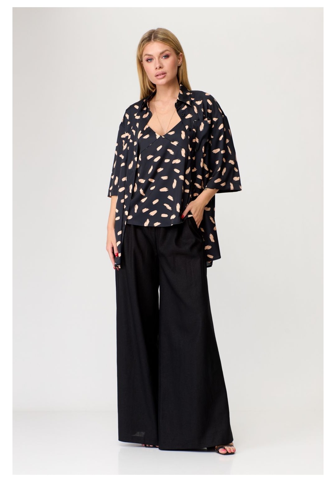 Комплект: рубашка, топ. Рубашка свободного силуэта, застёгивается на пуговицы.Рукав короткий без особенностей. Топ женский, полуприлегающего силуэта. По переду и по спинке V-образный вырез горловины. Топ на бретелях с регуляторами. Рост: 164,170 Размерный ряд: 42-50 Состав: вискоза 72, полиэстер 26, эластан 2