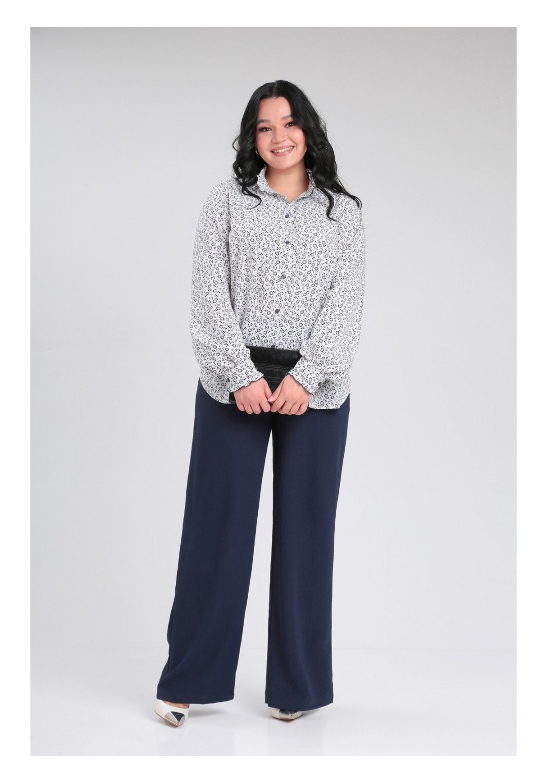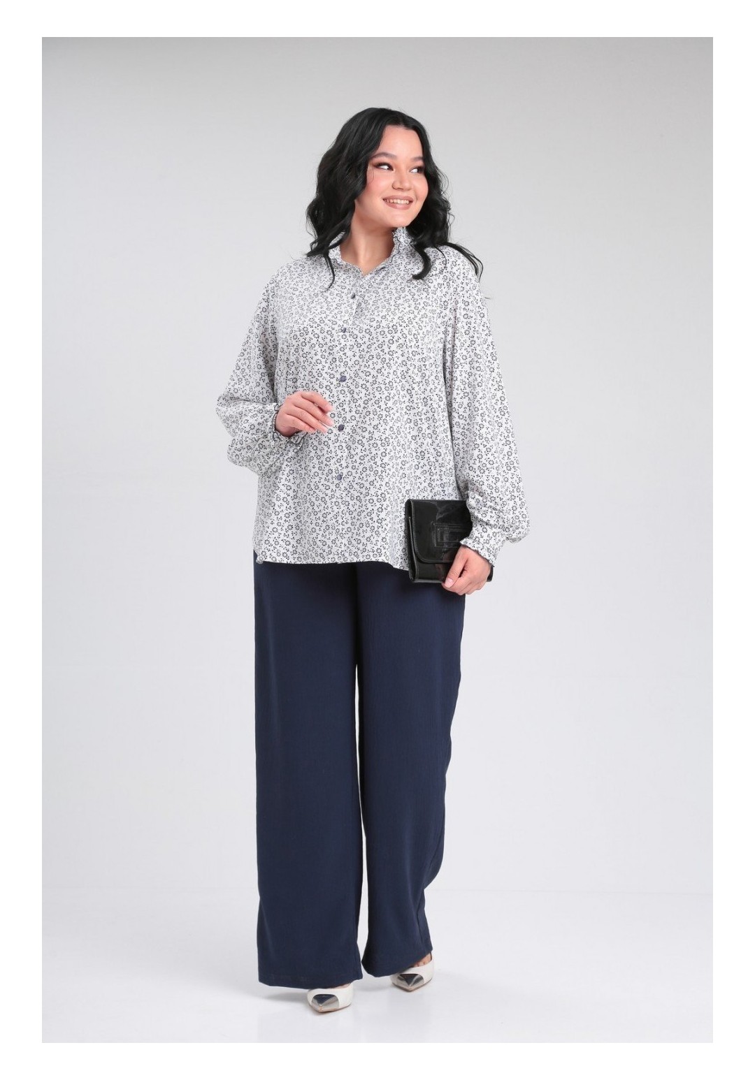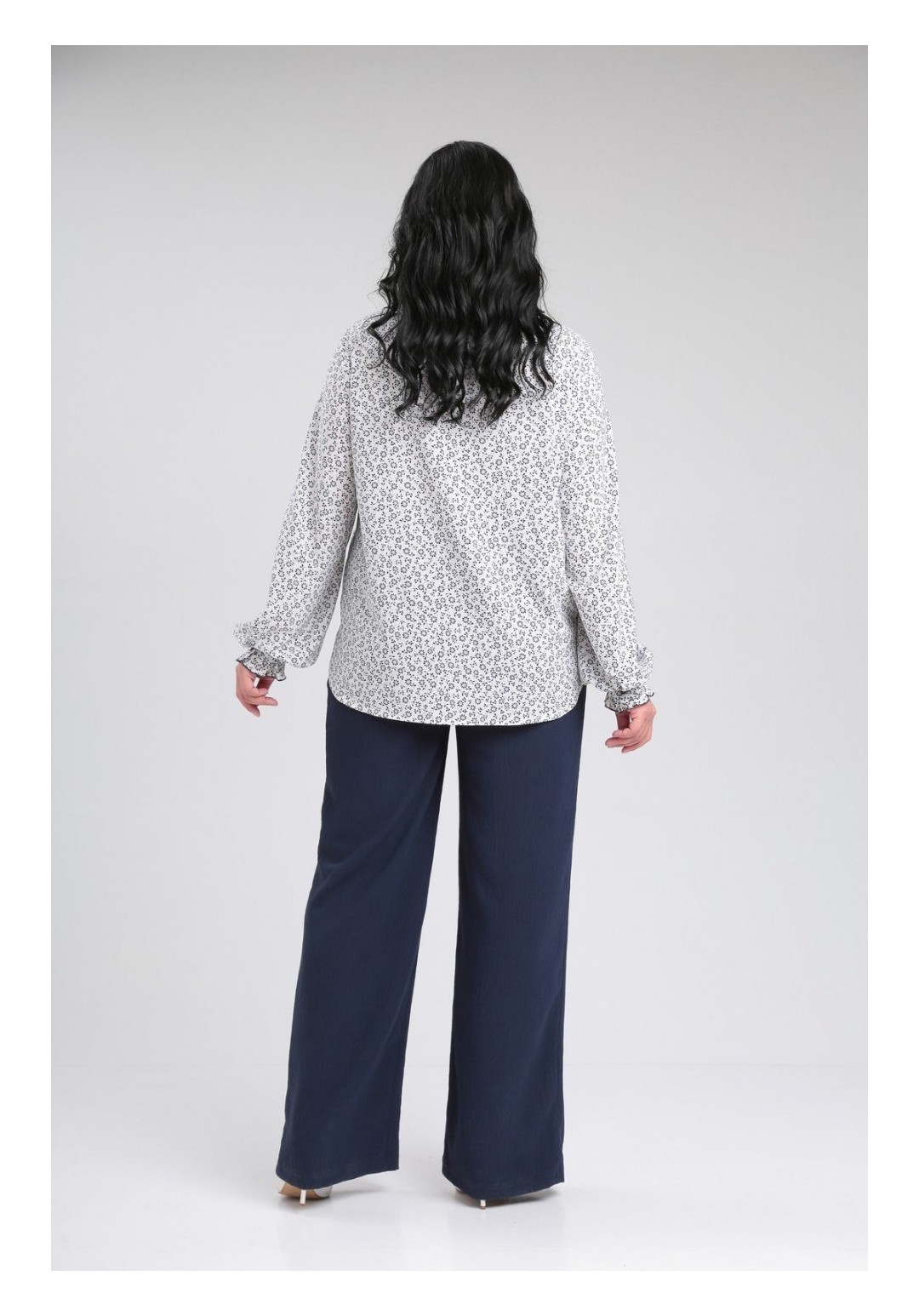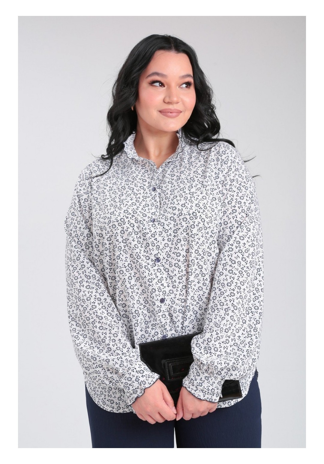 Нарядная романтичная блузка свободного силуэта, выполнена из легкой стрейчевой ткани, с втачным рукавом. Воротник стойка и манжет с рюшей, застежка на петли пуговицы. Блузка будет прекрасно смотреться в комплекте с брюками, а так же с юбкой, каждый раз помогая Вам создавать новый неповторимый образ. Приятная ткань, современный стиль, интересный дизайн, свободный покрой, широкий размерный ряд. Длина по спинке-70см длина рукава 50/52р-65см, 54/56р-66см.