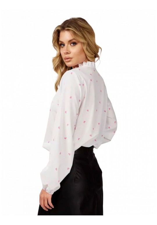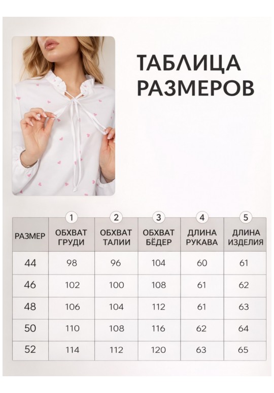 Блузка женская праздничная с бантом и принтом сердечки — нарядная офисная блуза, Беларусь Элегантность и комфорт в каждом образе Белоснежная блуза с нежным розовым принтом — идеальный баланс между деловым этикетом и романтичным настроением. Модель с воротником-стойкой, украшенным изящной рюшей, и длинными завязками позволяет трансформировать образ: от строгого закрытого до игривого с пышным бантом. Высокотехнологичная ткань с вискозой Блузон выполнен из улучшенной ткани ниагара. Оптимальный состав (72% полиэстер, 25% вискоза, 3% спандекс) делает материал невероятно мягким и дышащим. Благодаря добавлению спандекса ткань слегка тянется, обеспечивая идеальную посадку, а вискоза дарит приятную прохладу. Главное преимущество — изделие практически не мнется и сохраняет безупречный вид весь день. Продуманные детали кроя: • Рукава-фонарики: Объемные длинные рукава завершаются кокетливой оборкой на мягкой эластичной ленте (резинке), что позволяет регулировать длину и создавать модный напуск. • Лаконичный низ: Нижний край изделия выполнен без резинки и сборок, что позволяет носить блузку как заправленной, так и навыпуск в стиле туники. • Универсальный стиль: Подходит для офиса, школы, свидания или праздничных событий (Новый год, 8 Марта). Отлично сочетается с классическими брюками, джинсами или кожаными юбками. Информация о размере и посадке: • Важно: Модель немного маломерит, для максимально комфортной посадки рекомендуем ориентироваться на таблицу замеров в карточке товара. • Параметры модели на фото: Рост — 169 см, размер изделия — 44. • Размерный ряд: от 44 до 52. Качество из Беларуси Сделано в Беларуси с особым вниманием к качеству швов. Изделие неприхотливо в уходе: рекомендована бережная стирка при температуре до 30°C. Ссылка на видеоролик в нашем канале: https://www.youtube.com/watch?v=DStyt1dGmd4