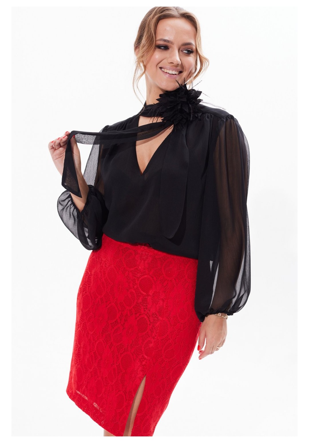 Блузка двухслойная из шифона с длинным рукавом. На горловине декоративный бант. Длинный широкий рукав. V-образный вырез. Блузка спереди короче, сзади длиннее.