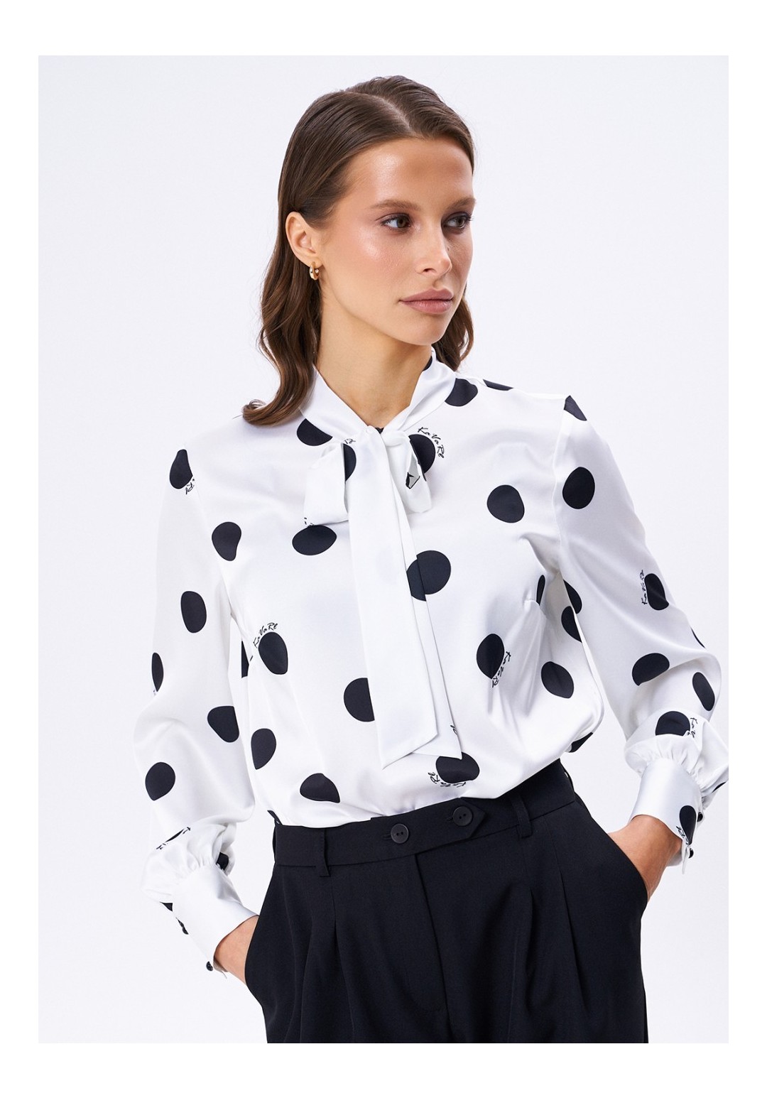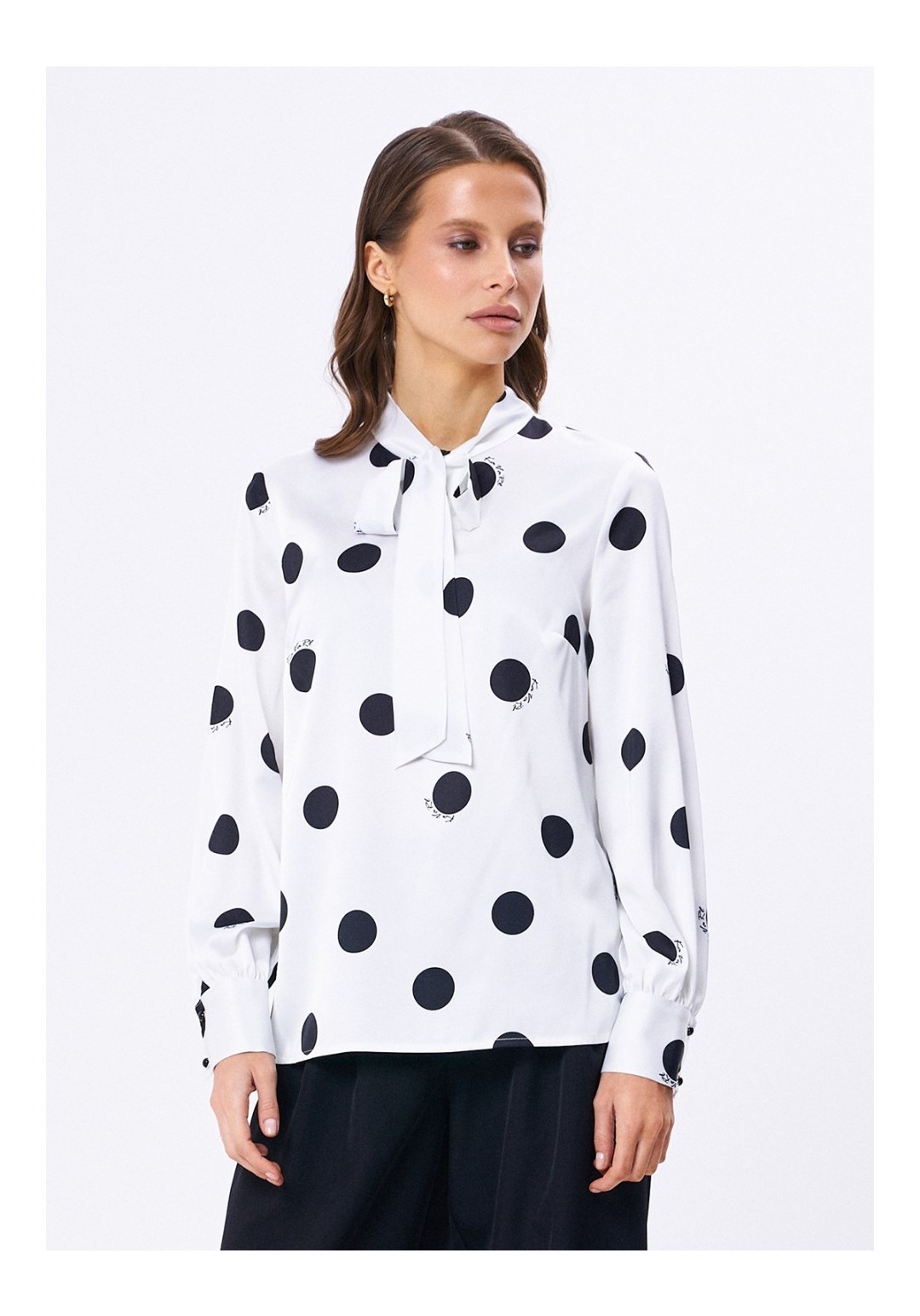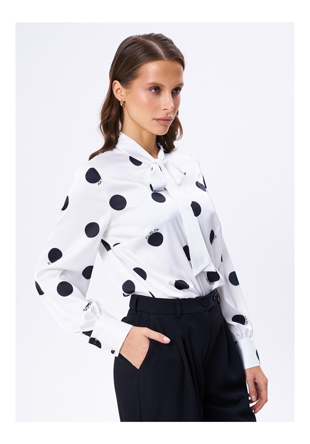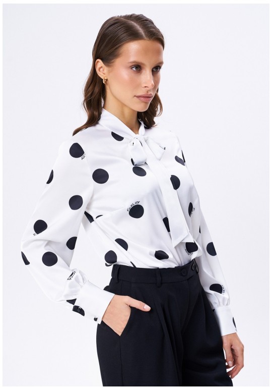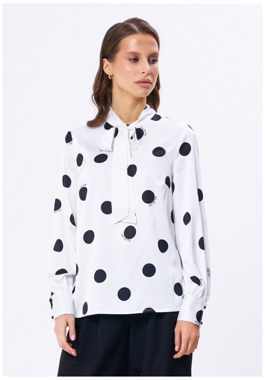 Классическая блузка из искусственного шёлка в крупный горох. Рукава на манжетах с застёжкой на пуговицу. По горловине стойка, переходящая в завязку для банта. Длина изделия - 64 см, длина рукава - 61 см.