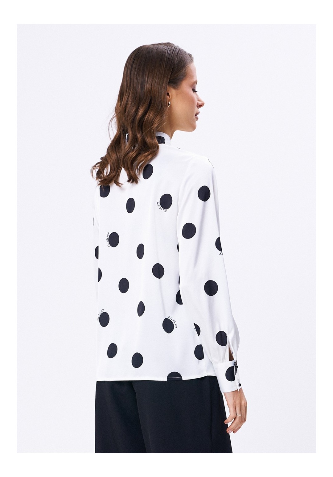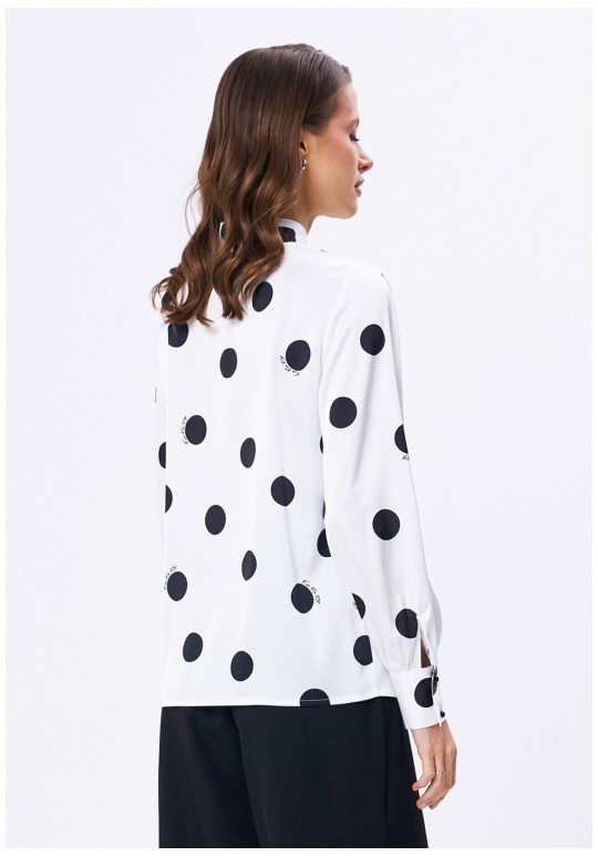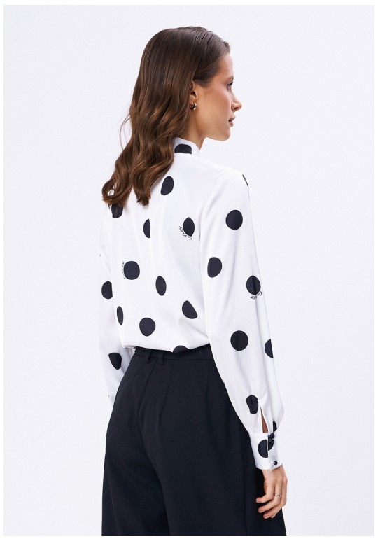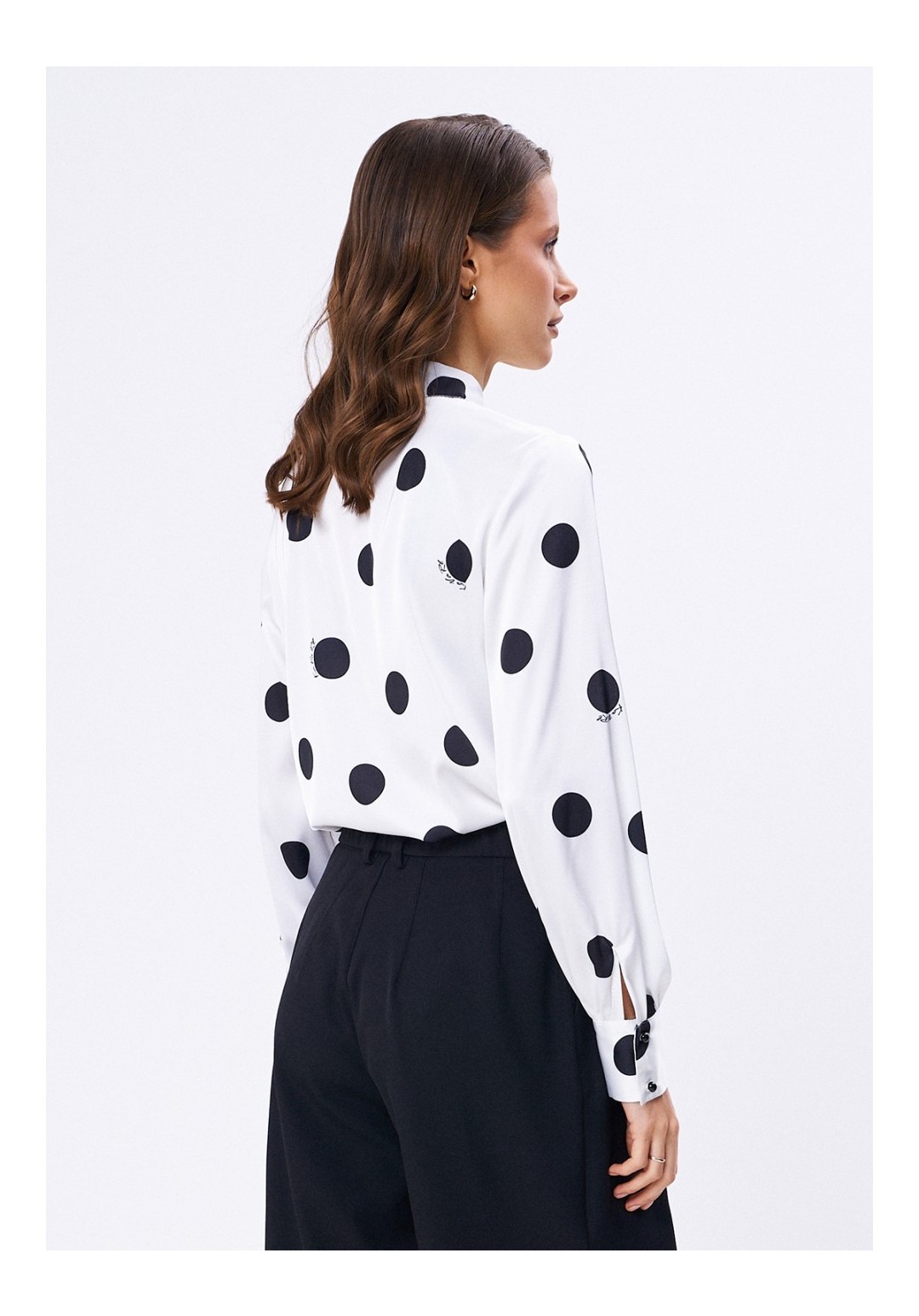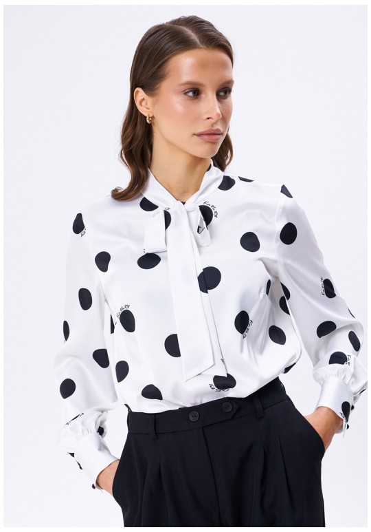 Классическая блузка из искусственного шёлка в крупный горох. Рукава на манжетах с застёжкой на пуговицу. По горловине стойка, переходящая в завязку для банта. Длина изделия - 64 см, длина рукава - 61 см.