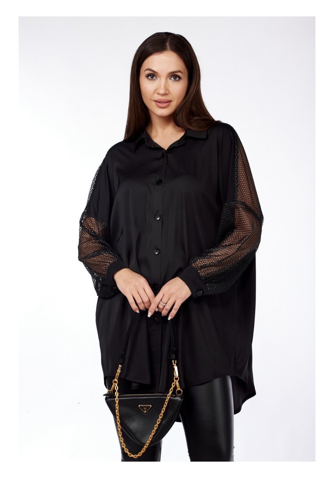 Женская нарядная блуза оригинального кроя прекрасно вольется в Ваш гардероб, благодаря своей уникальности. Изделие выполнено из тонкой блузочной ткани атлас-шифона с отделкой рукава и спинки из сетки с блеском. По переду застежка на петли с пуговицами, воротник рубашечный со стойкой. Блуза оверсайз, плечо спущено с втачным длинным рукавом на манжете. Спинка с подрезной плечевой кокеткой и складкой по низу, из-под кокетки имеется небольшая сборка. Низ блузы с фигурными вырезами по бокам. Изделие отлично смотрится с поясом и без (пояс в комплекте не идет). Длина изделия по спинке 92 см, длина рукава от горловины 67см. Изделие подойдет на рост 170см.
