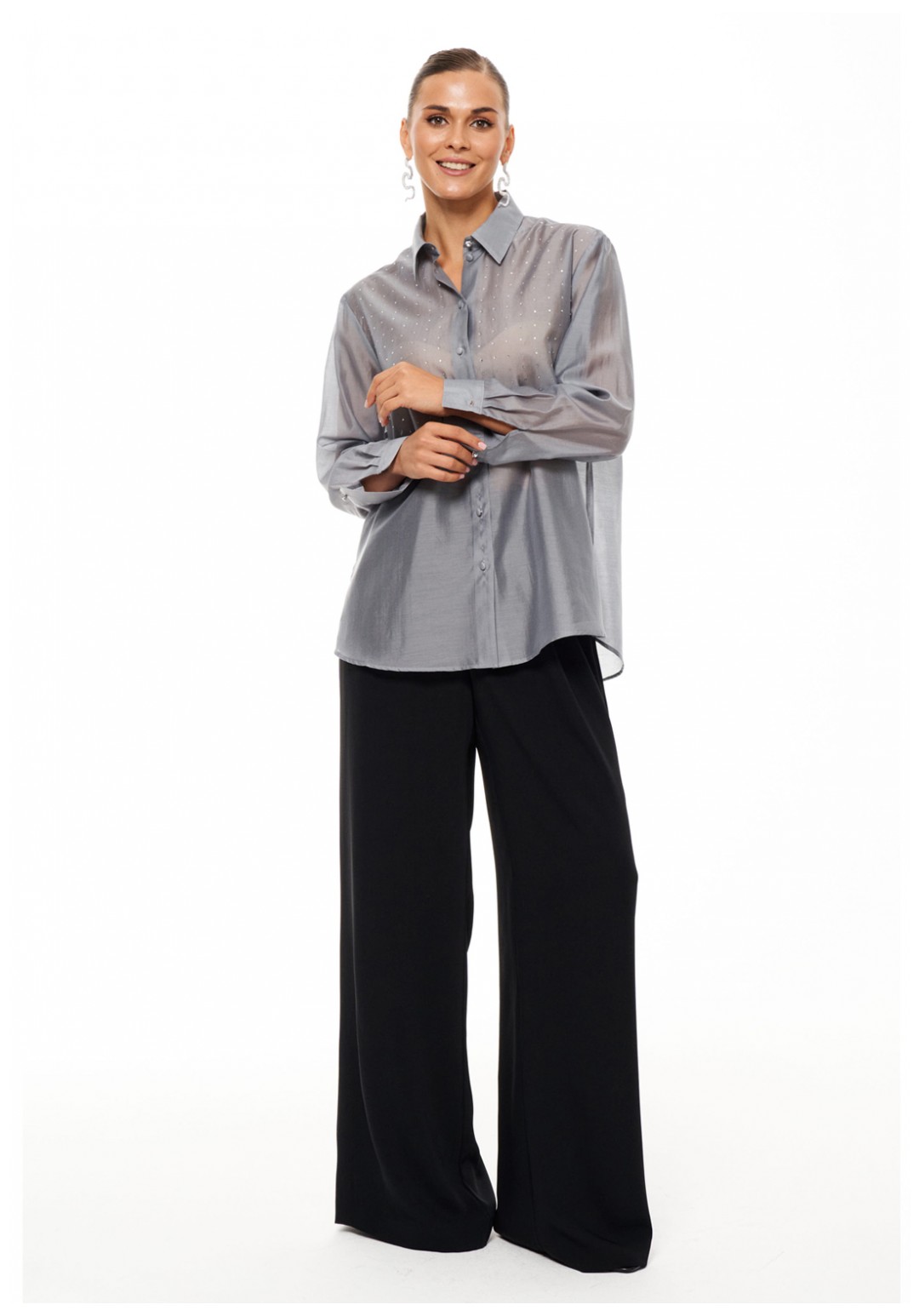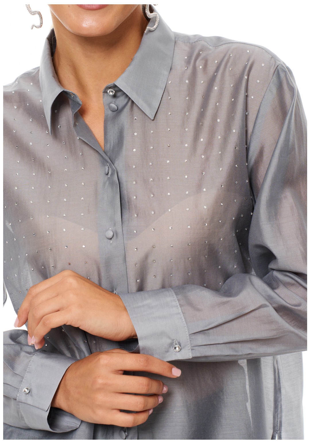 Длинный рукав и застежка на пуговицы спереди делают её идеальной для офисных будней, а блестящие стразы на передней части придают изделию нарядность, делая его подходящим и для вечерних мероприятий. Фигурный низ с разрезами по бокам и удлинённая спинка обеспечивают комфорт и стиль.