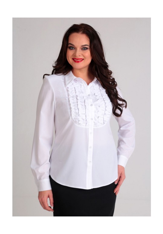 Блуза женская, прилегающего силуэта. Застежка центральная, на планку. Воротник рубашечный, на стойке. Спинка с центральным швом и талевыми вытачками. Блуза с переходящим плечевым швом на полочку в виде кокетки отстроченной. Полочка изделия отделана нагрудной деталью скругленной формы, с настрочными рюшами. Так же рюша втачивается под планку по нагрудной детали. Рукав одношовный, с притачным манжетом.