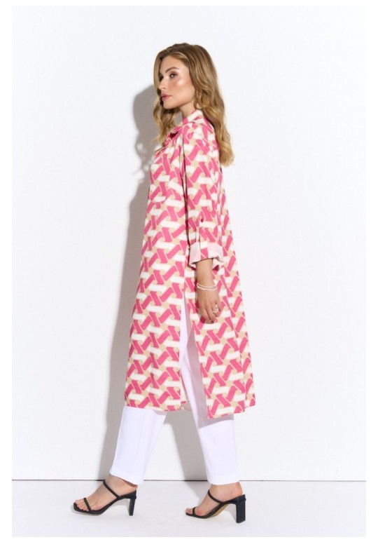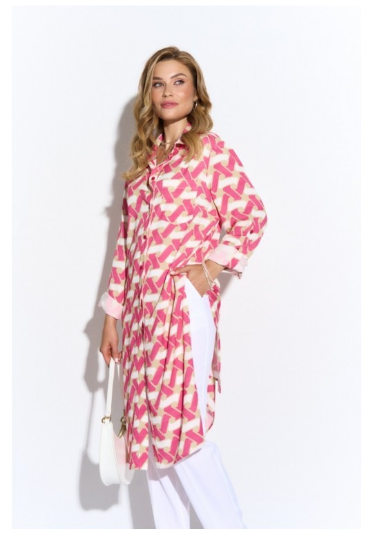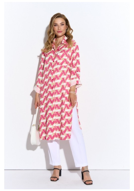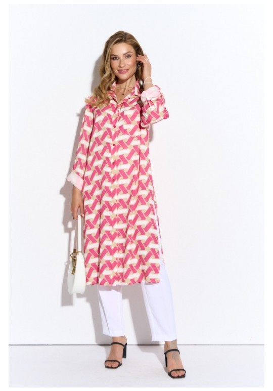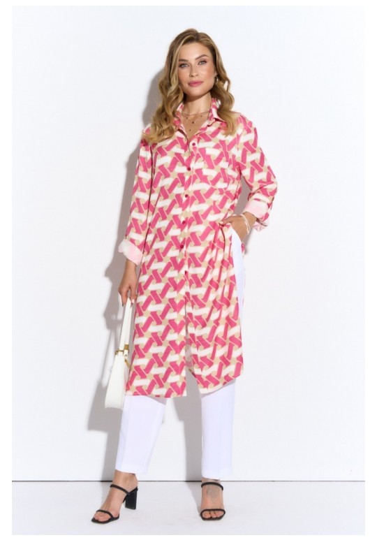 Удлиненная блузка из легкой принтованной ткани. Рубашечный воротник, втачной длинный рукав на манжете, застежка на пуговицы до низа, высокие разрезы по бокам