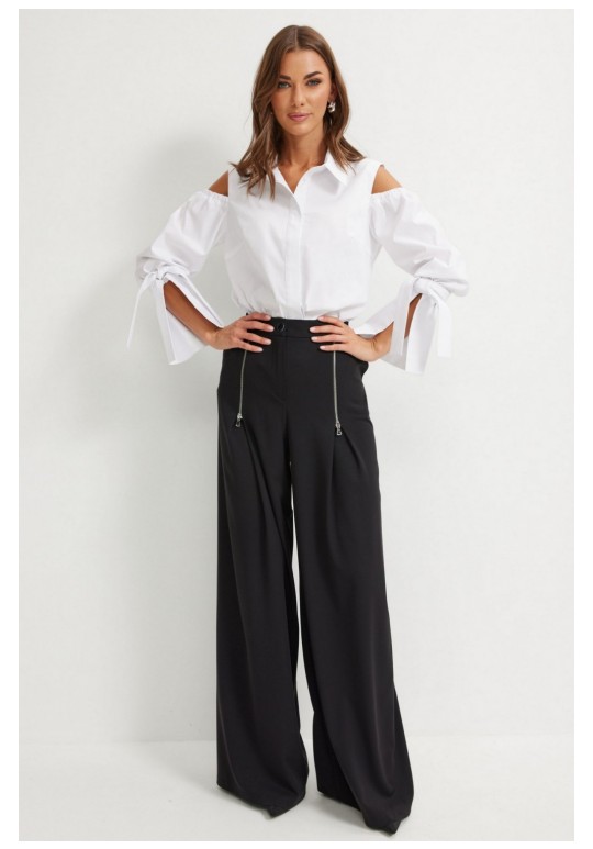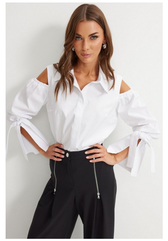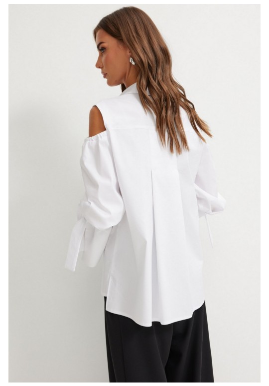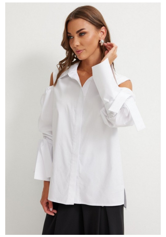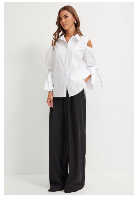 Блуза прямого силуэта из хлопковой ткани с фигурным низом. Воротник рубашечного типа с центральной застежкой на петли и пуговицы. Рукав втачной с декоративным вырезом, по низу завязки. На спинке кокетка и декоративные складки. В боковых швах по низу блузки разрезы. Обращаем ваше внимание, что фурнитура может отличаться от фото. Длина блузки (44-48р – 70см)(50-54р - 72см) Длина рукава (44-48р – 58см)(50-54р - 59см)