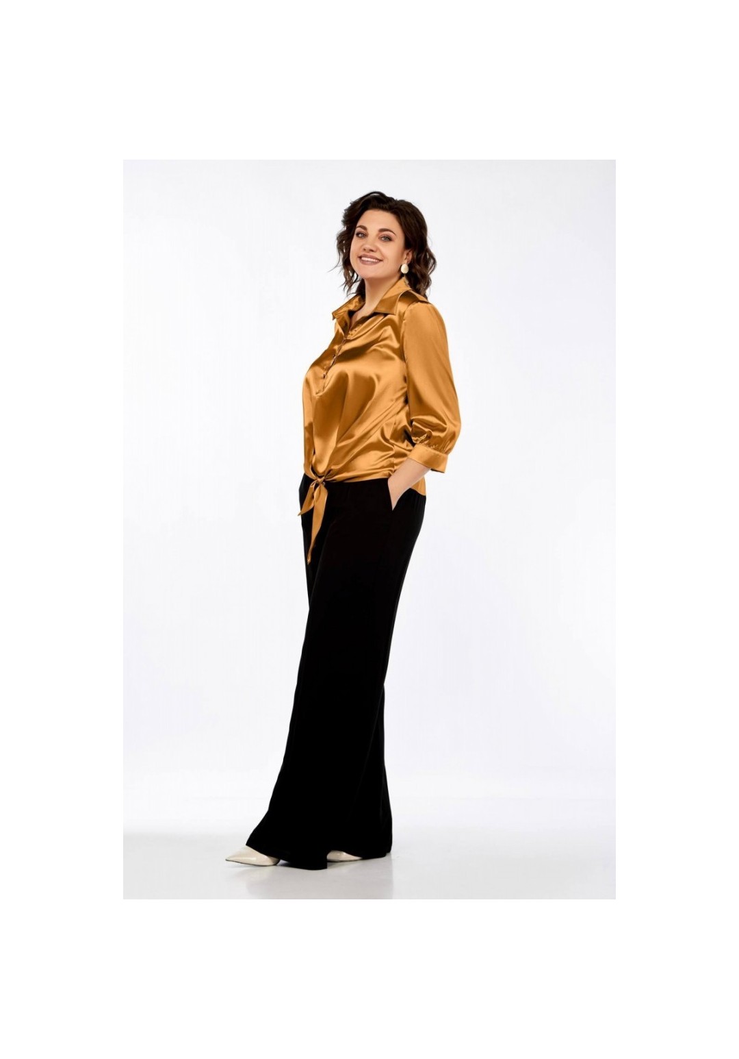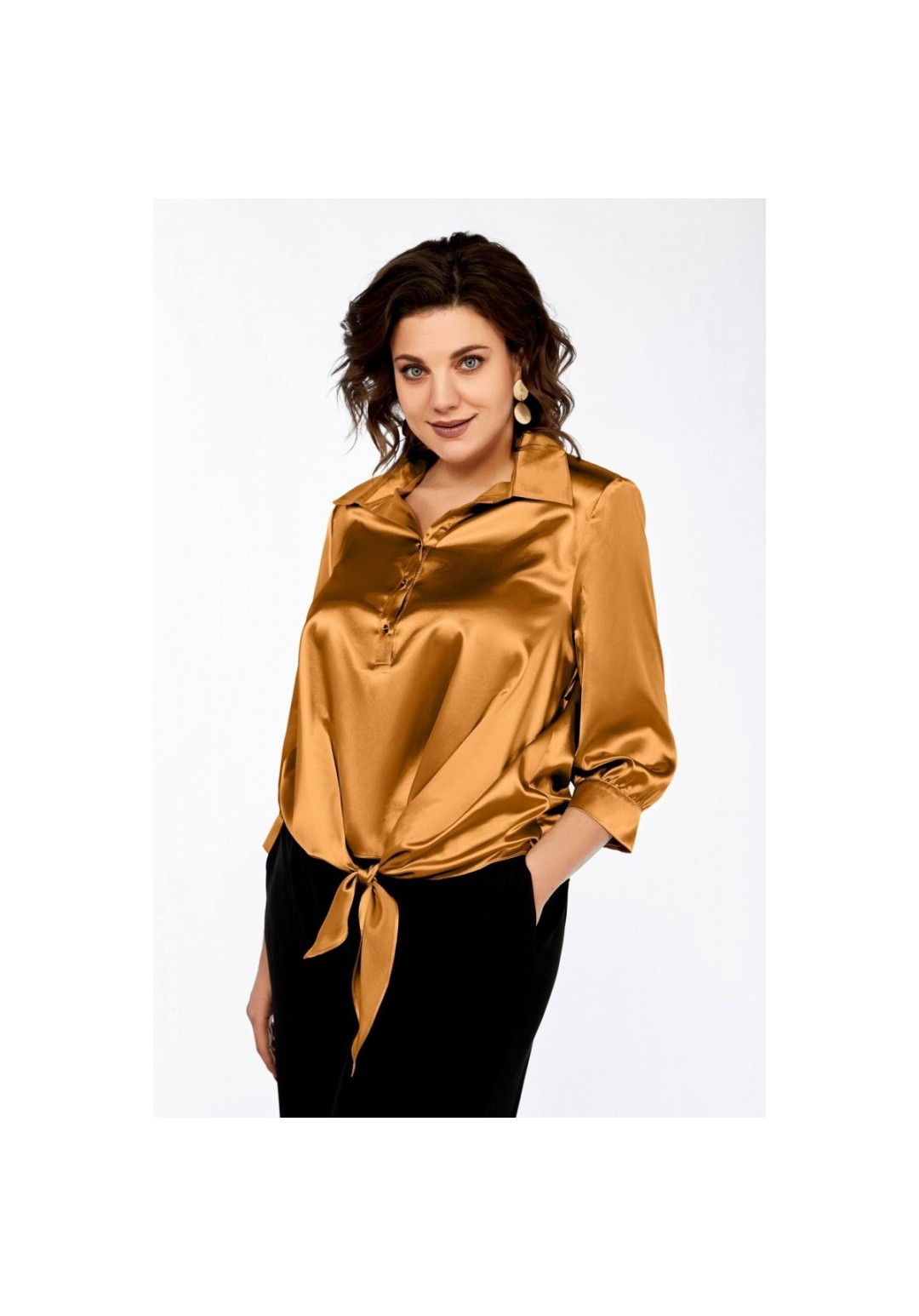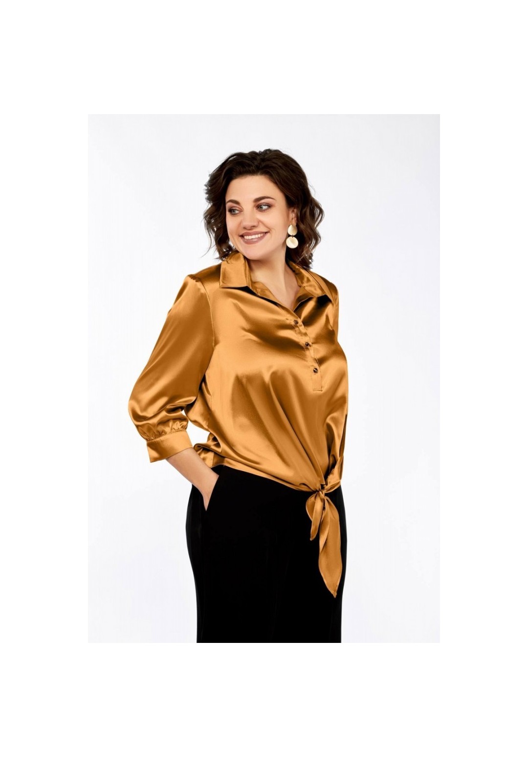 Блузка из мягкого блузочного атласа, прямого силуэта, с рубашечным воротником и застежкой на три пуговицы на планке до середины блузки. По переду блузка удлинена и низ переходит в завязку. Рукав трехчетвертной на манжете, на одну пуговицу. Длина блузки 65см, длина рукава 48см.
