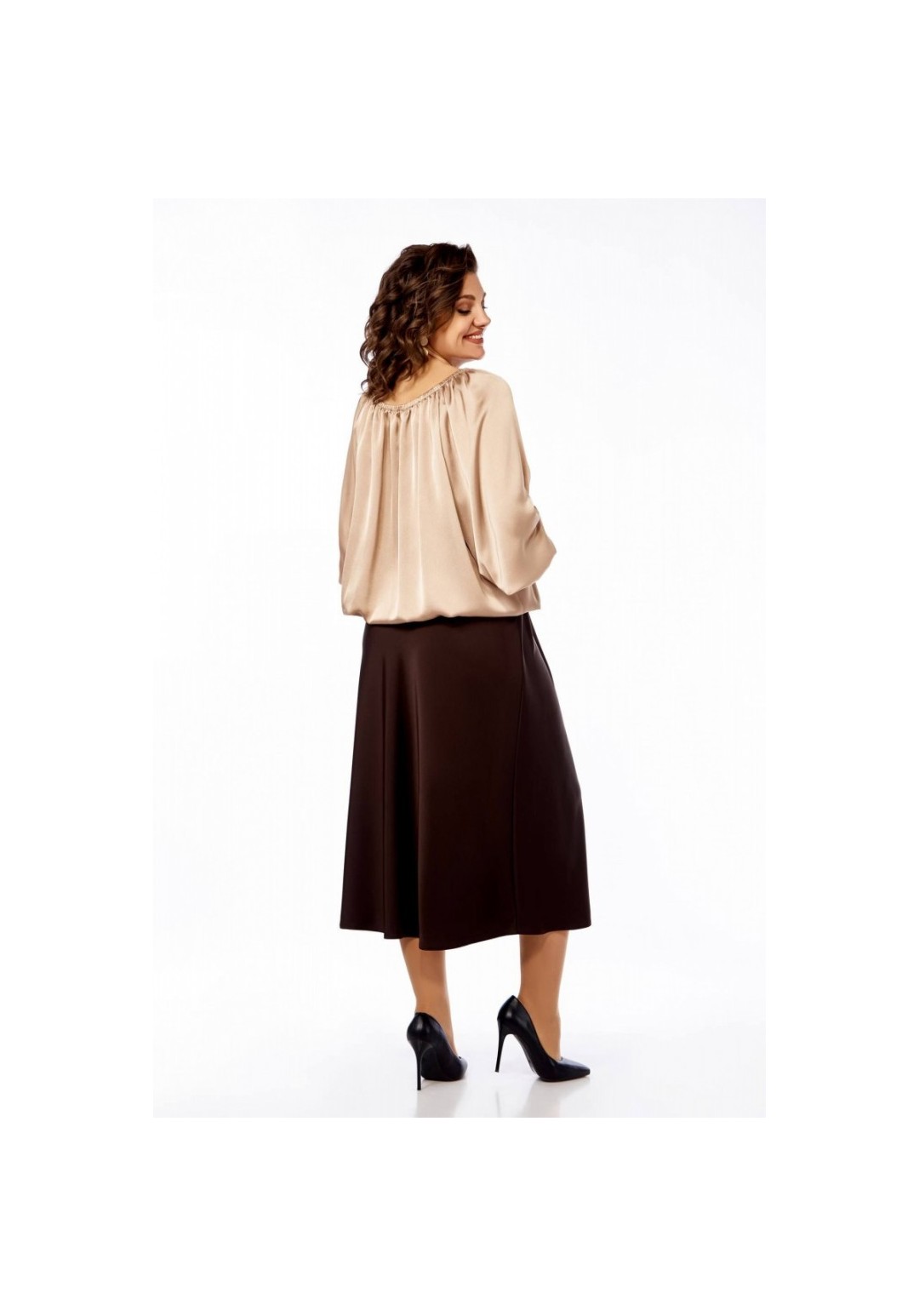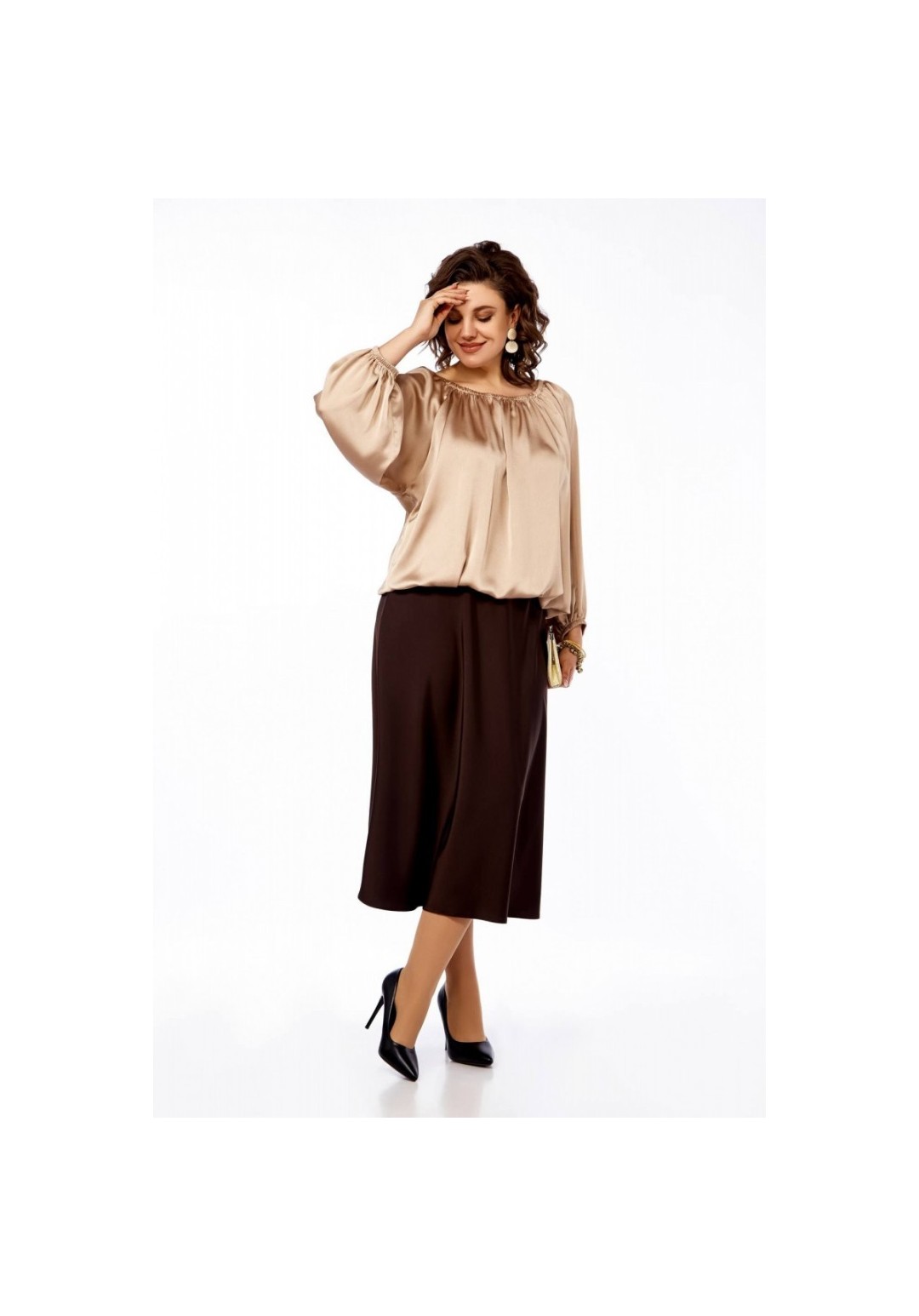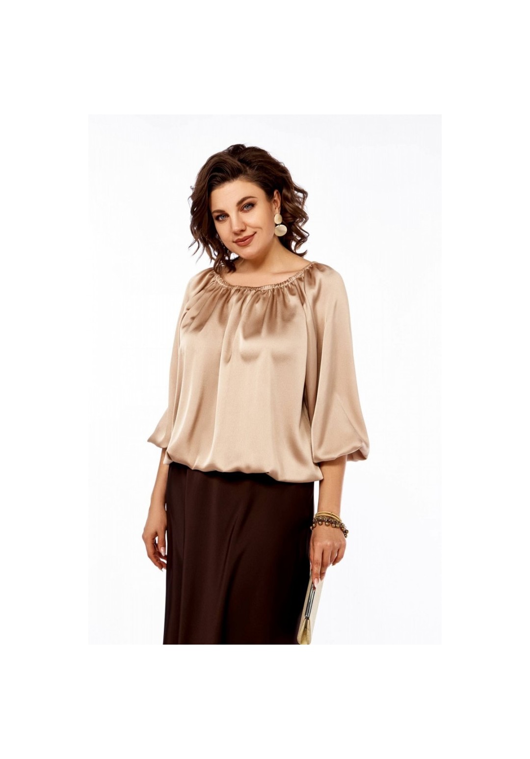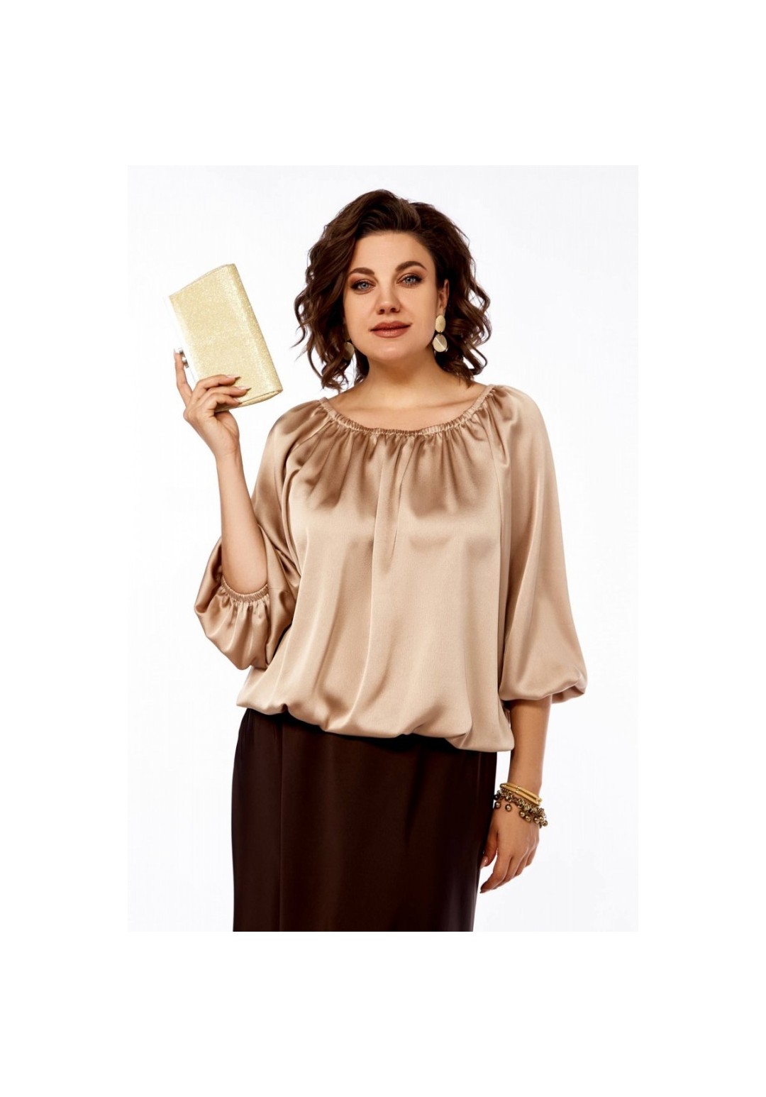 Нарядная блузка из богатого атласа свободного силуэта с рукавами реглан. Верхний срез блузки на резинке, что дает возможность изменять горловину. Широкий рукав реглан. Низ рукава на резинке. Длина блузки 61см, длина рукава от горловины 66 см.