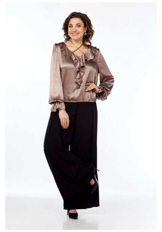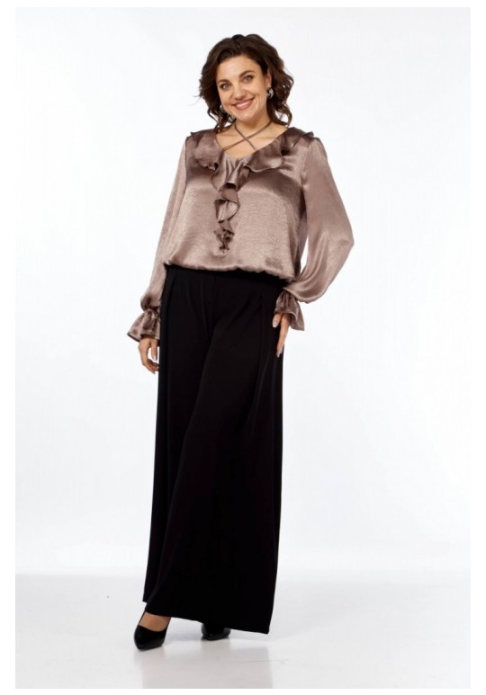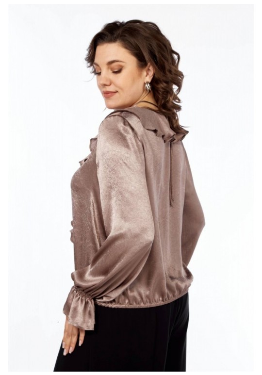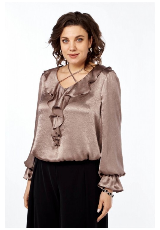 Нарядная блузка, прямого силуэта из струящейся ткани. Вырез горловины V-образной формы. Волан по спинке, заканчивающийся по переду, завязка. Рукав длинный с воланом. Рукав и низ собраны на резинку.
