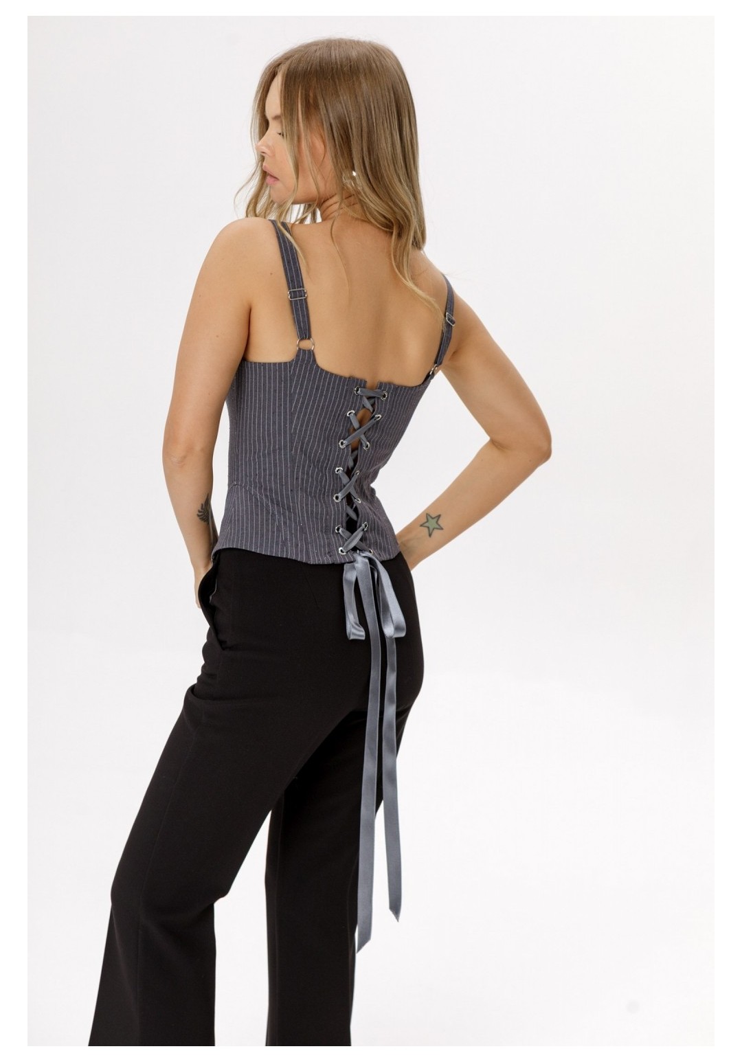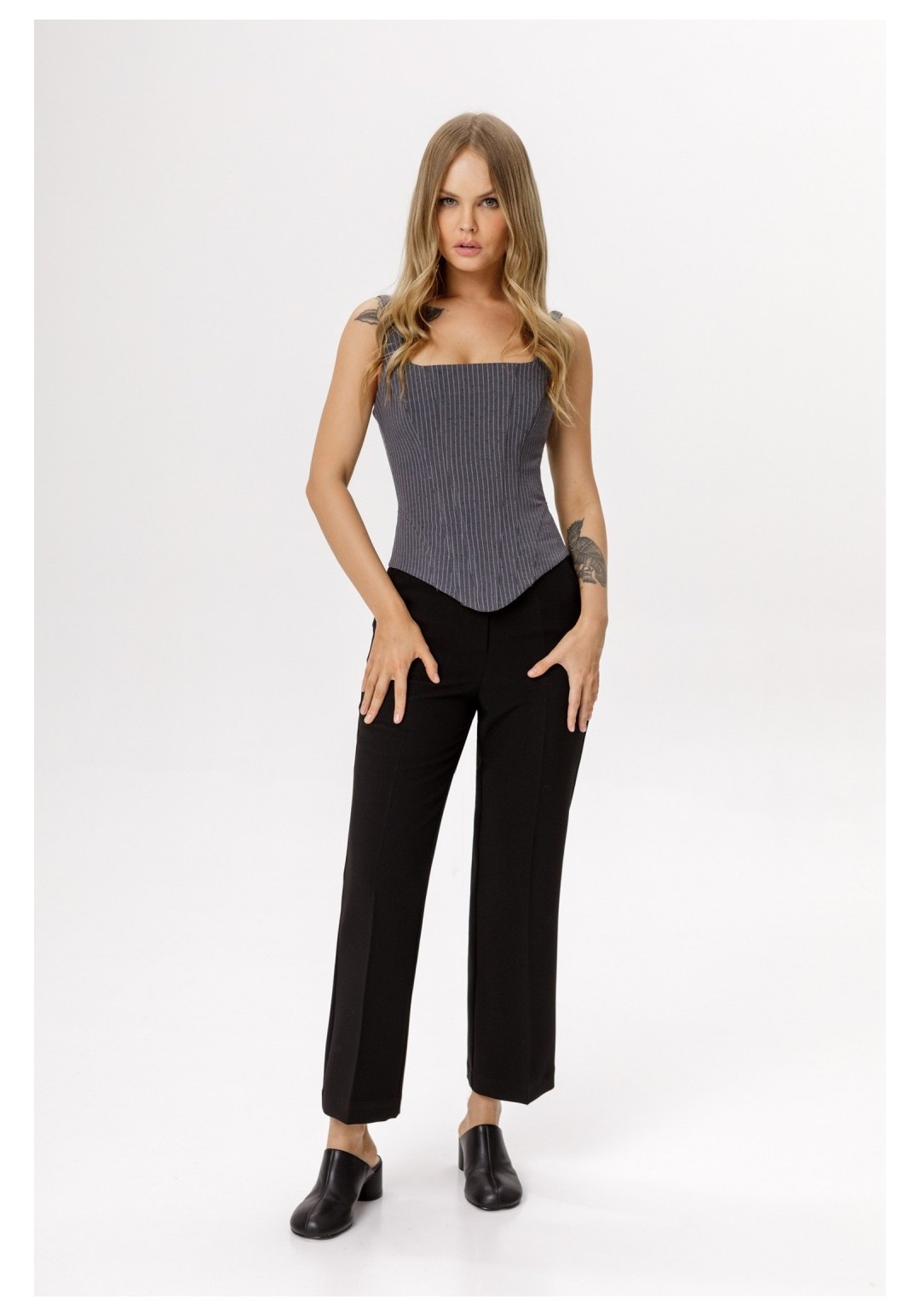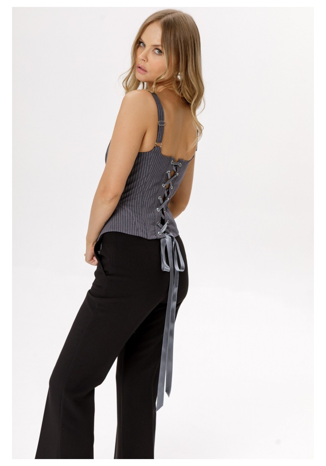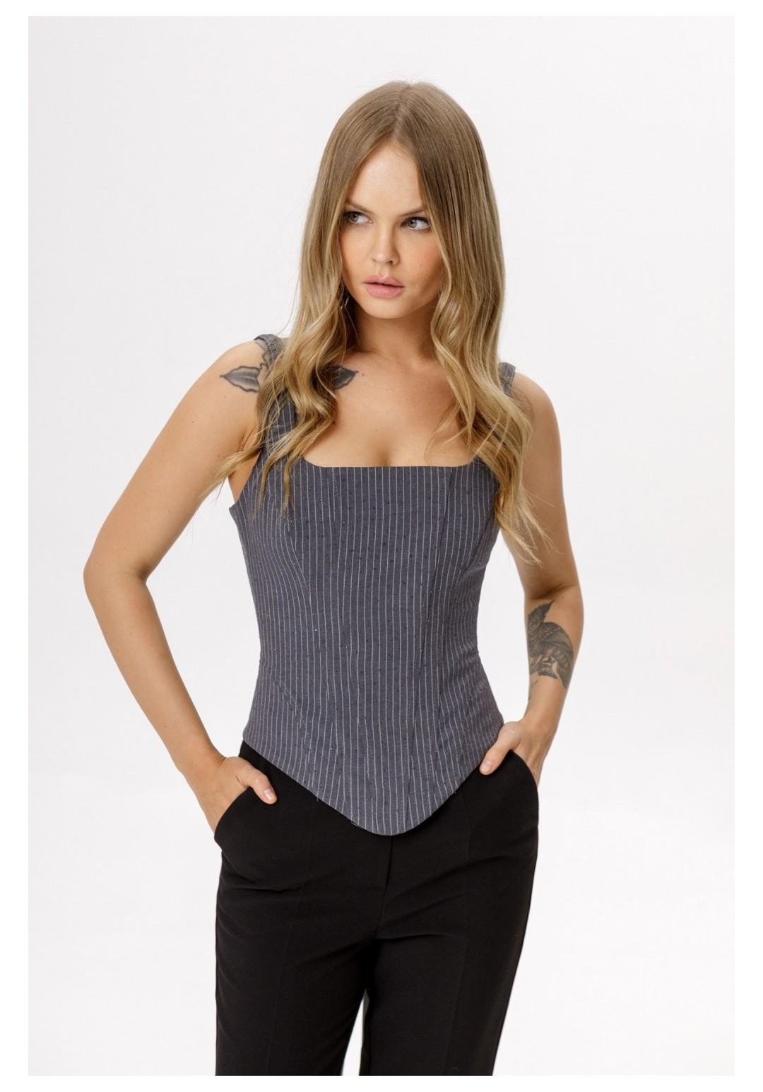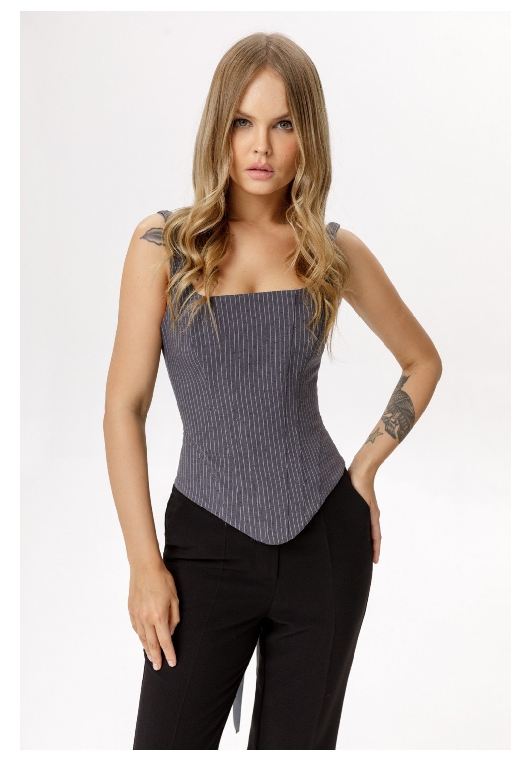 Корсет с глубоким квадратным вырезом из костюмной ткани в тонкую полоску со стразами. Детали: прилегающий силуэт, фигурный вырез переда и спинки, рельефные швы с регилиновыми вставками, фигурный низ, застежка-шнуровка по спинке, регулируемые бретели. Длина корсета по боковому шву около 30 см в размерах 40-46 и около 31 см в размерах 48-52.