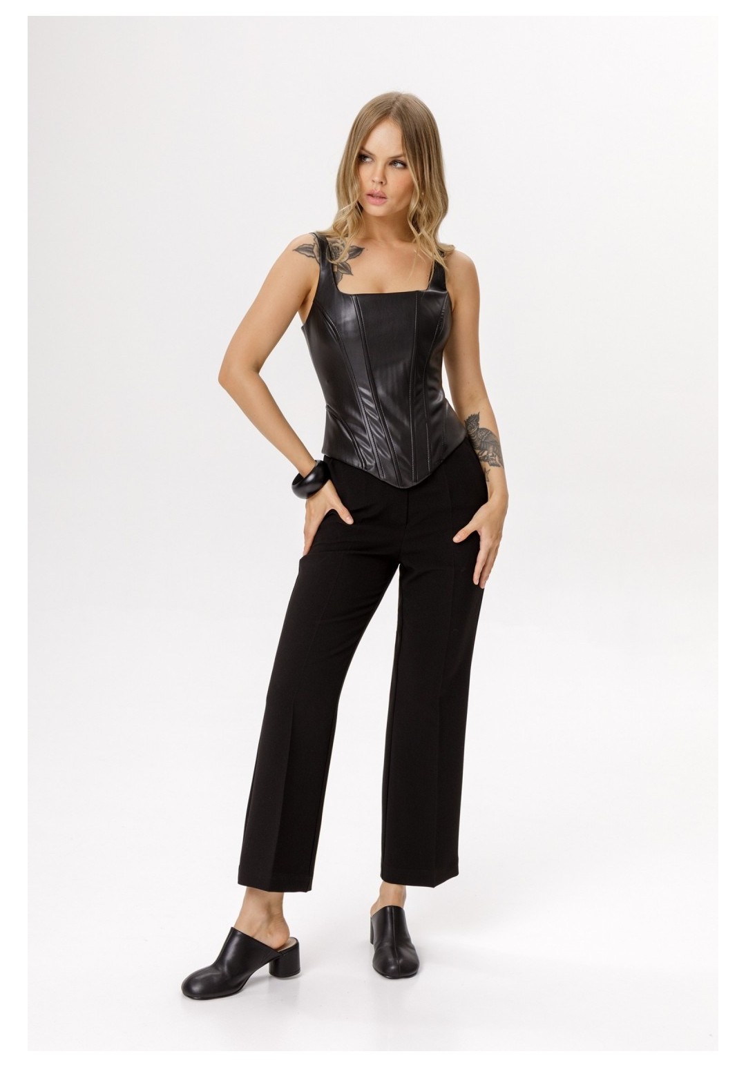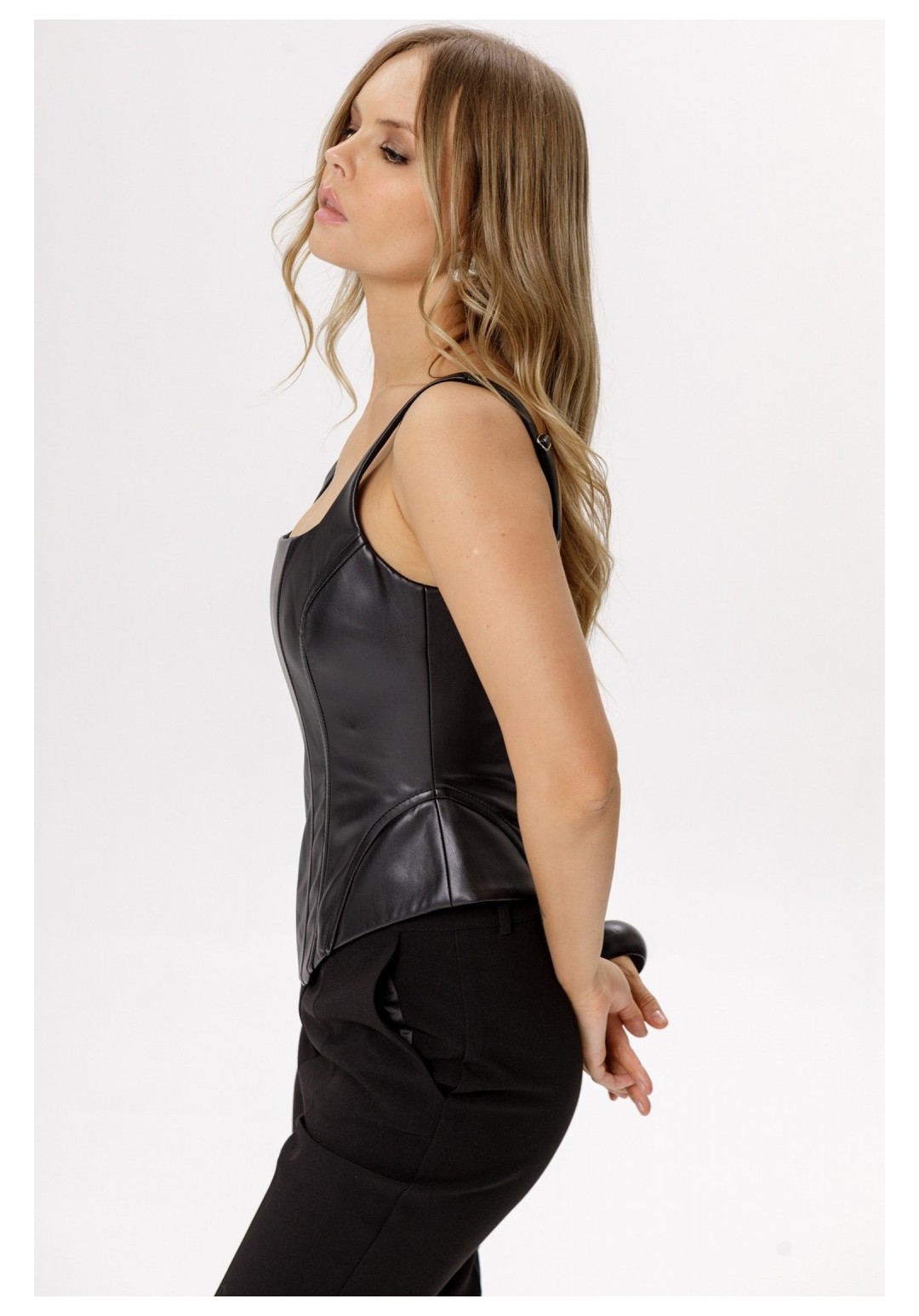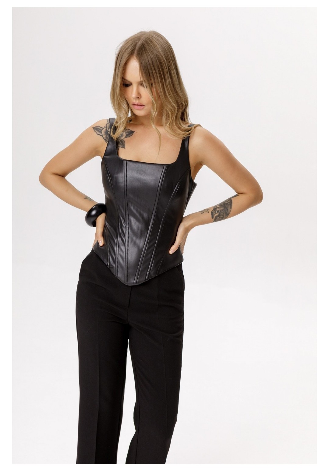 Корсет с глубоким квадратным вырезом из экокожи. Детали: прилегающий силуэт, фигурный вырез переда и спинки, рельефные швы с регилиновыми вставками, фигурный низ, застежка-шнуровка по спинке, регулируемые бретели. Длина корсета по боковому шву около 30 см в размерах 40-46 и около 31 см в размерах 48-52.