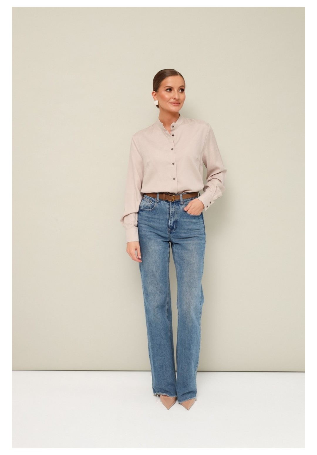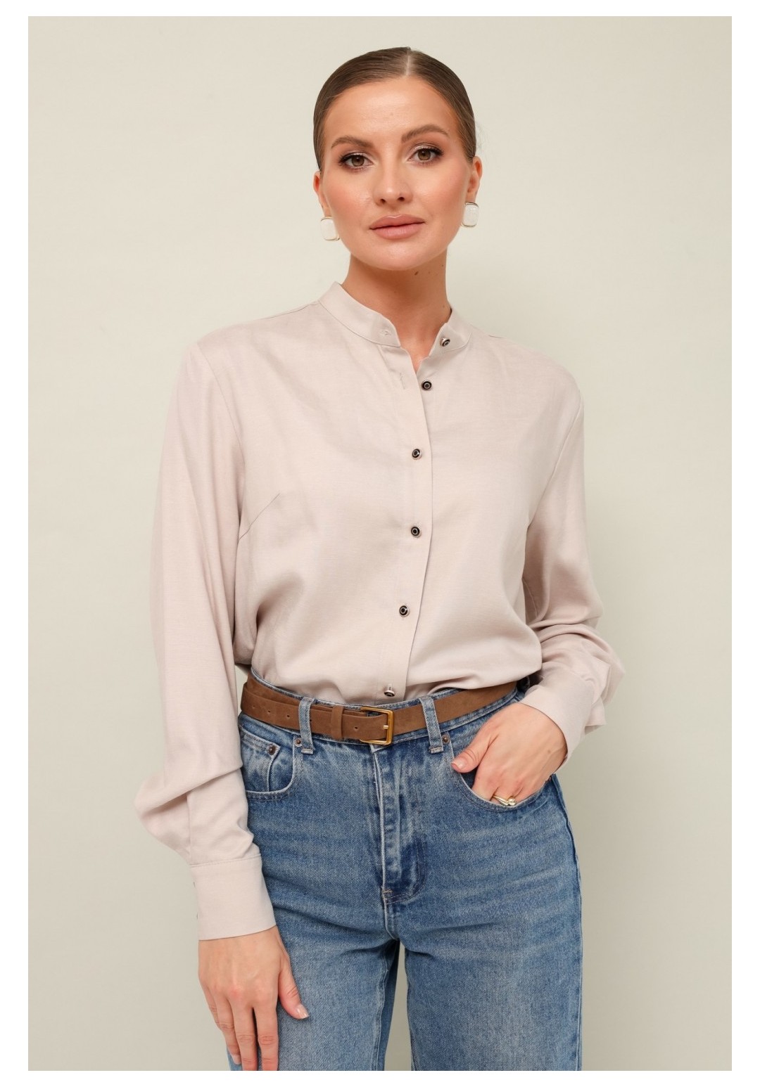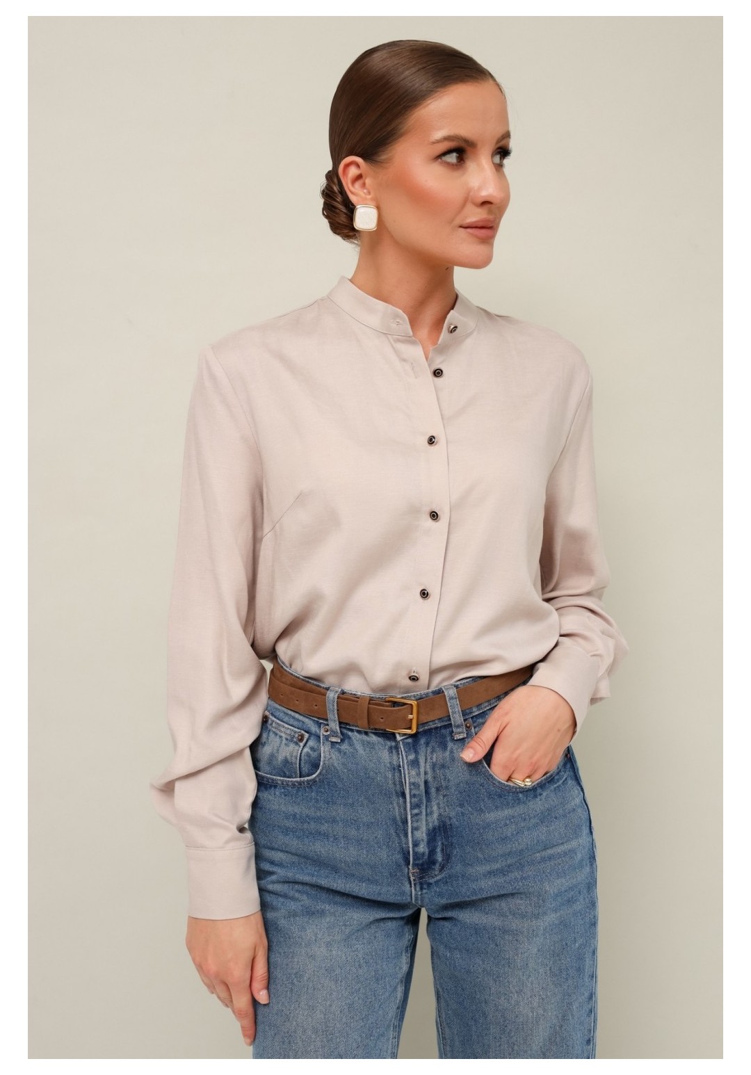 Стильная и комфортная блузка, выполнена из натуральной вискозной ткани. Блузка прямого кроя, горловина со стойкой, центральная застежка на петли и пуговицы. Рукава втачные с манжетами с застежкой на пуговицы. В боковых швах обработаны высокие разрезы.