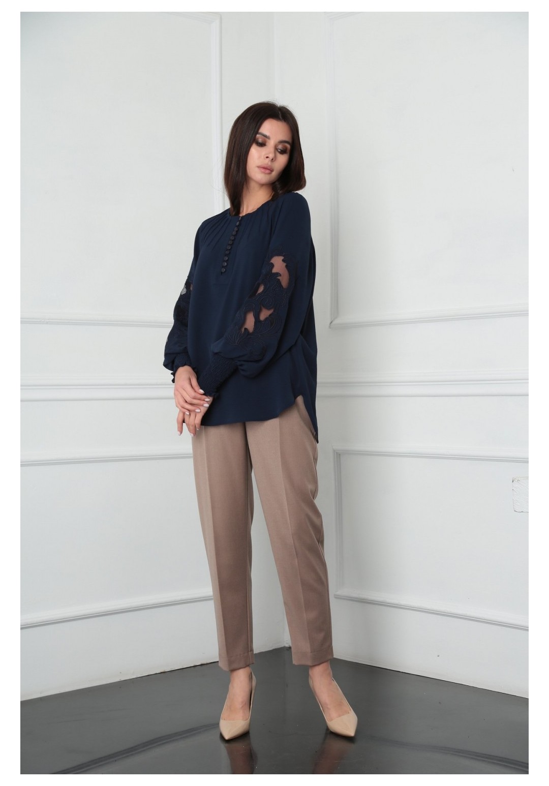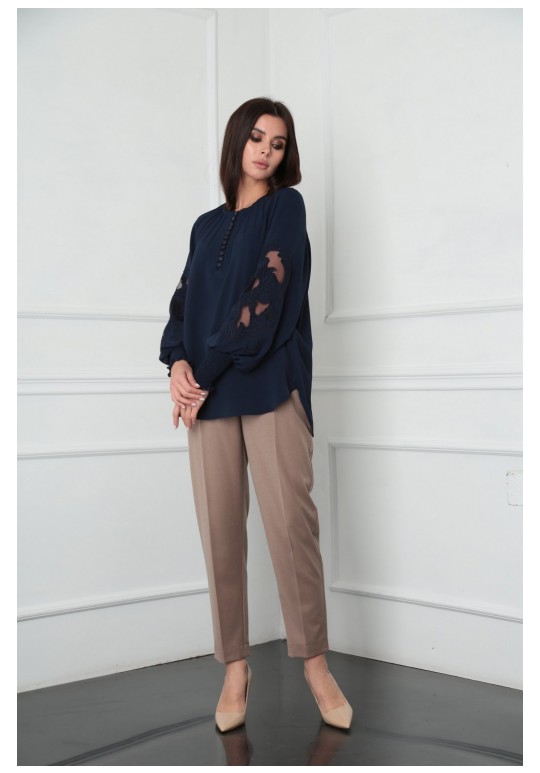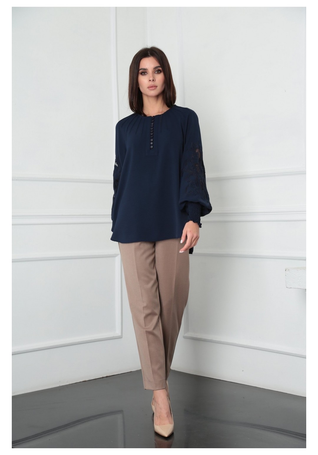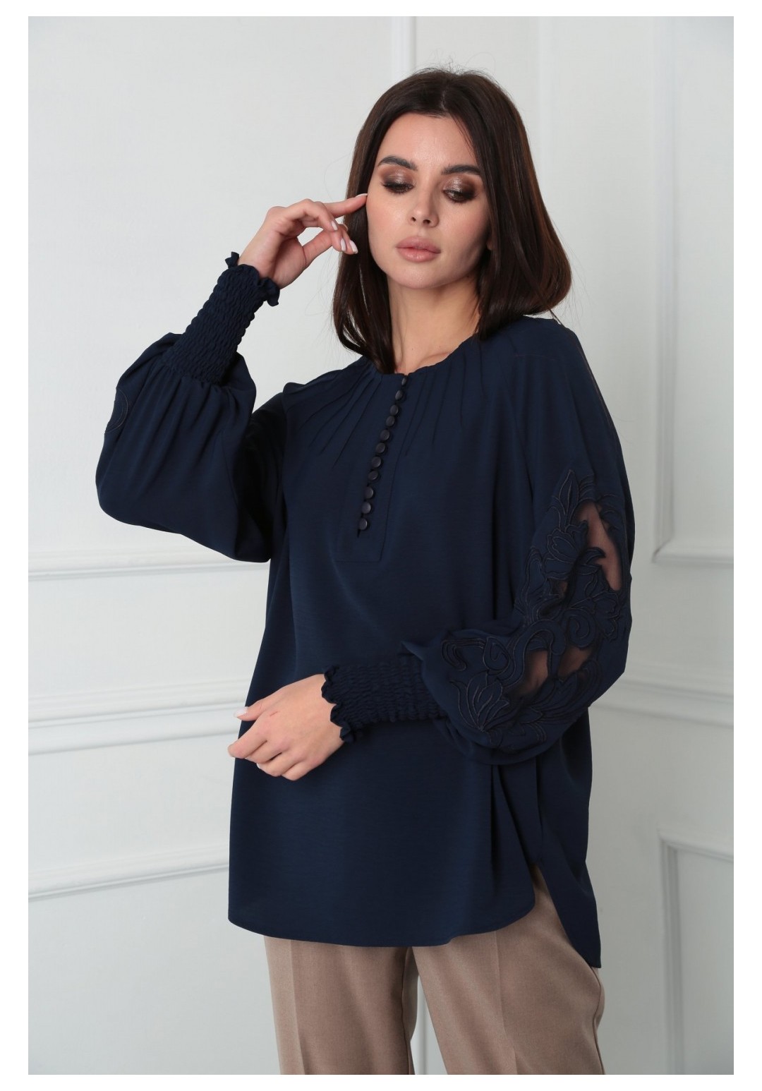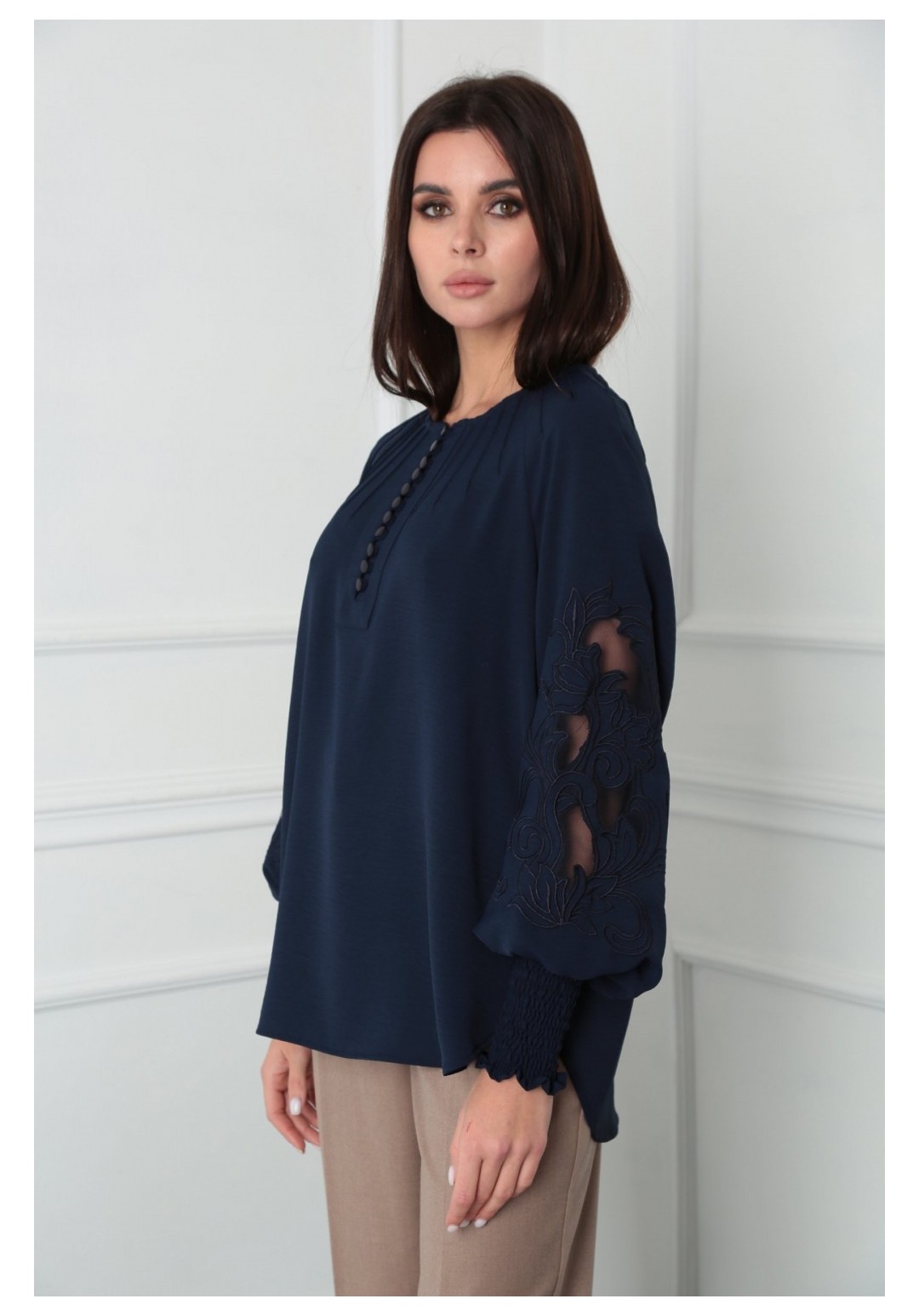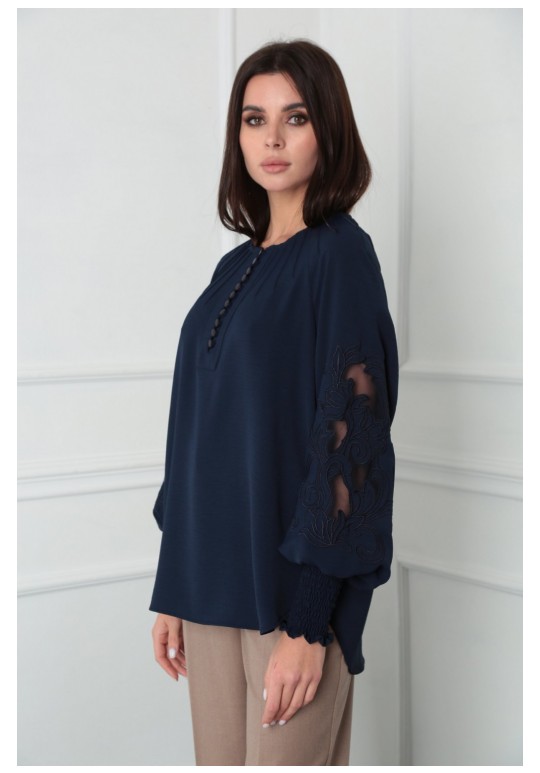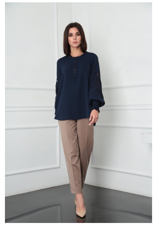 Блузка женская из лёгкой хлопковой ткани, прямого силуэта. Оригинальна в исполнении с художественной вышивкой по рукавам. По центру переда планка на 11 петель и столько же пуговиц. Рукав реглан, по низу рукава манжета присборена на эластичную тесьму (венгерку) для фиксации. Горловина округлой формы, по горловине изделия декоративные защипы .
