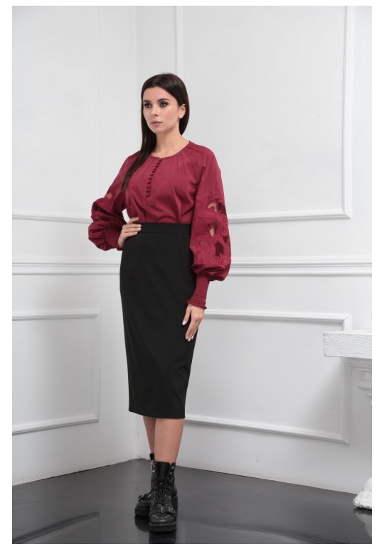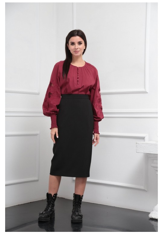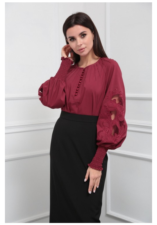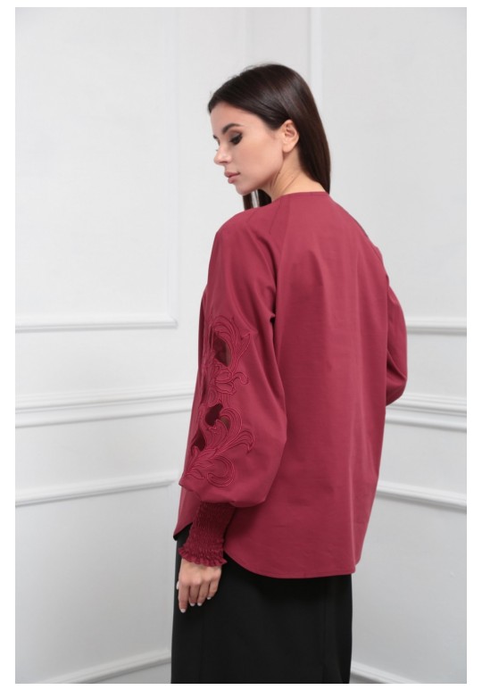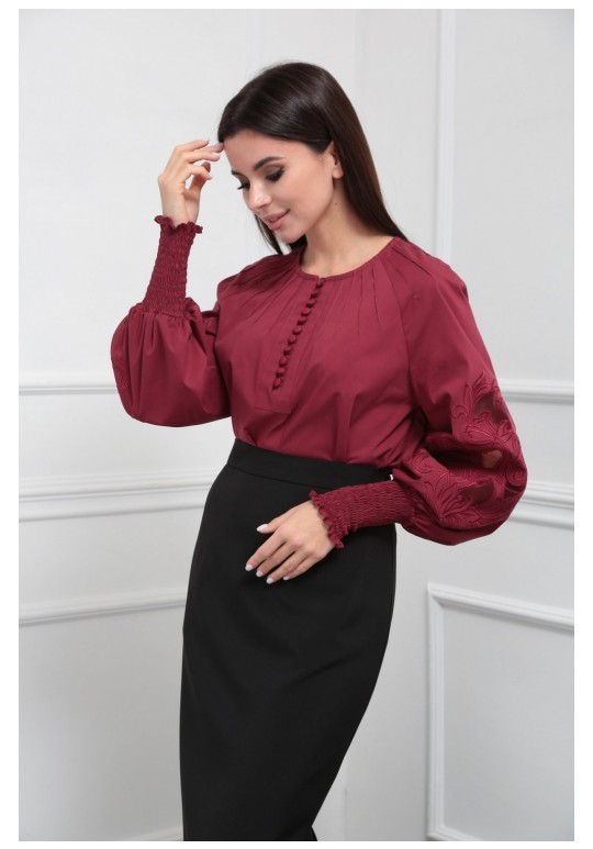 Блузка женская из лёгкой хлопковой ткани, прямого силуэта. Оригинальна в исполнении с художественной вышивкой по рукавам. По центру переда планка на 11 петель и столько же пуговиц. Рукав реглан, по низу рукава манжета присборена на эластичную тесьму (венгерку) для фиксации. Горловина округлой формы, по горловине изделия декоративные защипы .