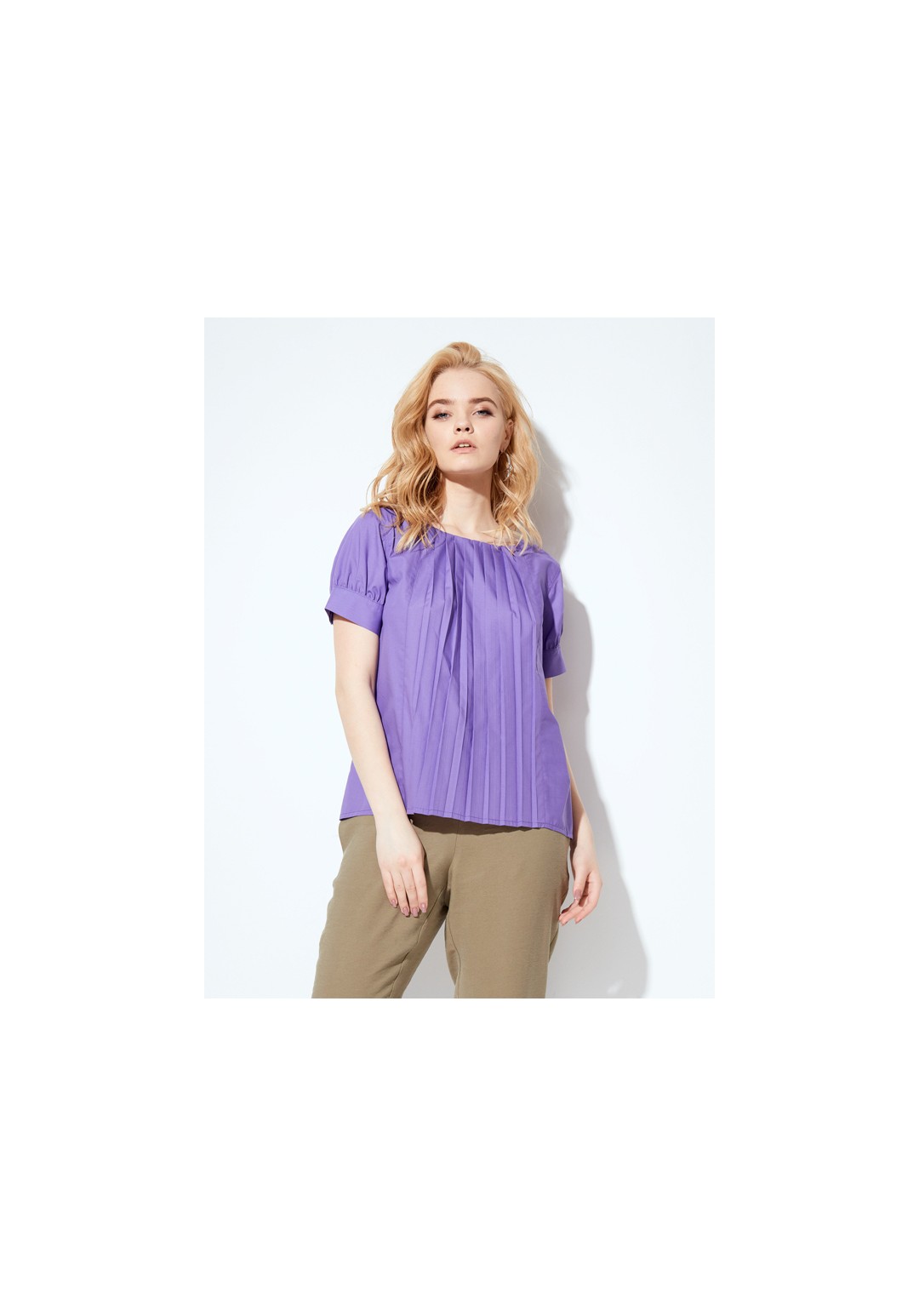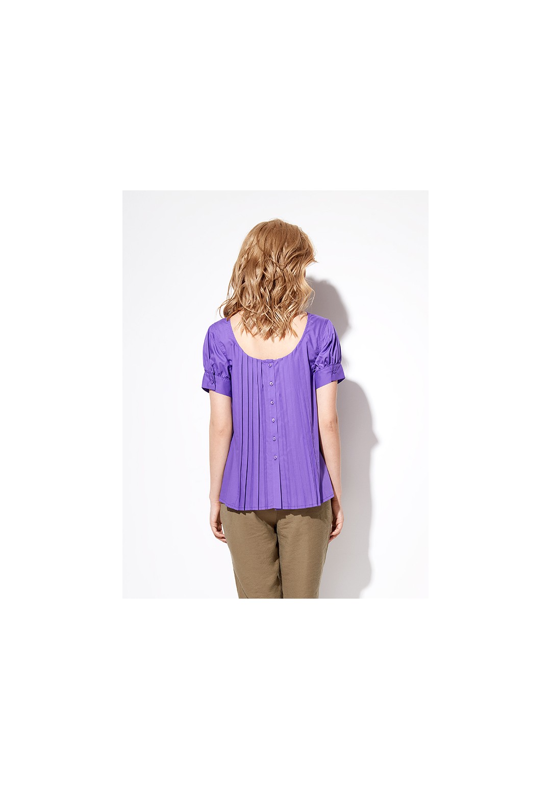 Блузка из текстильного блузочного полотна с короткими рукавами, складками, застежкой на пуговицы и круглым глубоким вырезом сзади.
