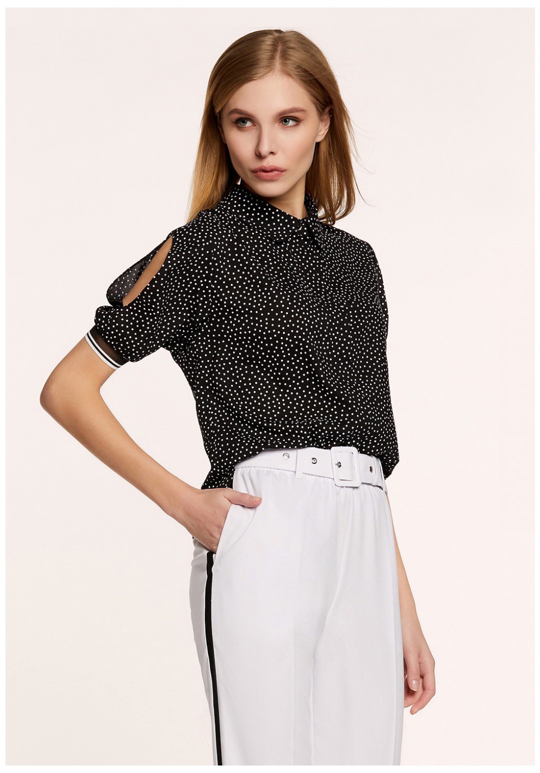 Элегантная блузка из ткани с принтом в мелкий горох, прямого кроя с разным уровнем переда и спинки. Легкость модели придают разрезы по рукавам. Перед с центральной потайной застежкой на петли и пуговицы. Рукава втачные со сборкой по низу и с контрастными притачными манжетами из трикотажной тесьмы. Воротник отложной с отрезной стойкой. Боковые швы заканчиваются разрезами.