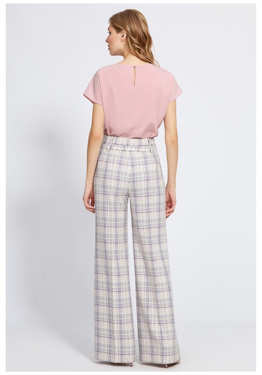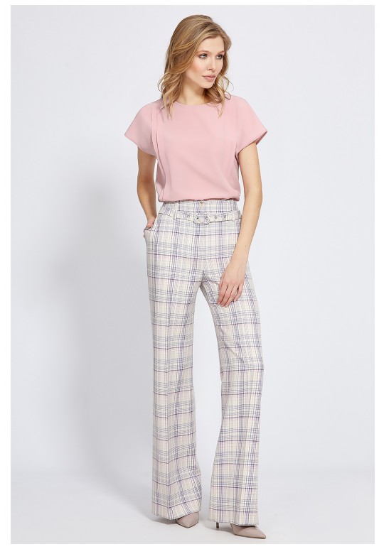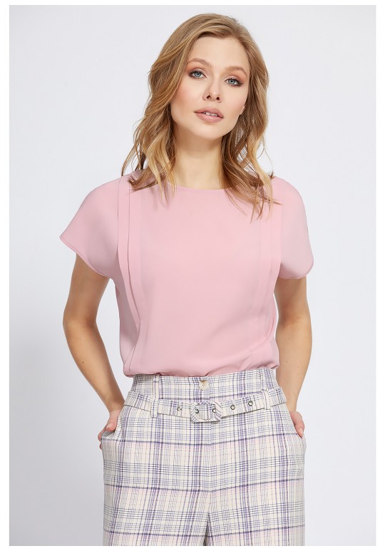 Однотонная блузка из лёгкого приятного материала, с округлой формой горловины и короткими цельнокроеными рукавами, украшена вертикальными складками в два ряда. Свободный крой позволяет чувствовать себя максимально комфортно, а каплевидная застёжка на навесную петлю и ювелирную пуговицу добавит удобства при носке. Блузка станет акцентной деталью ваших образов.