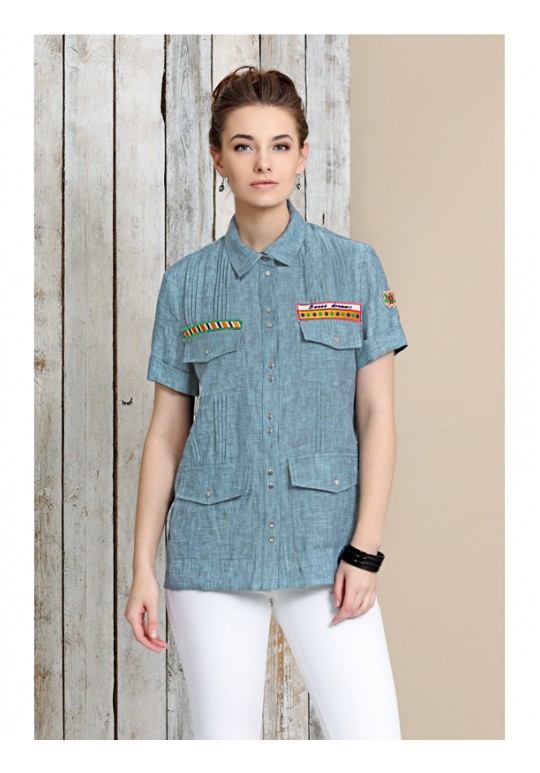 Рубашка-сафари свободного силуэта с защипами по передним полочкам и карманами, декорированная шевронами.