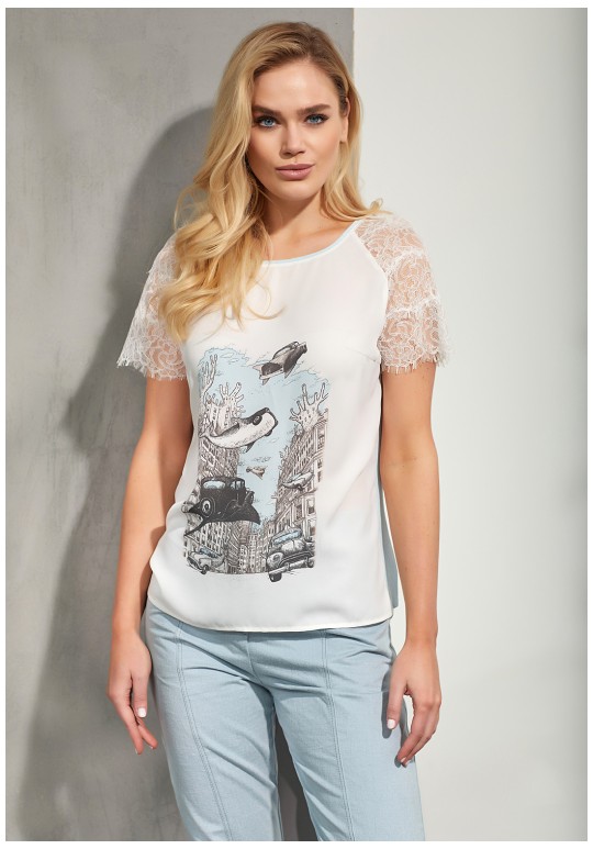 Стильная молодежная блуза из французского крепа. Модель свободной формы, рукав реглан из французского кружева. Перед модели декорирован стильной дизайнерской печатью.Рост 170 см.