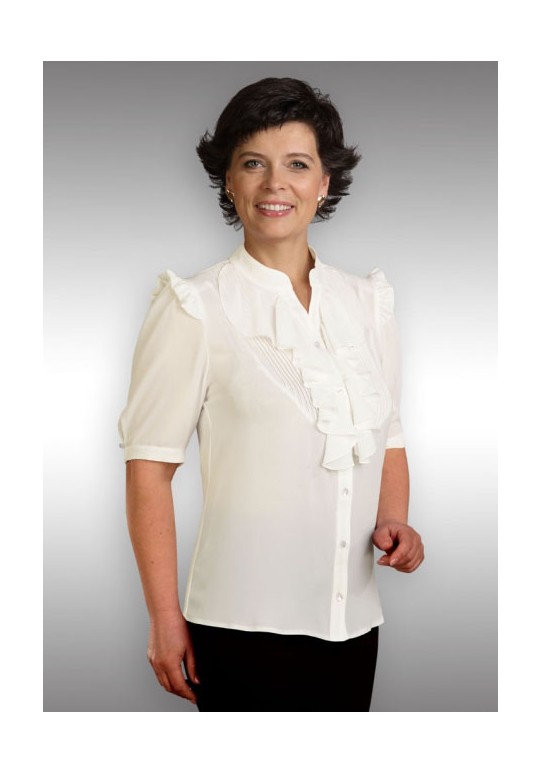 Блузка приталенного силуэта с центральной застежкой на планку. Воротник-стойка. Рукав втачной, на сборке по окату и отделочной рюшей на сборке. Рукав короткий, выше локтя, по центру низа рукава встречная складка с фиксированной пуговицей. На полочке кокетка закругленной формы и отстроченными складками шириной 3 мм. От стойки и вдоль планки идут к низу воланы.
