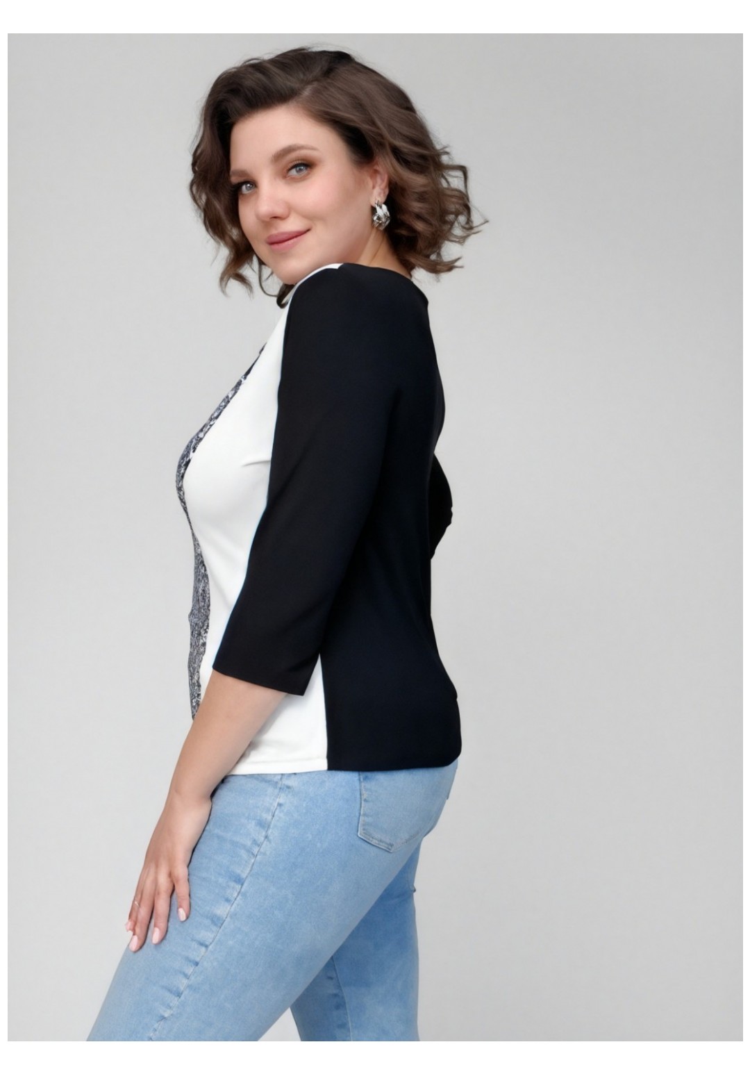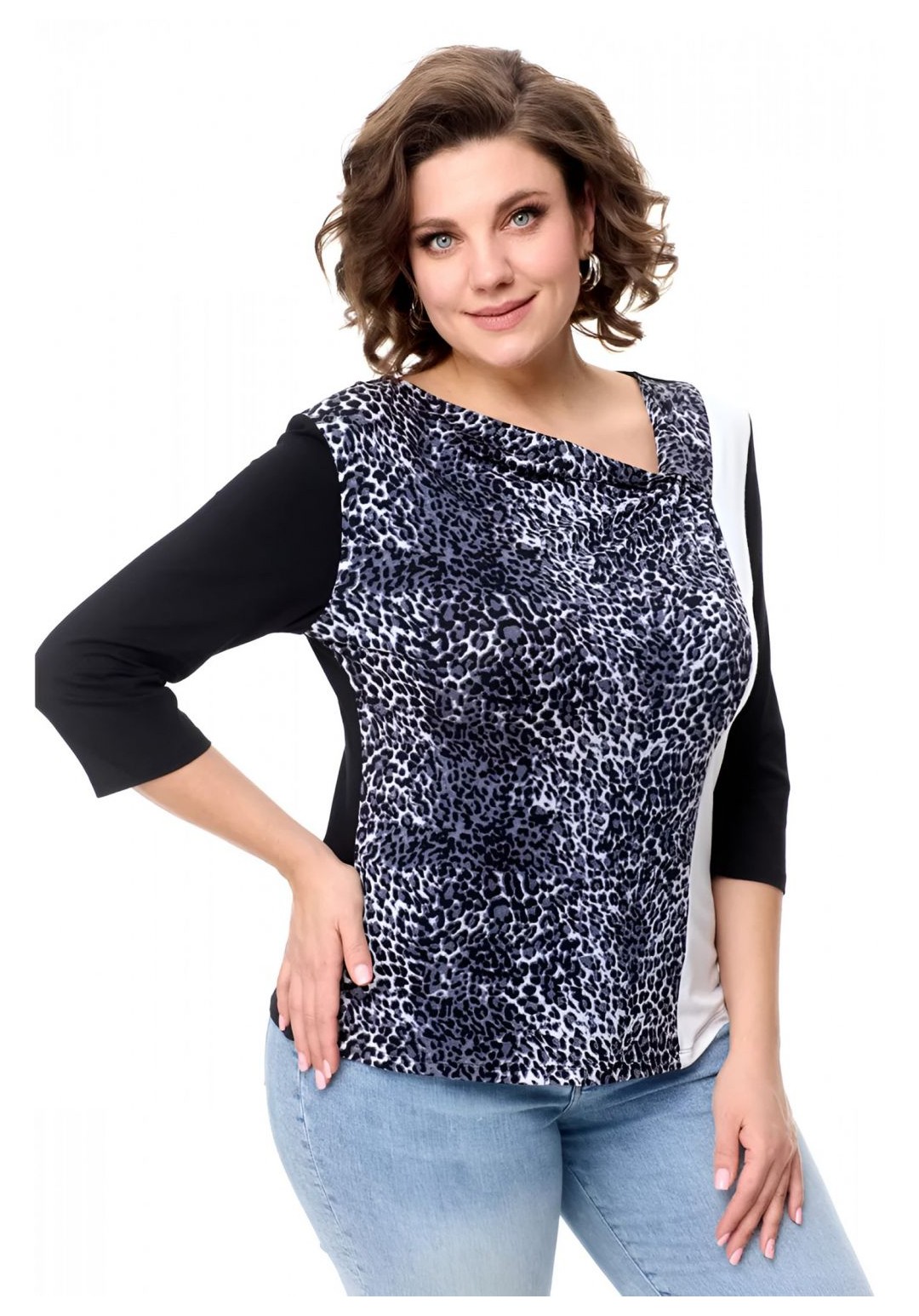 Блузка Abbi 4029 (48-56) (принт - Леопард) Стильная женская блуза из ультрамягкого трикотажа — дизайнерская модель с эффектной драпировкой и сложным графичным кроем. Комфорт и свойства ткани Главное преимущество этой модели — высокоэластичный мягкий трикотаж на основе вискозы. Ткань обладает исключительной мягкостью, она очень приятна на ощупь и дарит ощущение второй кожи. Благодаря высокому содержанию спандекса (10%) материал невероятно эластичен: он легко тянется, обеспечивая идеальную посадку на любой тип фигуры, и мгновенно восстанавливает форму, не деформируясь при носке. Ключевая особенность: Сложная драпировка Изюминка блузы — декоративный элемент в области плеча. Асимметричный вырез горловины дополнен изысканным узлом-драпировкой, который создает мягкие, струящиеся складки. Этот прием не только добавляет образу французского шика, но и деликатно скрывает нюансы в области груди и плечевого пояса. Особенности конструкции Модель продумана до мелочей для создания стройного силуэта: • Цельнокроеные рукава: Отсутствие плечевого шва в сочетании с эластичностью ткани гарантирует идеальную посадку на руки любой полноты. Рукав длиной 3/4 открывает запястья, добавляя образу легкости. • Вертикальный колор-блок: Передняя часть состоит из принтованной леопардовой панели и контрастной белой вставки. Такое деление визуально режет объем, делая фигуру стройнее. • Лаконичная спинка: Выполнена в глубоком черном цвете, что создает аккуратный и сдержанный вид сзади. Назначение Блуза универсальна: мягкость трикотажа делает её идеальной для повседневной носки, а необычный крой и трендовый принт позволяют использовать её как основу для праздничного или делового образа. Технические характеристики: • Состав: 90% вискоза, 10% спандекс. • Ткань: мягкий трикотаж, высокая степень эластичности. • Рукав: цельнокроеный, 3/4. • Особенности: асимметричная горловина с декоративной драпировкой. • Рост модели: 172 см. • Размер на фото: 52. • Производство: Беларусь (бренд Abbi). Видеоролик: https://www.youtube.com/watch?v=N1jz6MUm_MU