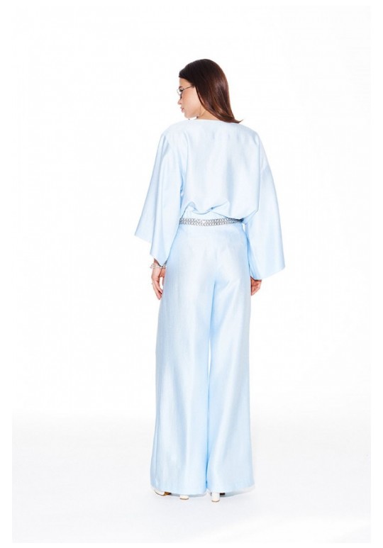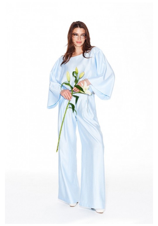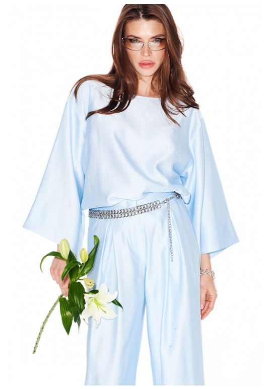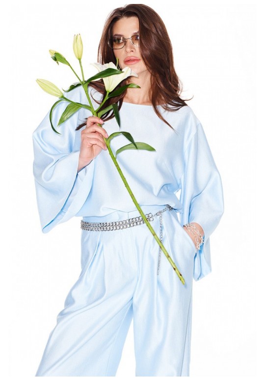 Блузка из костюмно-плательной ткани, свободного объема, прямого силуэта, с круглым вырезом горловины. Перед с нагрудными вытачками. Спинка цельная. Боковые швы заканчиваются разрезами. Рукав 3/4, втачной, одношовный, широкий.