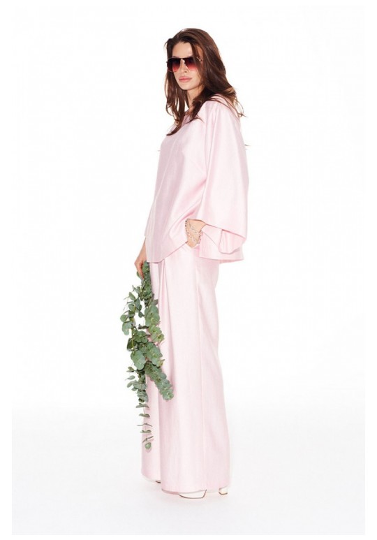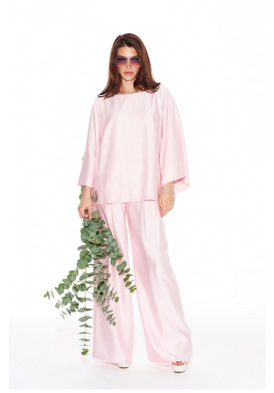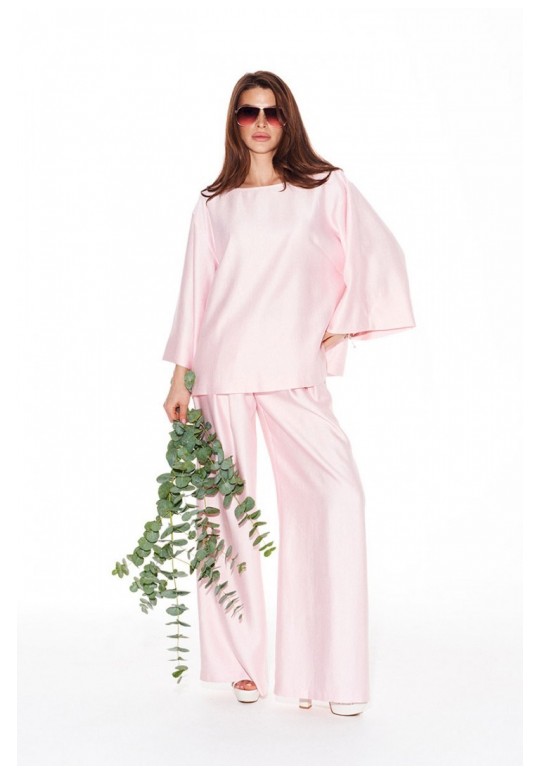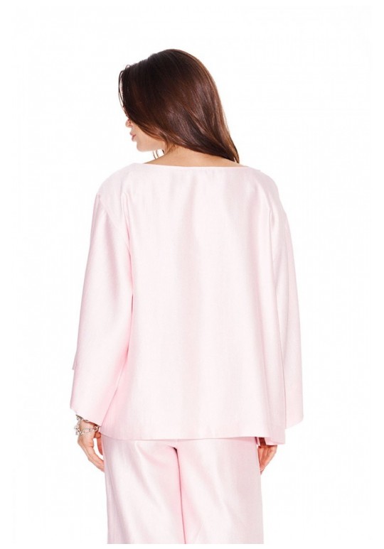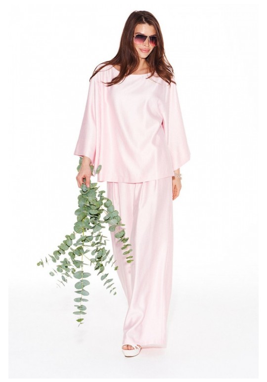 Блузка из костюмно-плательной ткани, свободного объема, прямого силуэта, с круглым вырезом горловины. Перед с нагрудными вытачками. Спинка цельная. Боковые швы заканчиваются разрезами. Рукав 3/4, втачной, одношовный, широкий.