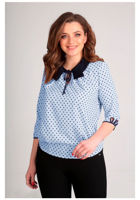 Блуза женская, свободного силуэта, фиксированная по линии бедер. Воротник на стойке, впереди отложной в виде крупных, встречных складок, а по спинке отлеты воротника раскладываются в стороны. Впереди у горловины окантовывается «слезка» и воротник завязывается шнурами. Рукав длиной ¾, низ рукава окантован отделочной тканью, так же окантованы «слезки» низа рукава по три на каждом. Низ изделия окантован высокими защипами, по 4 на спинке и полочке. От горловины на полочке идут встречные складки к линии груди. Воротник и окантовка из отделочной ткани.
