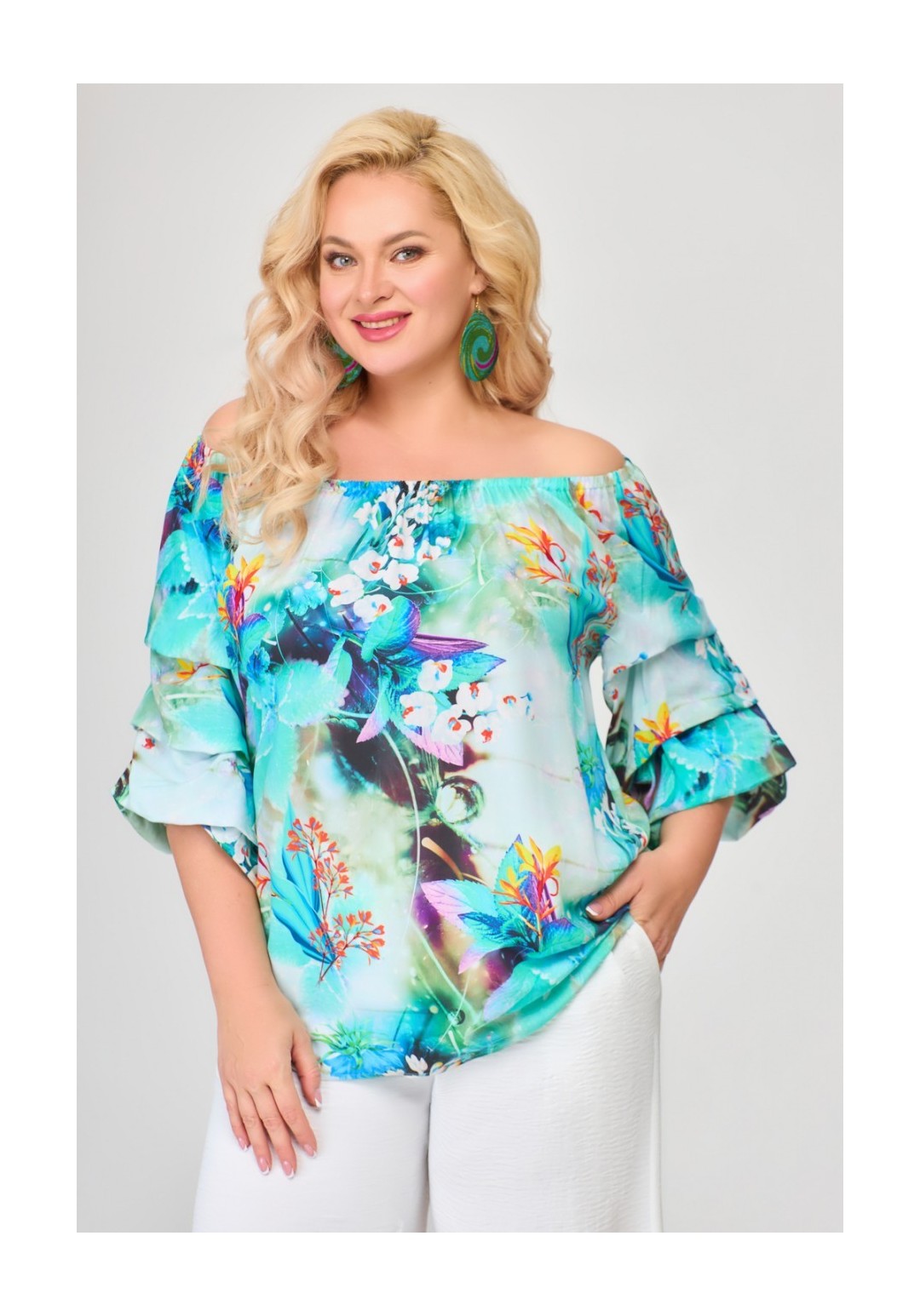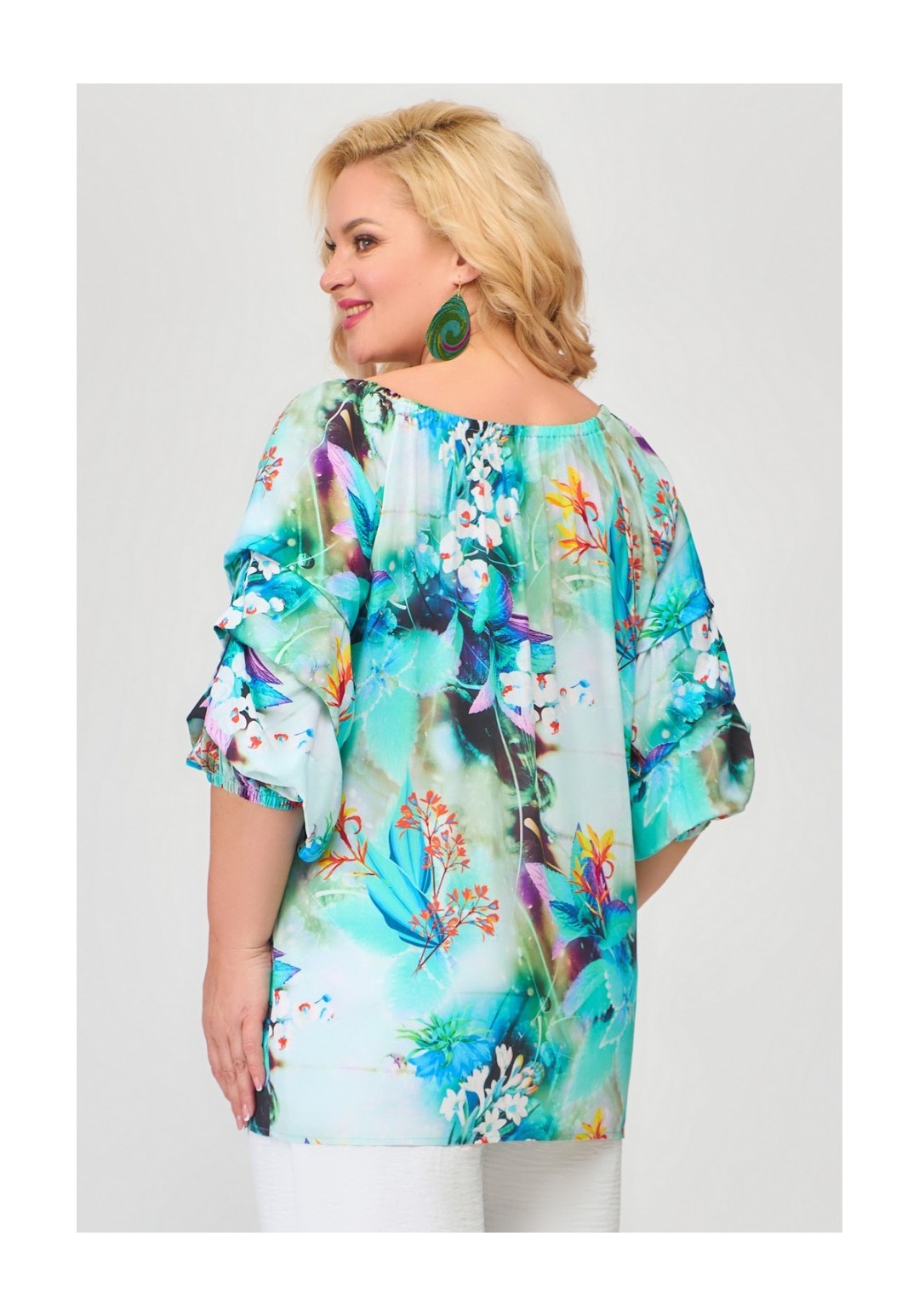 Блузка женская свободного кроя, с рукавом реглан, со сборкой по горловине. Рукав объемный, драпированный мягкими складками. Низ рукава и вырез горловины присобран на эластичную тесьму. Длина спинки блузки от шейного позвонка: 73 см Длина рукава от горловины: 43 см