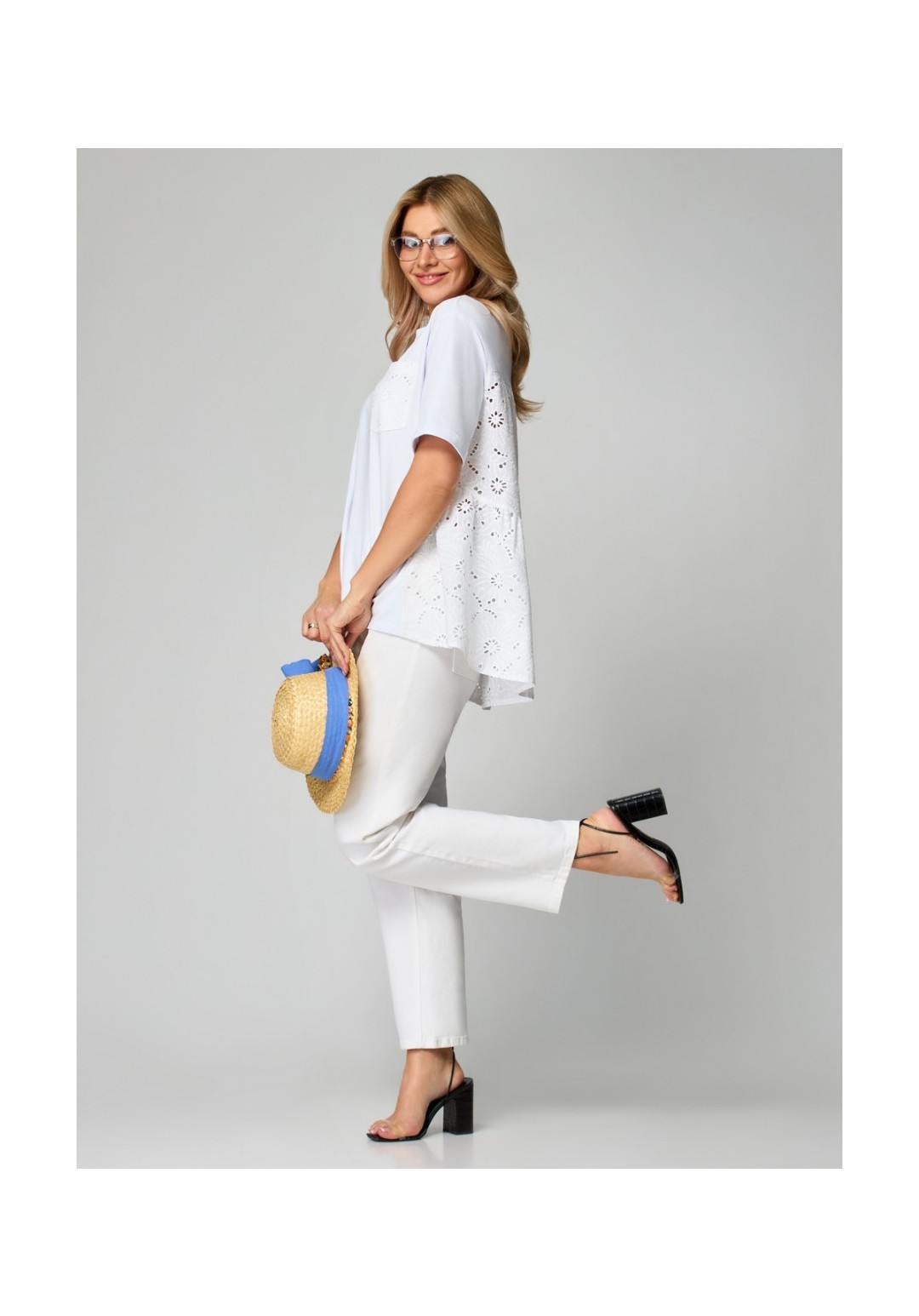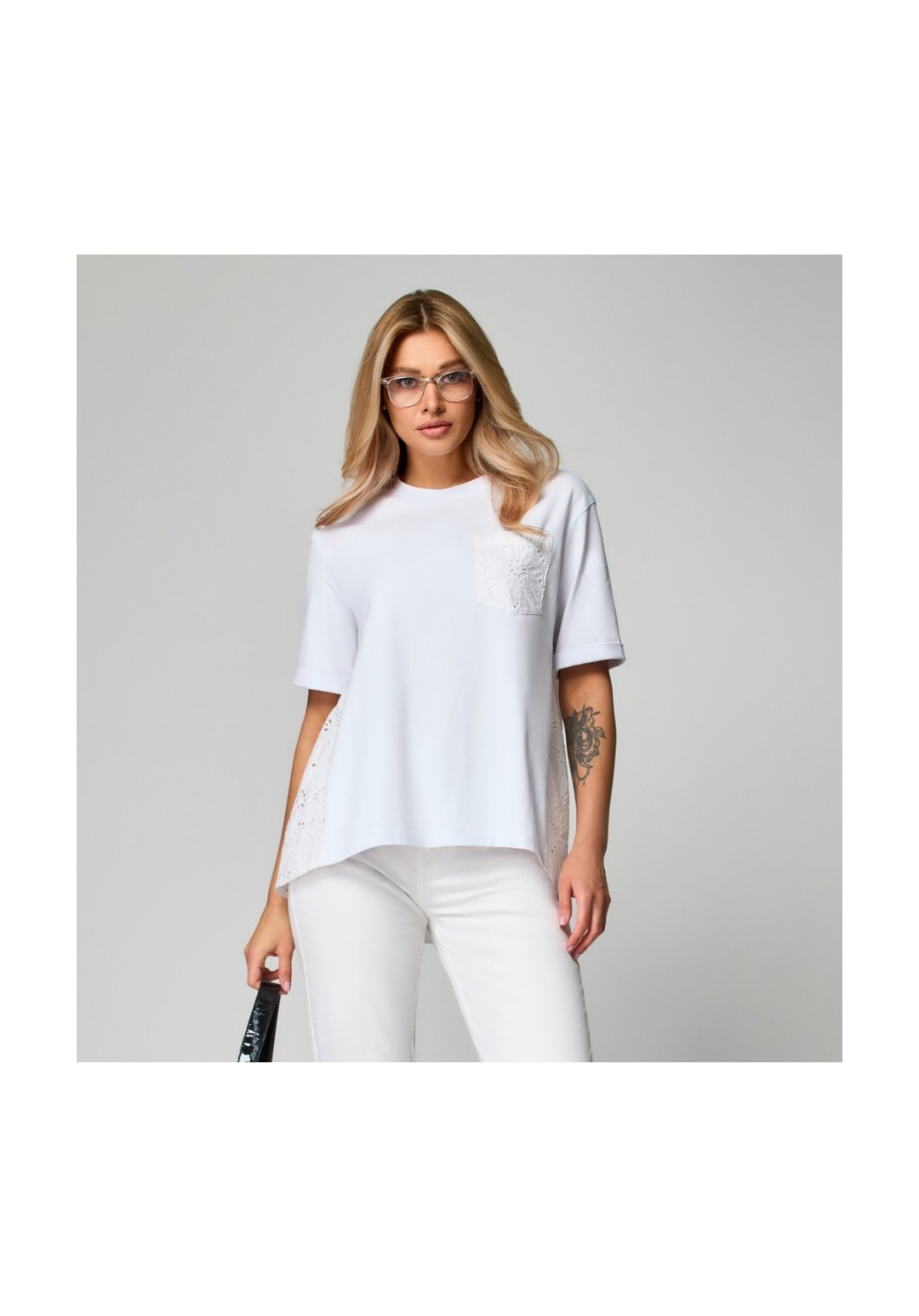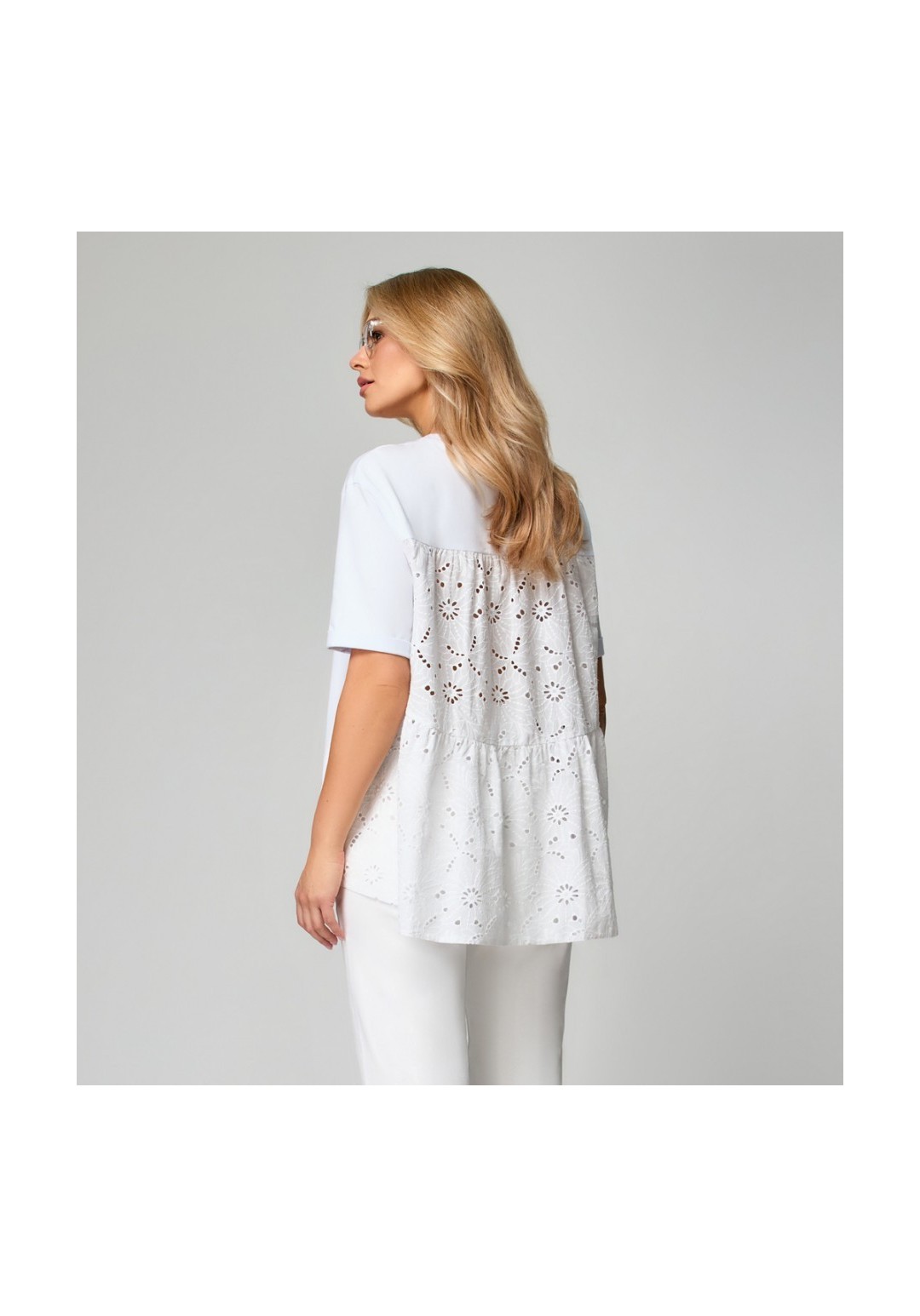 Блузка женская расширенная к низу с втачным спущенным рукавом. Горловина обработана бейкой. По левой части переда накладной карман. Спинка с кокеткой в верхней части, нижняя часть спинки из двух деталей со сборкой. Линия бокового шва спинки слегка смещена на деталь переда. Рукав короткий с отворотом. Нижняя часть спинки и накладной карман выполнены из хлопка шитье. Длина по спинке: 48-50-52 размер 74 см 54-56-58 размер 77 см 60-62 размер 80 см Длина рукава от высшей точки горловины: 48-50-52 размер 40 см 54-56-58 размер 41 см 60-62 размер 43 см
