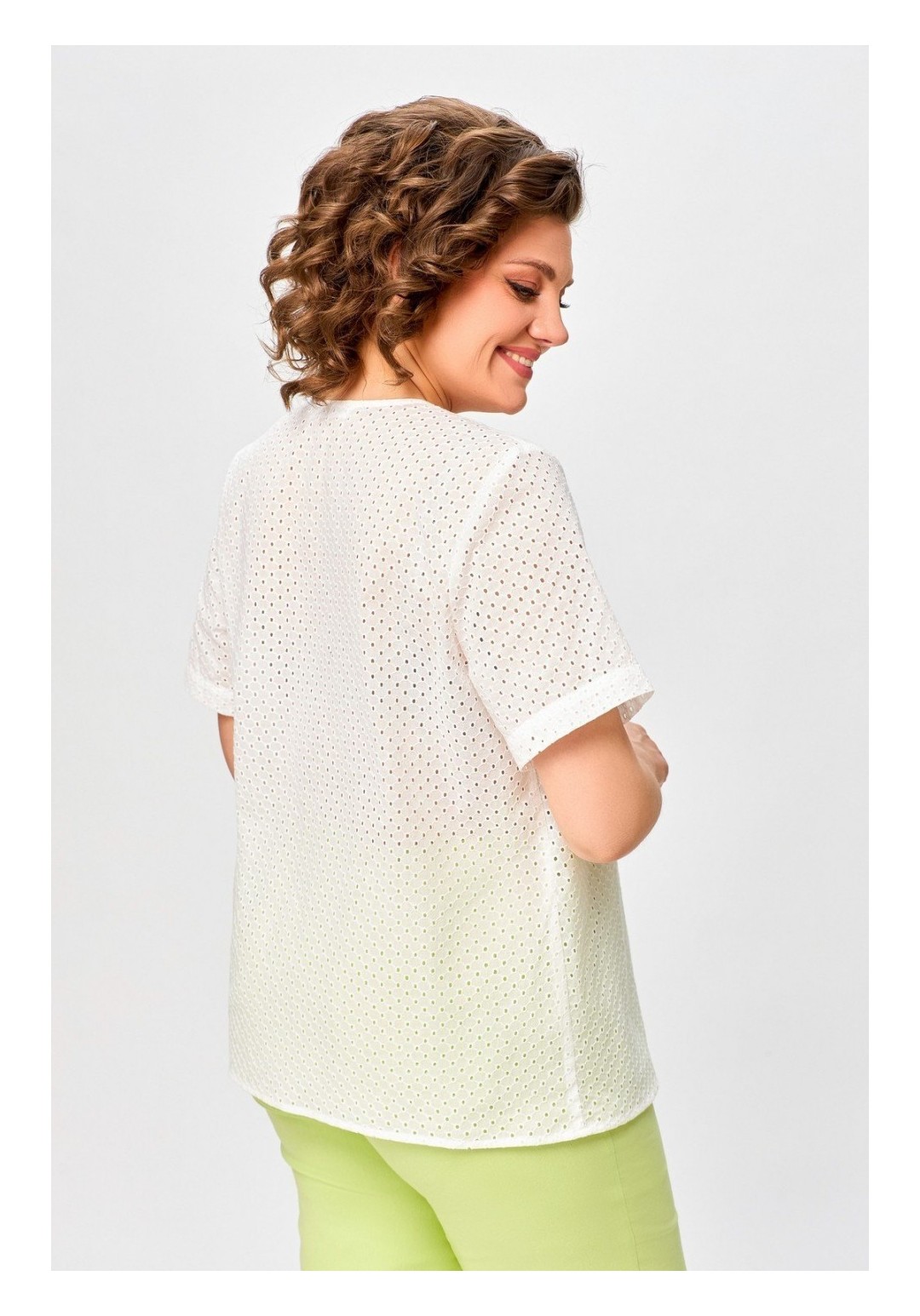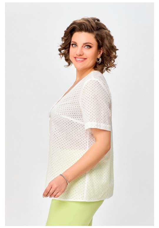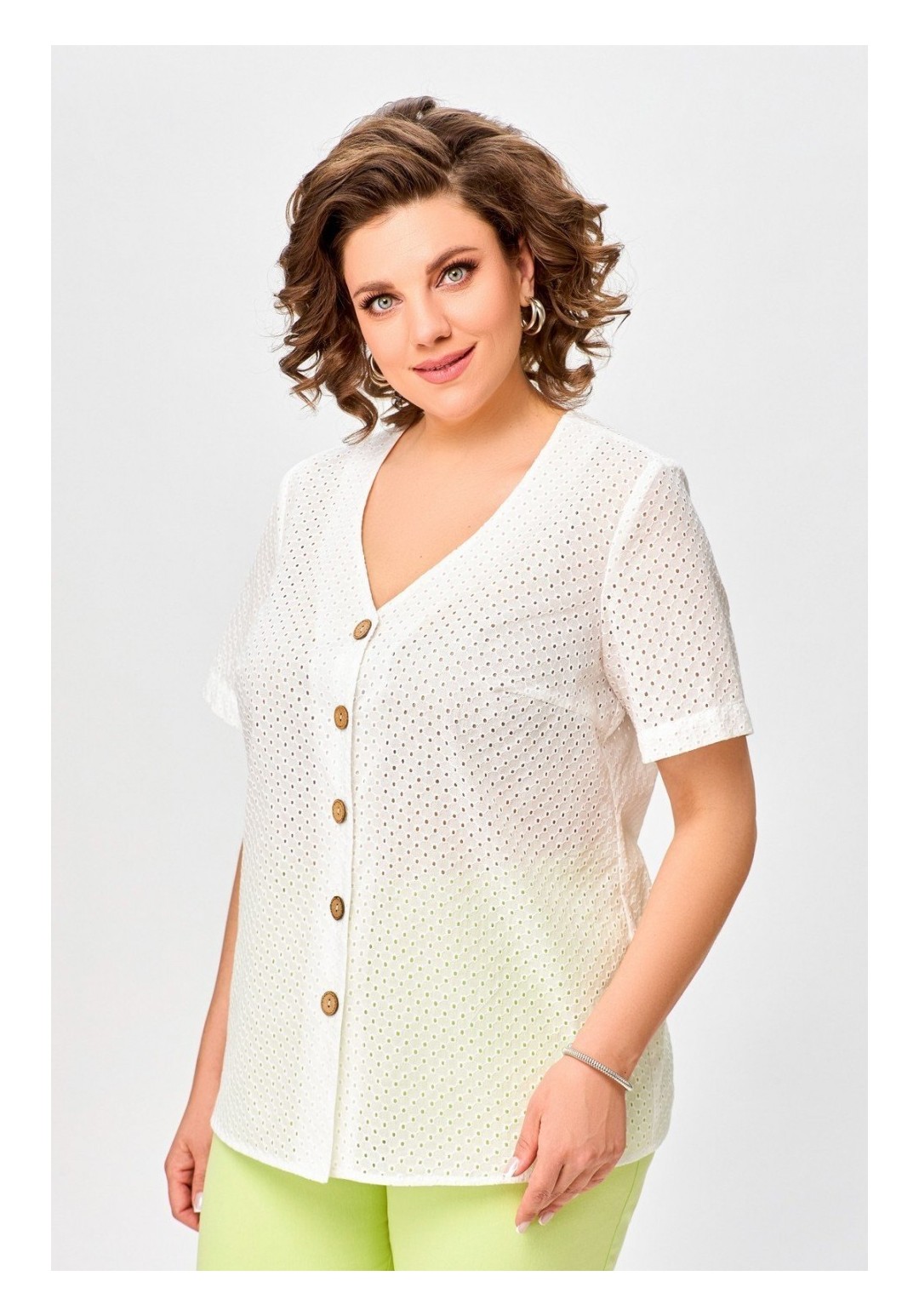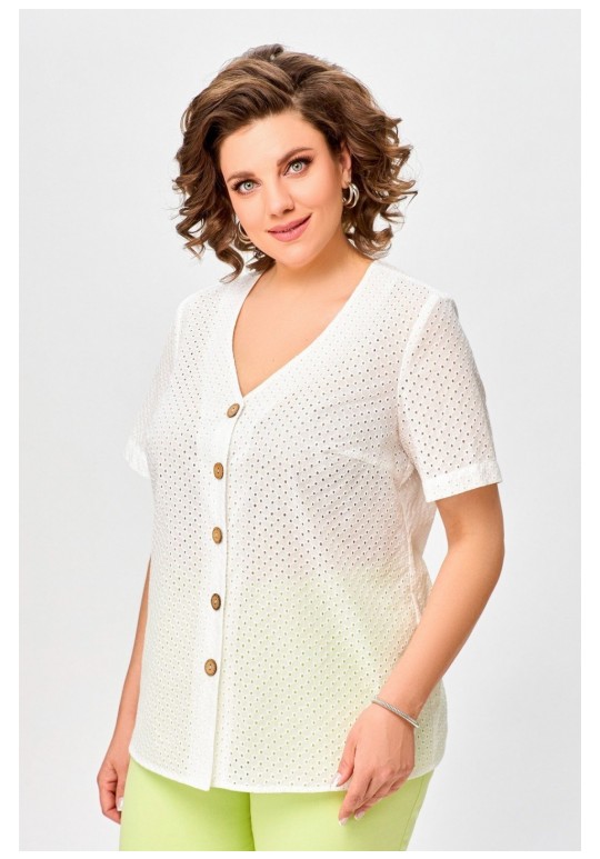 Блузка женская, прямого силуэта из хлопчатобумажной лёгкой ткани ришелье. Застёжка центральная на петли и декоративные пуговицы. По переду блузы обработаны нагрудные выточки. Спинка цельнокроеная. Горловина с V-образным вырезом. Рукав втачной короткий. Длина рукава 48р.-58р. - 26см. (+/- 1 см.),60р.-64р. – 28 см.(+/-1 см.) Длина по спинке 48р.-58р. – 66 см (+/- 1 см), 60р.-64р. – 69 см.( +/- 1 см.)