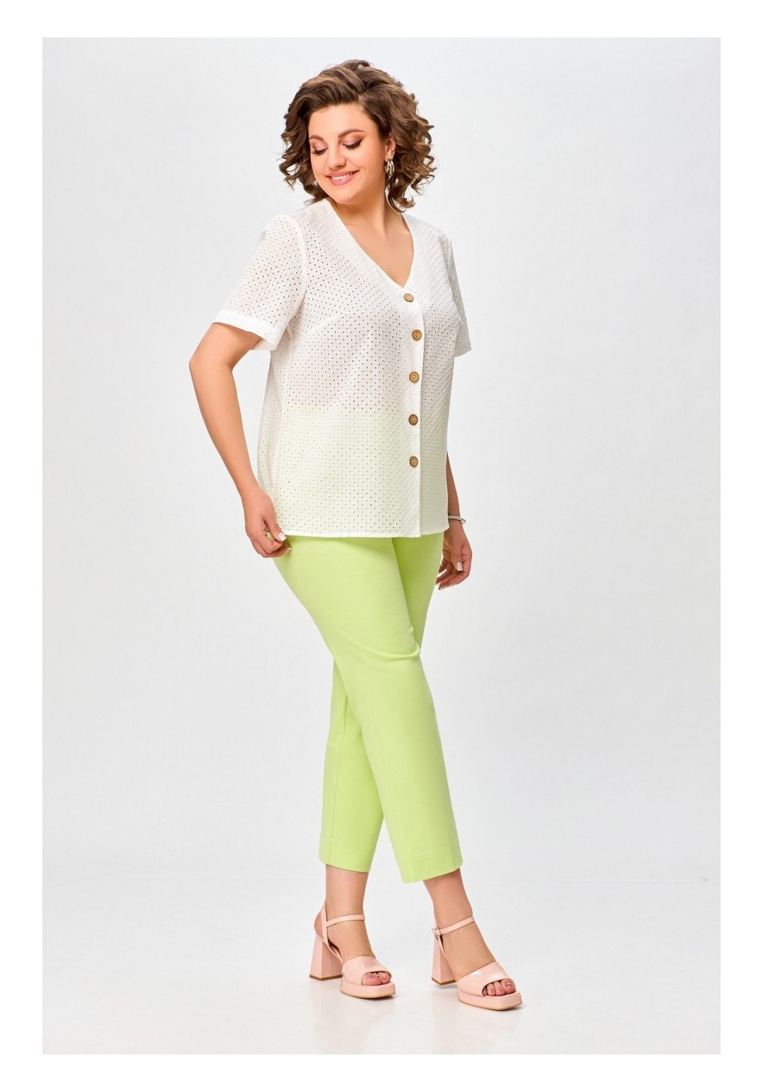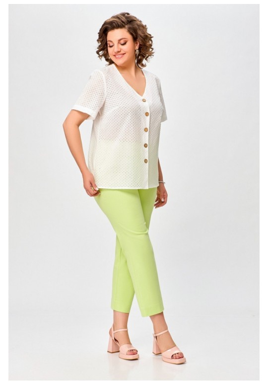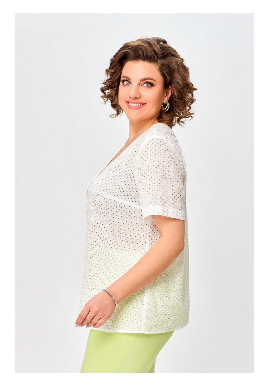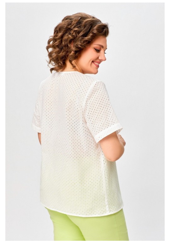 Блузка женская, прямого силуэта из хлопчатобумажной лёгкой ткани ришелье. Застёжка центральная на петли и декоративные пуговицы. По переду блузы обработаны нагрудные выточки. Спинка цельнокроеная. Горловина с V-образным вырезом. Рукав втачной короткий. Длина рукава 48р.-58р. - 26см. (+/- 1 см.),60р.-64р. – 28 см.(+/-1 см.) Длина по спинке 48р.-58р. – 66 см (+/- 1 см), 60р.-64р. – 69 см.( +/- 1 см.)