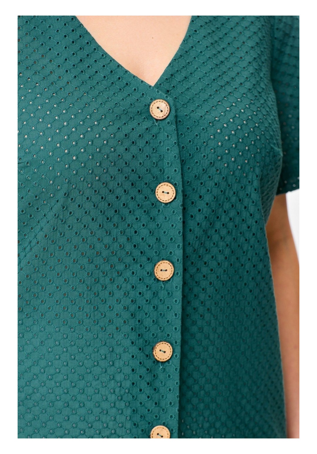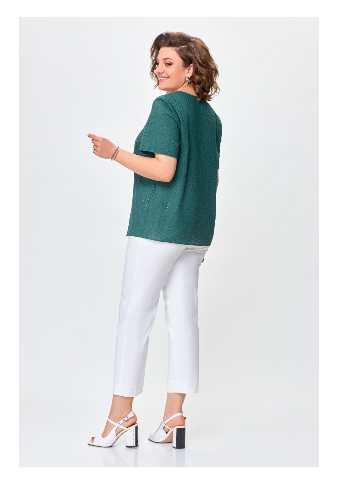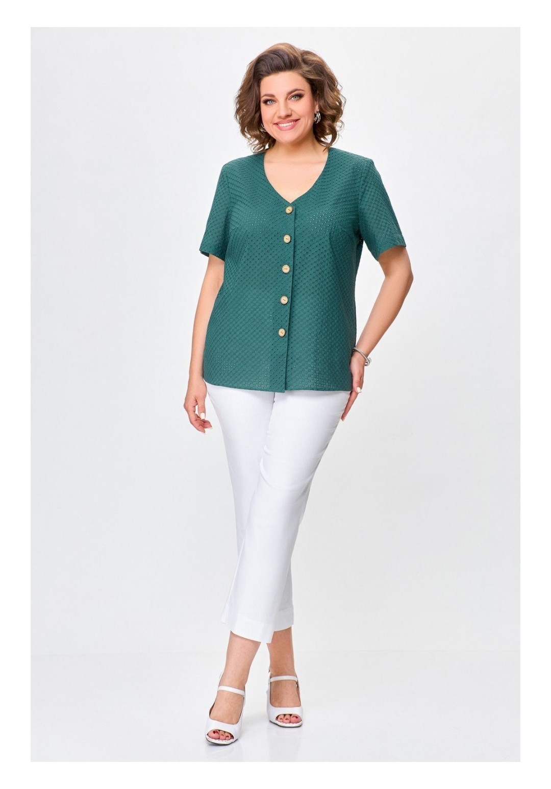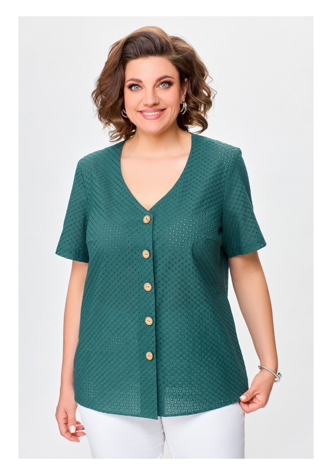 Блузка женская, прямого силуэта из хлопчатобумажной лёгкой ткани ришелье. Застёжка центральная на петли и декоративные пуговицы. По переду блузы обработаны нагрудные выточки. Спинка цельнокроеная. Горловина с V-образным вырезом. Рукав втачной короткий. Длина рукава 48р.-58р. - 26см. (+/- 1 см.),60р.-64р. – 28 см.(+/-1 см.) Длина по спинке 48р.-58р. – 66 см (+/- 1 см), 60р.-64р. – 69 см.( +/- 1 см.)