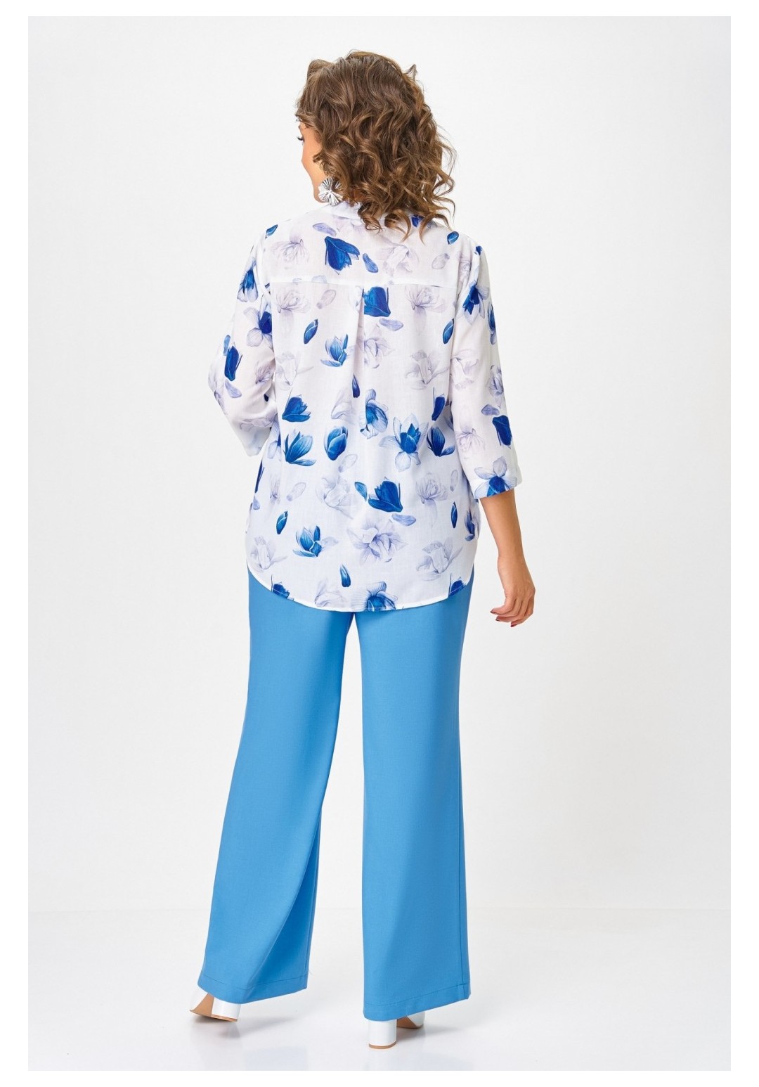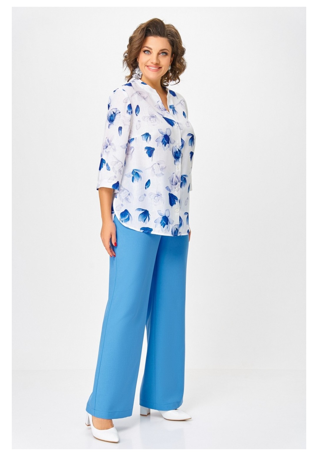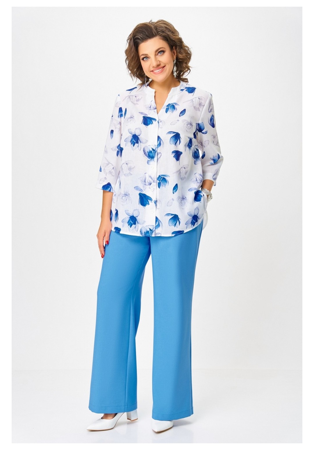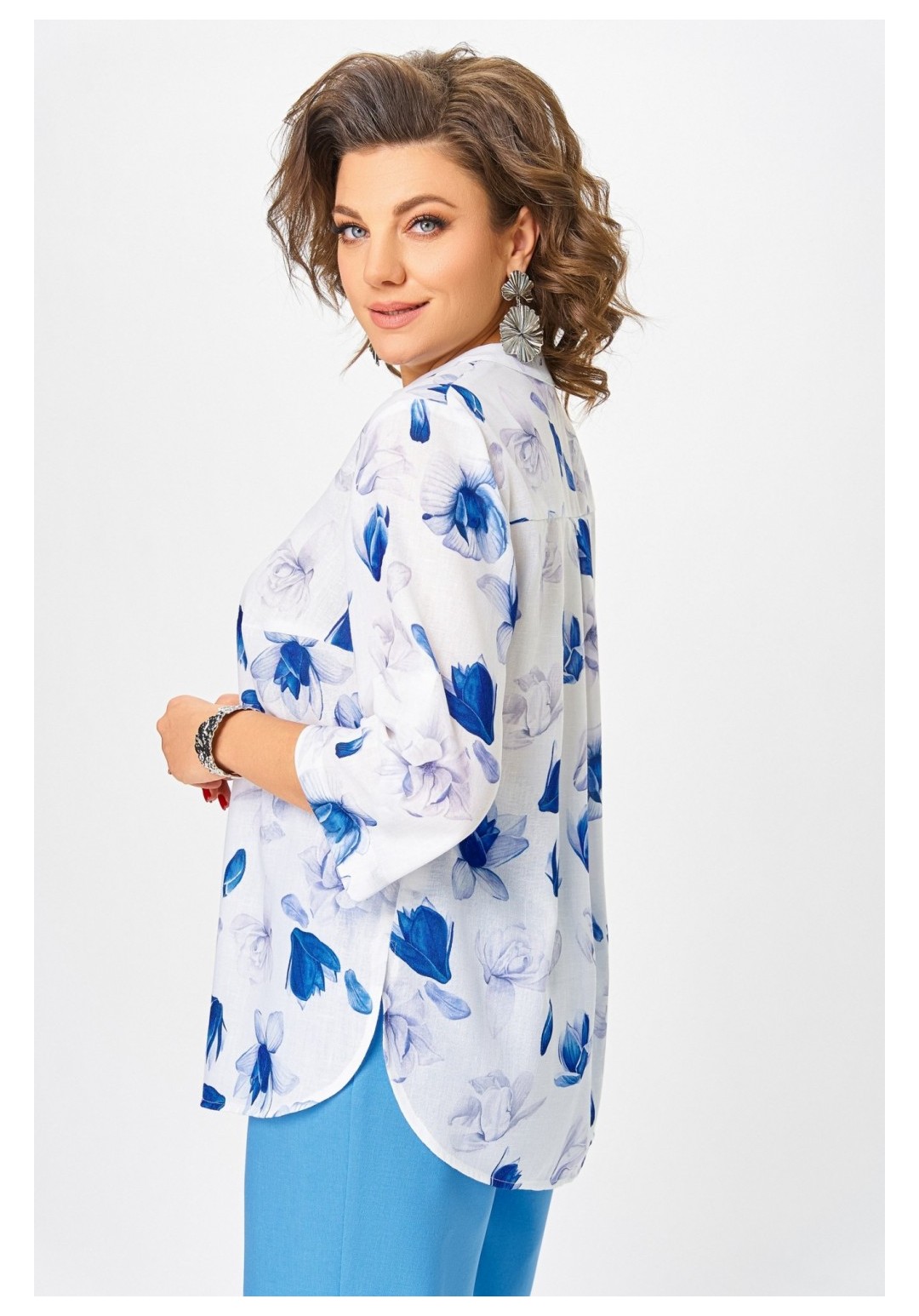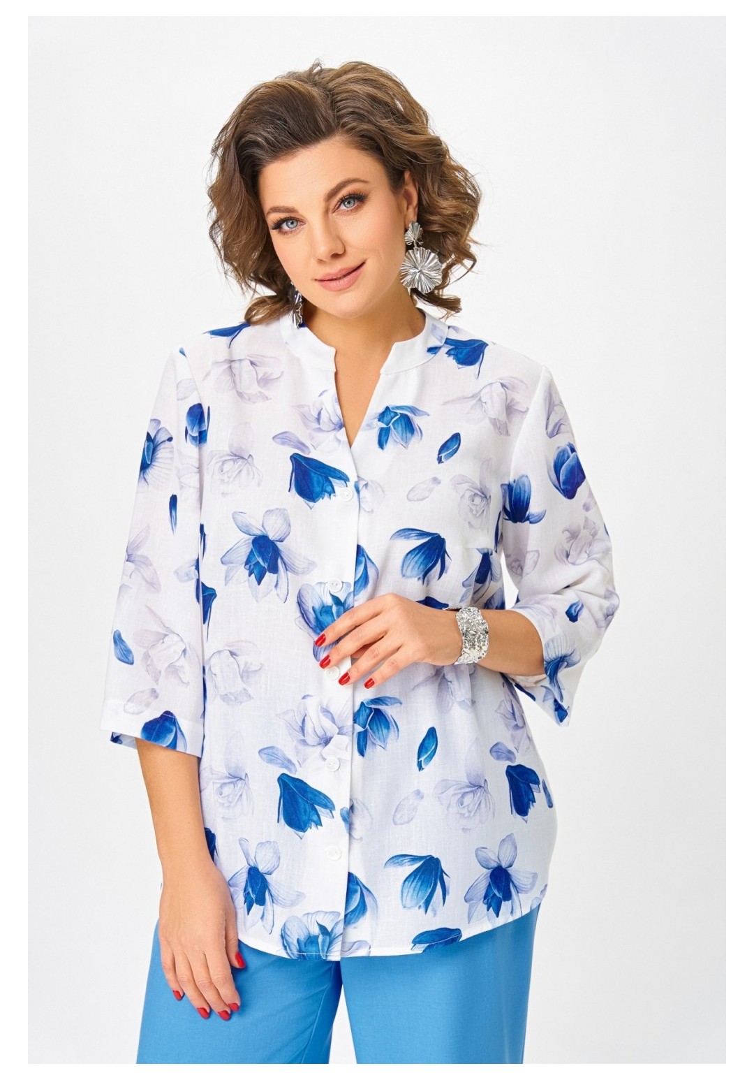 Блузка женская свободного силуэта с центральной застёжкой на петли и декоративные пуговицы, выполнена из льняной ткани с добавлением вискозы. Полочка с нагрудными вытачками. Спинка с отрезной кокеткой и бантовой складкой. Горловина V-образной формы с притачной стойкой. Рукав втачной, одношовный, прямой длиной ¾ с патой и пуговицей, которыми регулируется длина. Низ полочки и спинки закруглённой формы с разрезами по боковым швам. Длина по центру спинки в размерах 52.54,56 – 71 (+/-1) см. в размерах 58.60,62 – 74 (+/-1) см. Длина рукава – 44 см.
