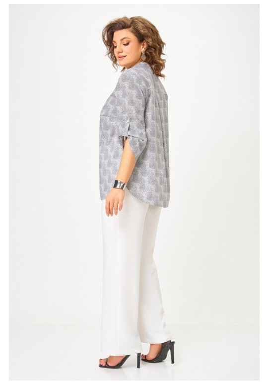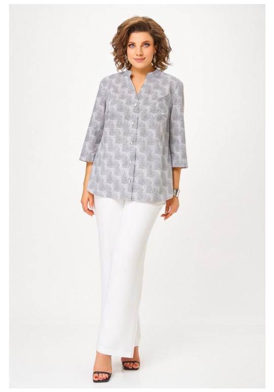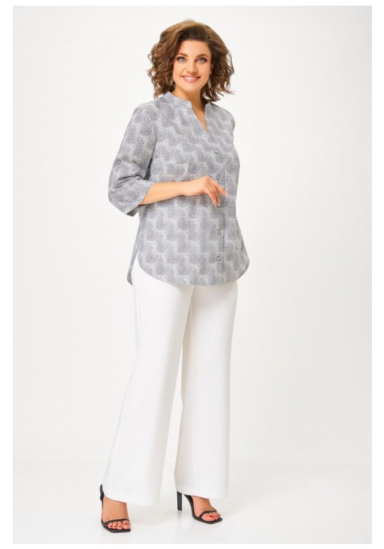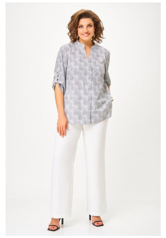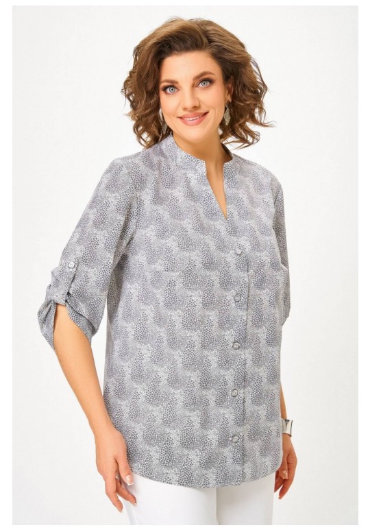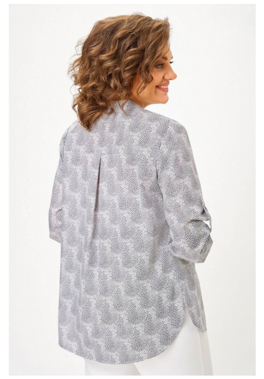 Блузка женская свободного силуэта с центральной застёжкой на петли и декоративные пуговицы, выполнена из хлопковой ткани. Полочка с нагрудными вытачками. Спинка с отрезной кокеткой и бантовой складкой. Горловина V-образной формы с притачной стойкой. Рукав втачной, одношовный, прямой длиной ¾ с патой и пуговицей, которыми регулируется длина. Низ полочки и спинки закруглённой формы с разрезами по боковым швам. Длина по центру спинки в размерах 52.54,56 – 71 (+/-1) см. в размерах 58.60,62 – 74 (+/-1) см. Длина рукава – 44 см.