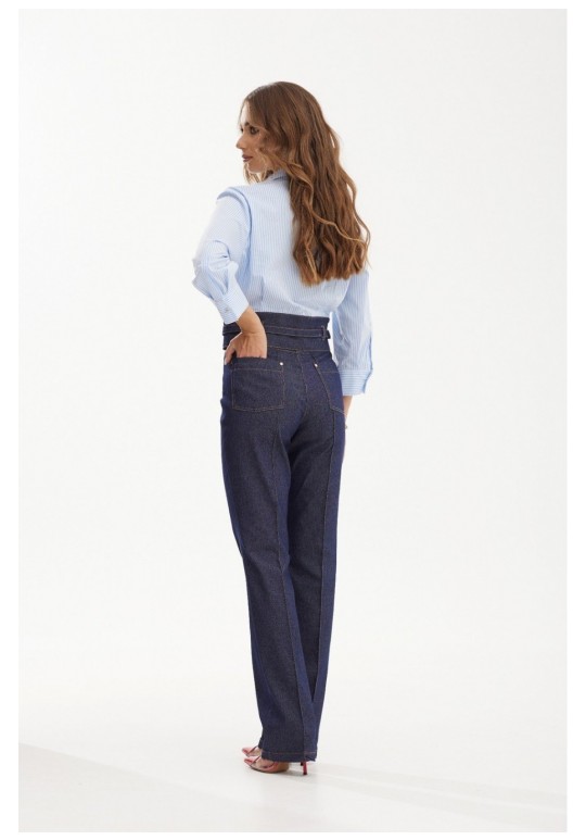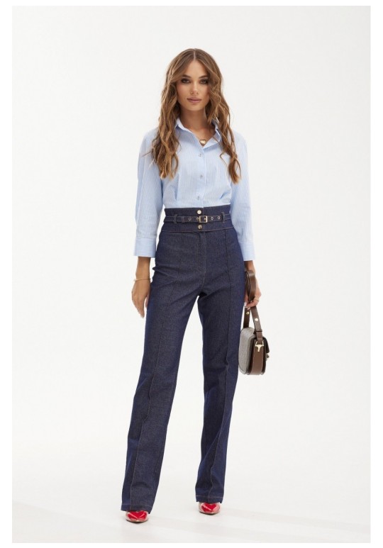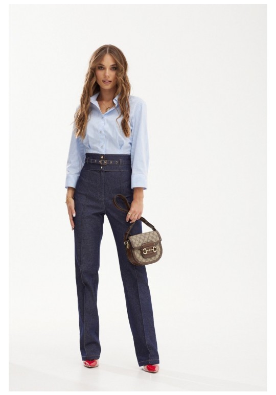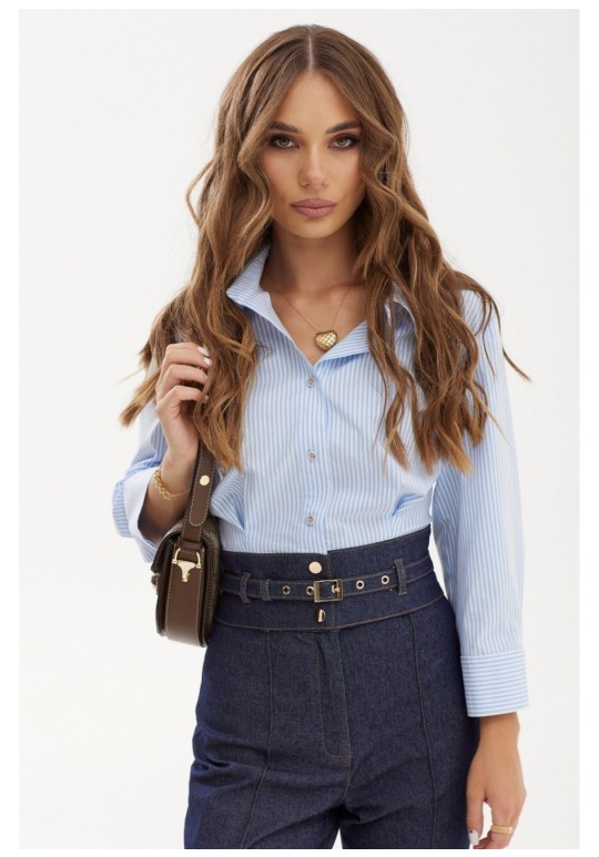 Блузка, укороченная из хлопковой ткани. По низу блузки кокетка-пояс из джинсовой ткани. Застежка по переду на пуговицы и кнопки на поясе. Воротник рубашечный. Рукав ¾ с манжетой понизу. Талия фиксируется съемным ремнем. Рукав 47 см. ширина плеча - 13 см..