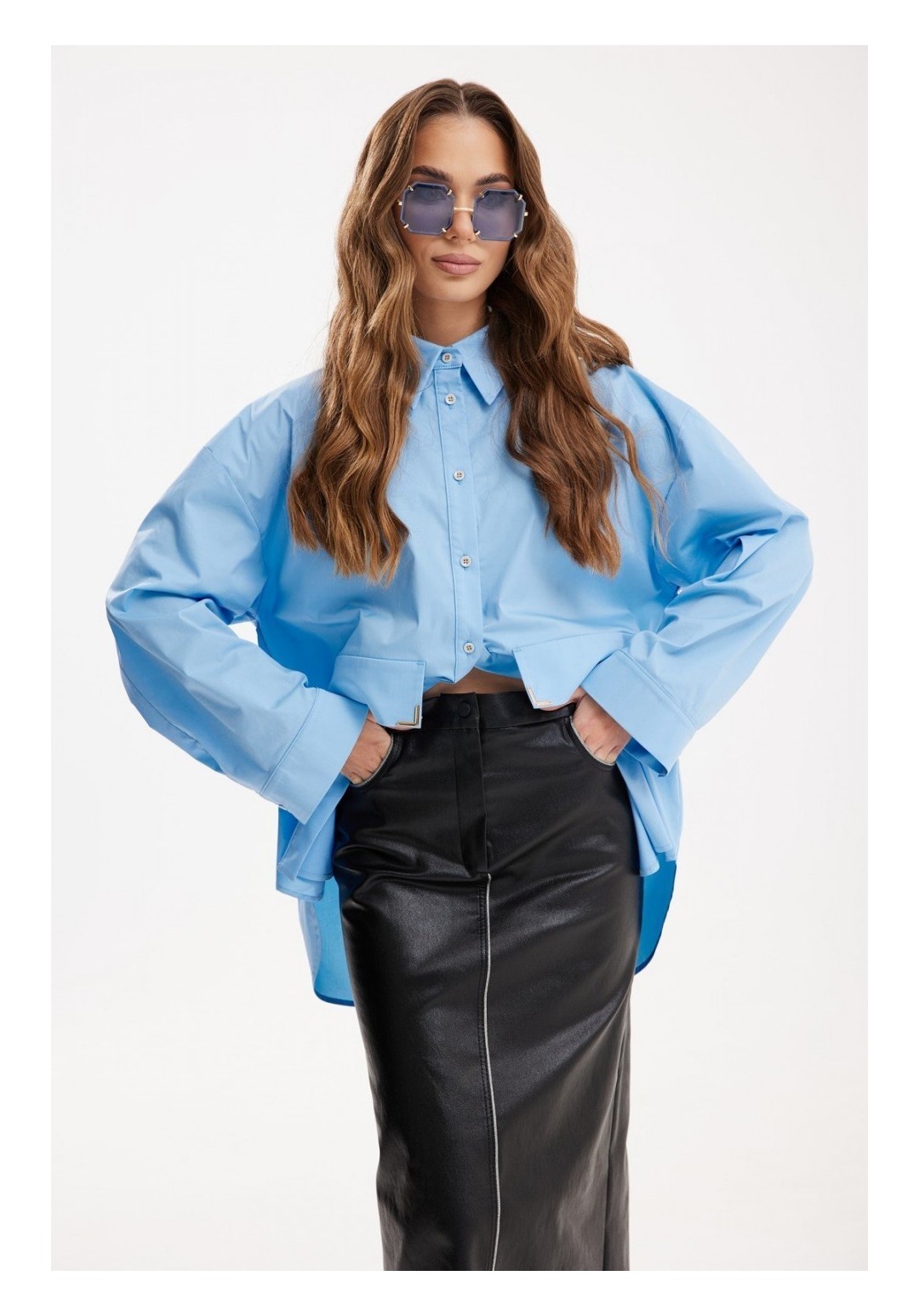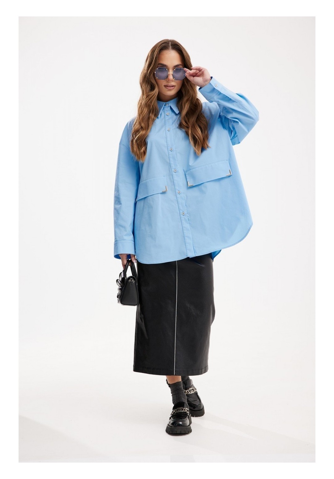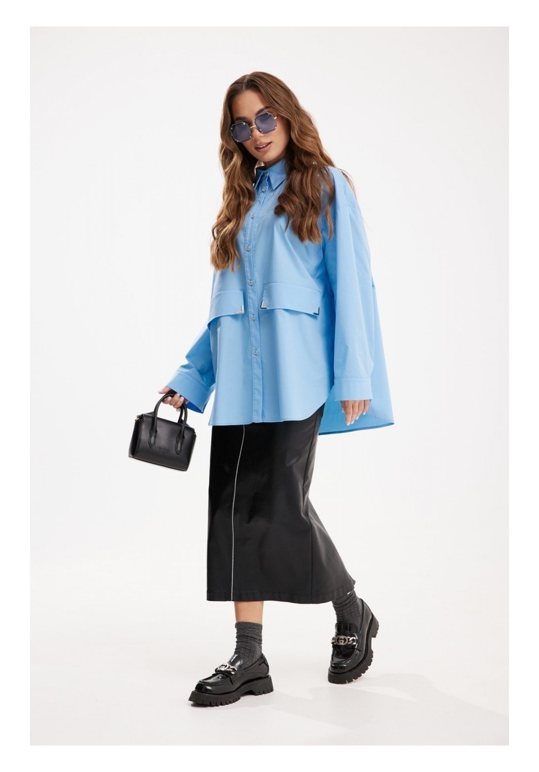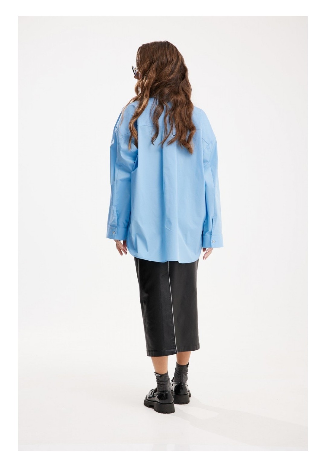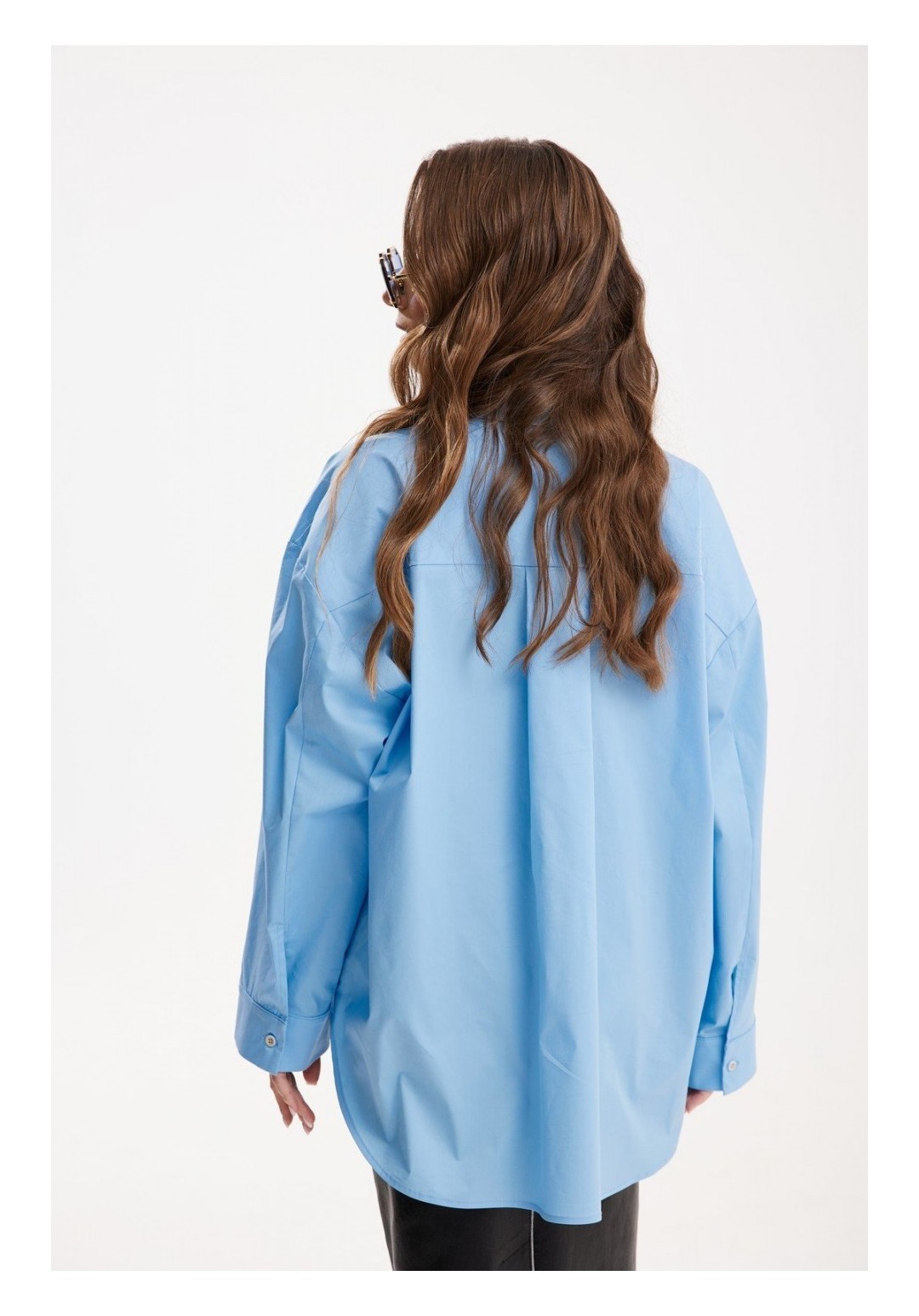 Эта удлиненная блузка свободного кроя представлена в нежном голубом цвете. Изюминкой модели является рубашечный воротник и застежка на петли и пуговицы, дополненная металлической отделкой на клапанах на передней части. Детали такие как кокетка и нежные складки по спинке придают блузе изысканный вид. Рукава свободного покроя с манжетами на пуговице и петле обеспечивают комфорт и свободу движений. Фигурный низ блузы добавляет женственности образу. Рукав длиной 76 см от горловины делает эту блузу стильным выбором для любого случая.