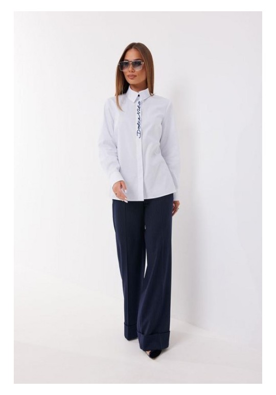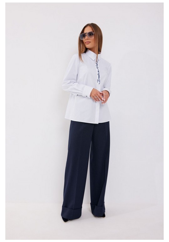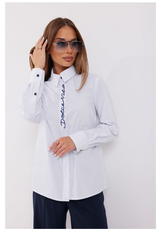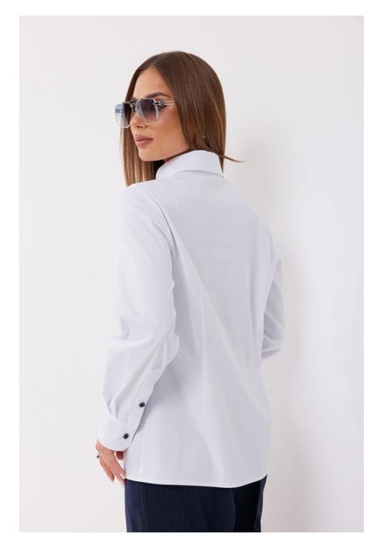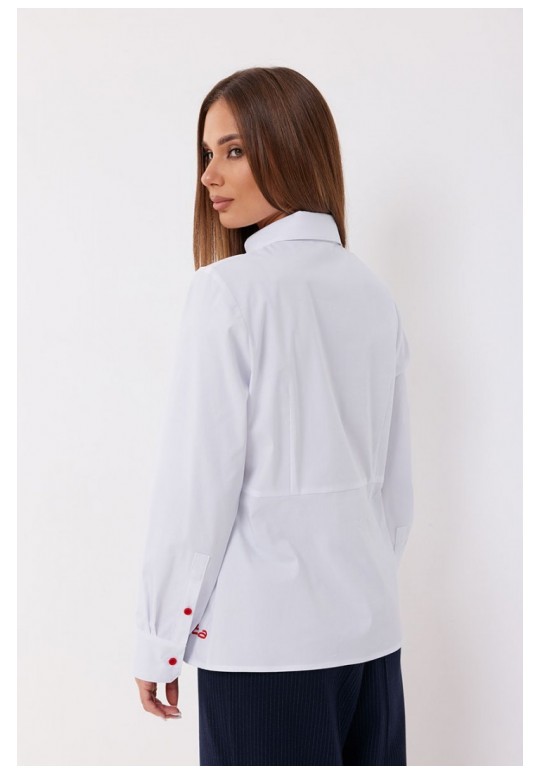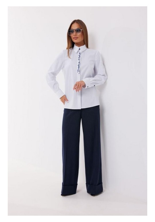 Блузка полуприлегающего силуэта. Застёжка по переду потайная на петли и пуговицы. По планке переда - вышивка. Воротник рубашечный. Рукав прямой на манжете. Манжета с застёжкой на петлю и пуговицу. Длина рукава 62 см. 44 р-р: ОГ - 100 см., ОТ - 92 см., ОБ - 103 см. 46 р-р: ОГ - 104 см., ОТ - 96 см., ОБ - 107 см. 48 р-р: ОГ - 108 см., ОТ - 100 см., ОБ - 111 см. 50 р-р: ОГ - 112 см., ОТ - 104 см., ОБ - 115 см. 52 р-р: ОГ - 116 см., ОТ - 108 см., ОБ - 119 см.